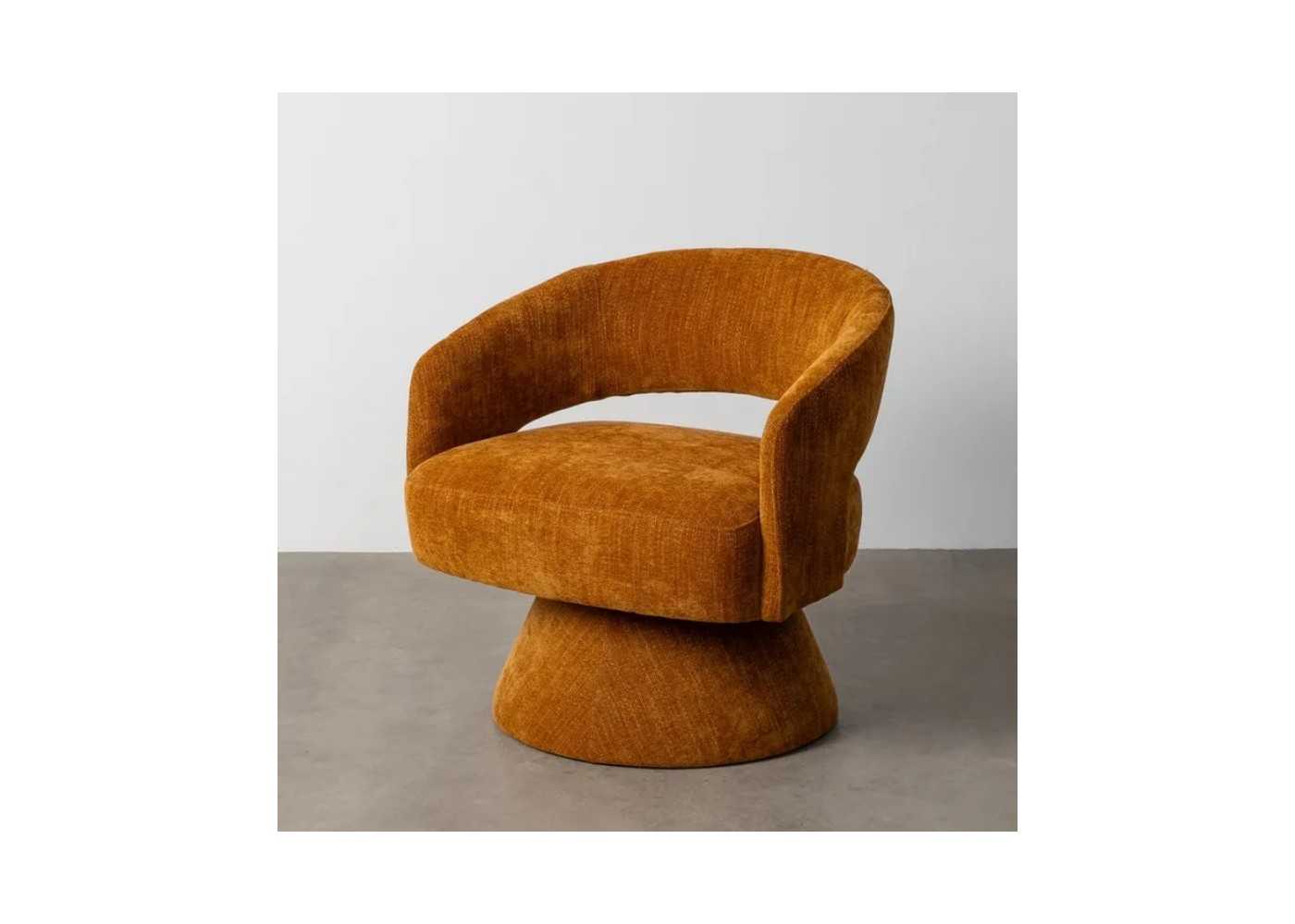 360° swivel armchair with modern design armrests and rounded lines, upholstered in ochre-colored velvet.