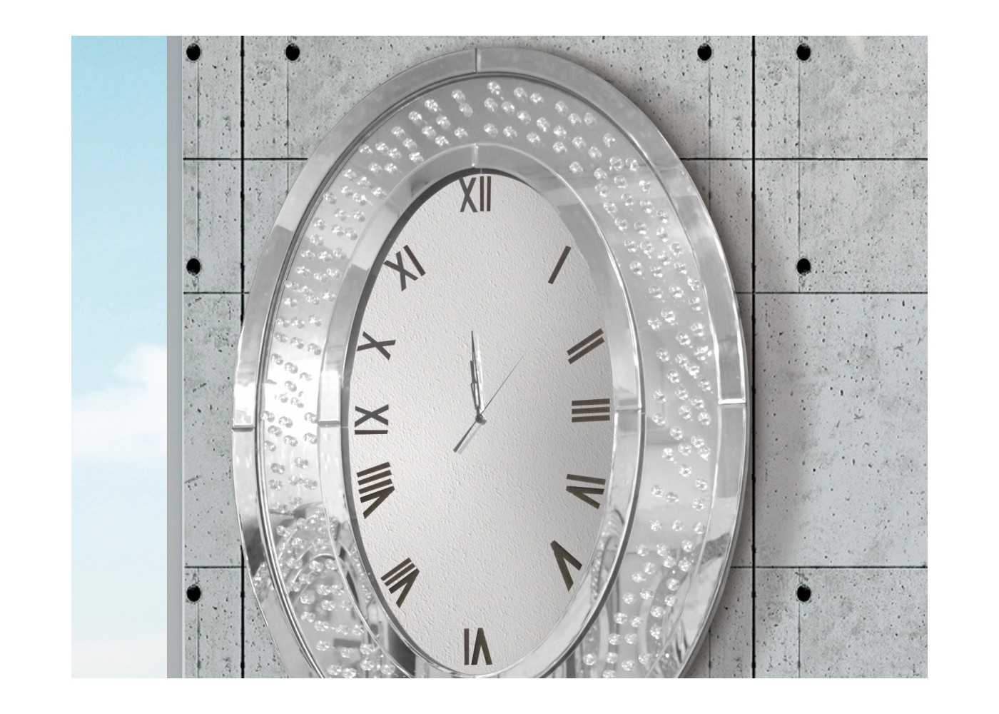 Elegant oval-shaped wall clock. Made with mirrors and small crystals.