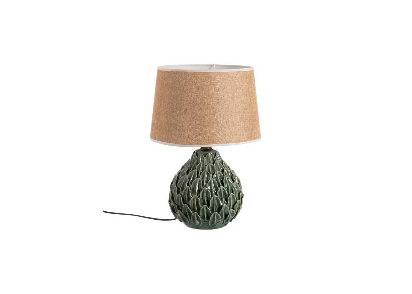 Elegant table lamp with ceramic base in the shape of leaves and green tones.