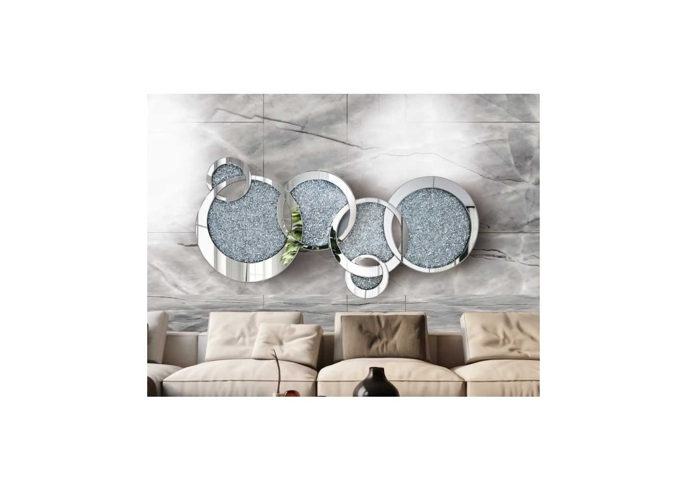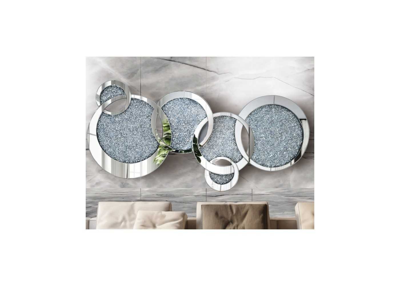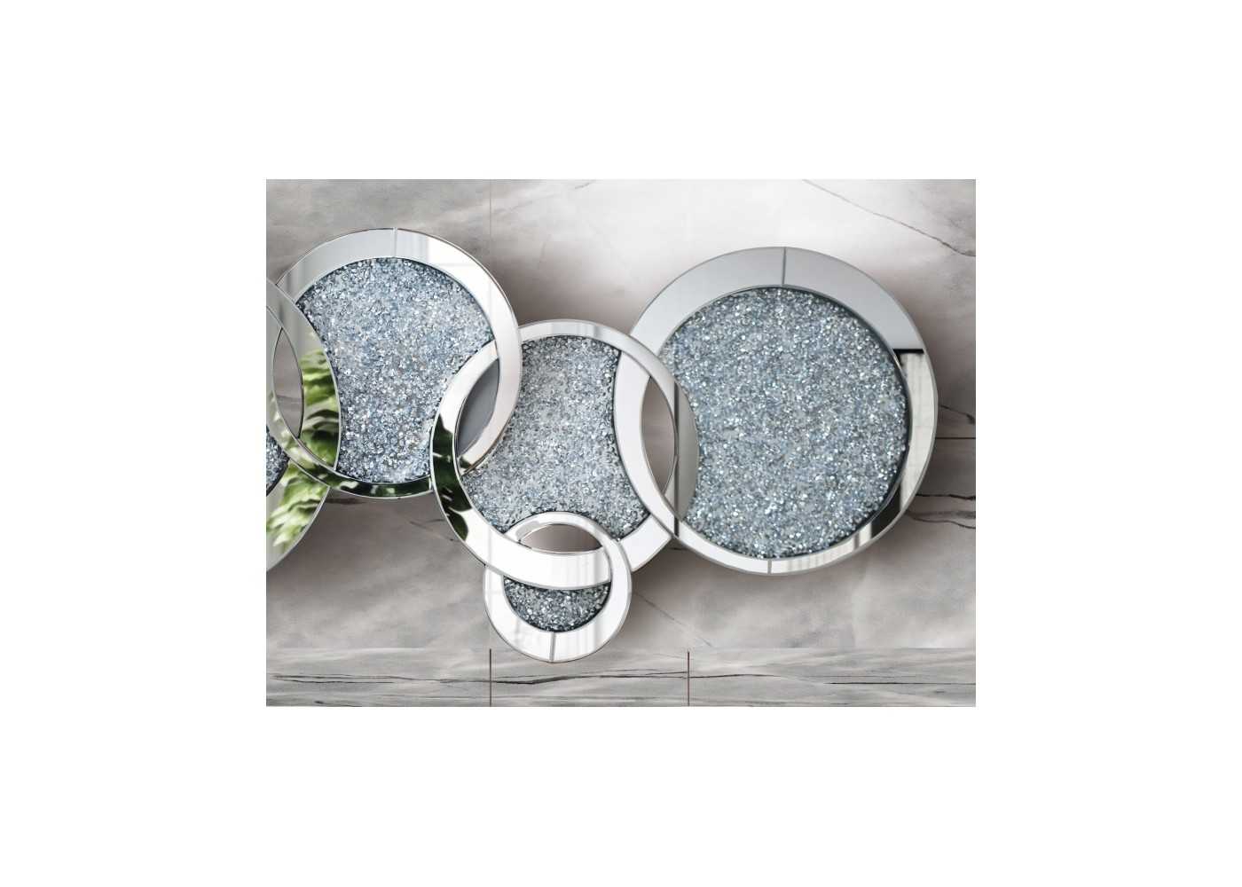 Original and elegant mirror made up of interlocking circles of different sizes, manufactured with mirror frames and interiors decorated with small crystals.