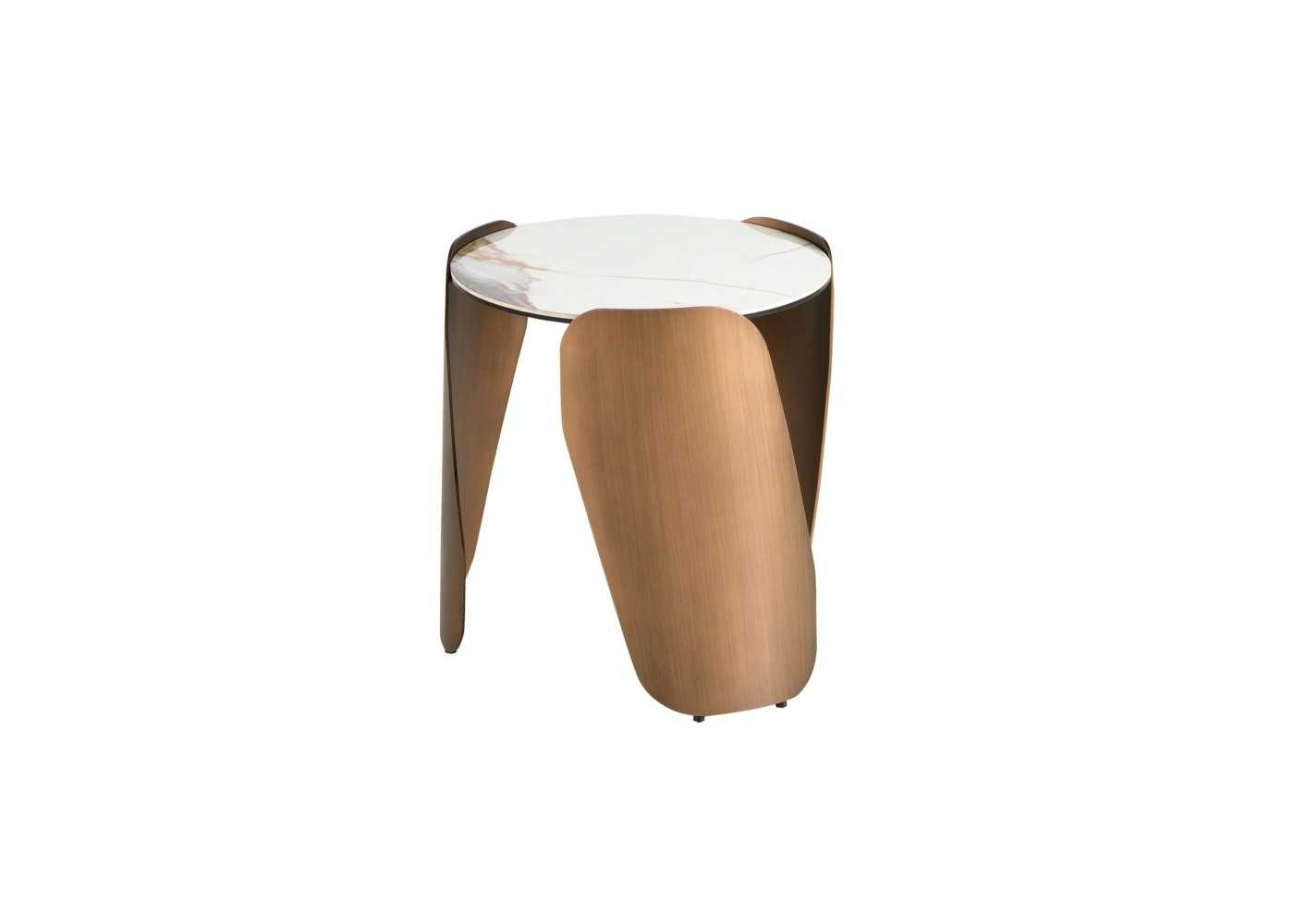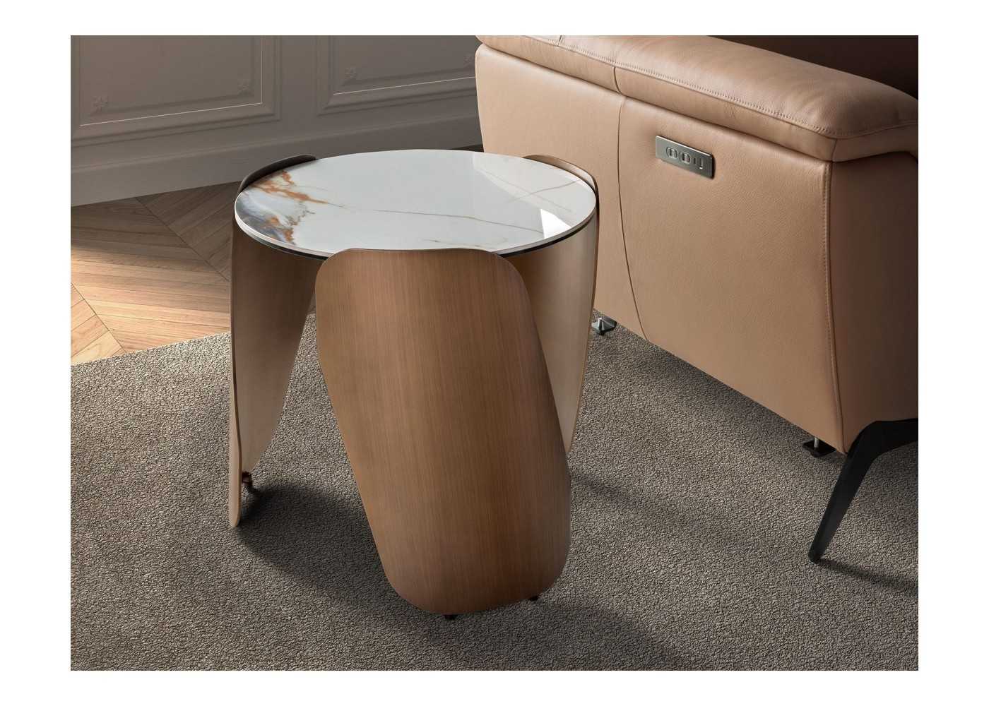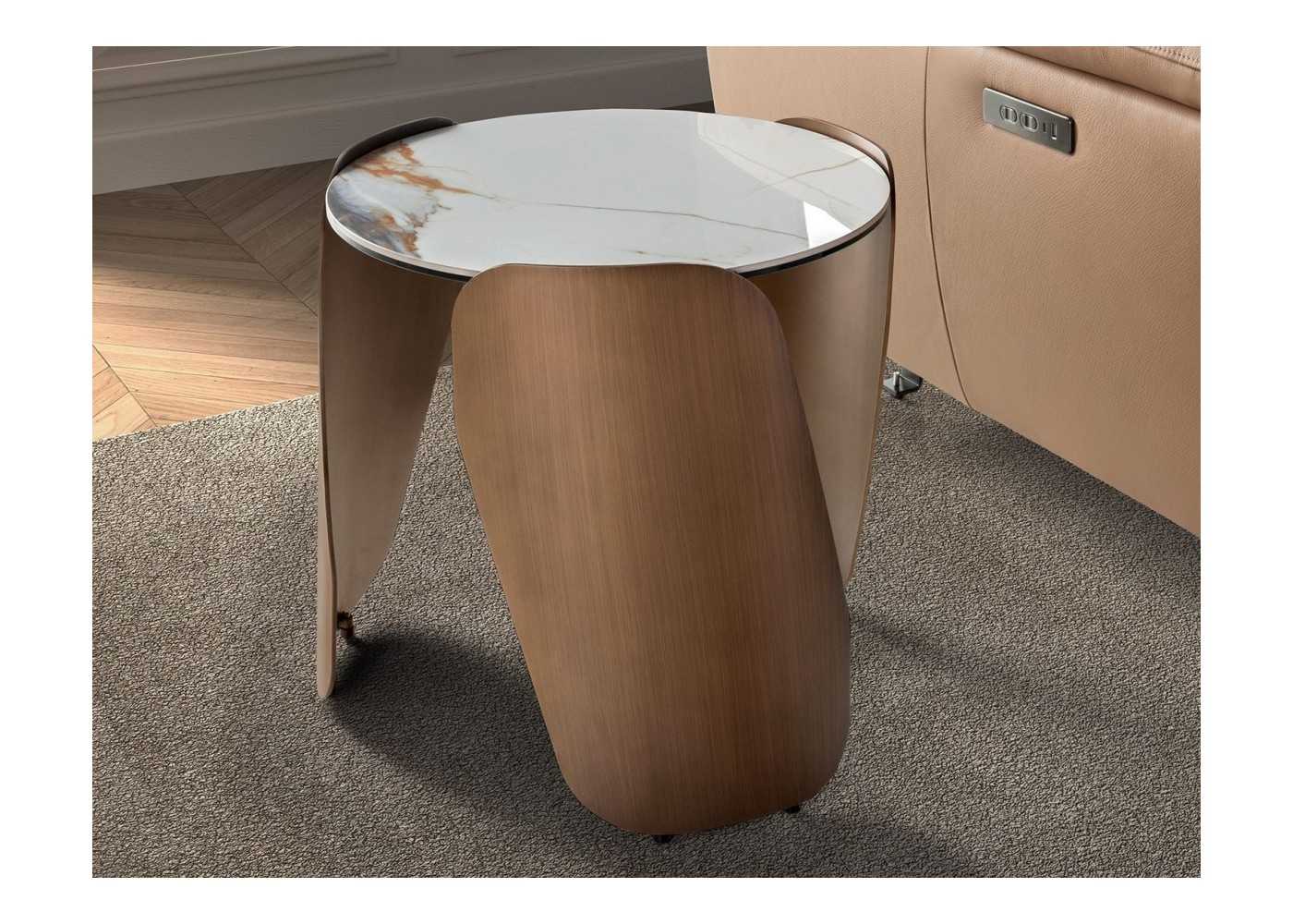 Original round corner table with a glossy white porcelain marble top featuring grey veining and rust details. Designer base in bronze-colored stainless steel.