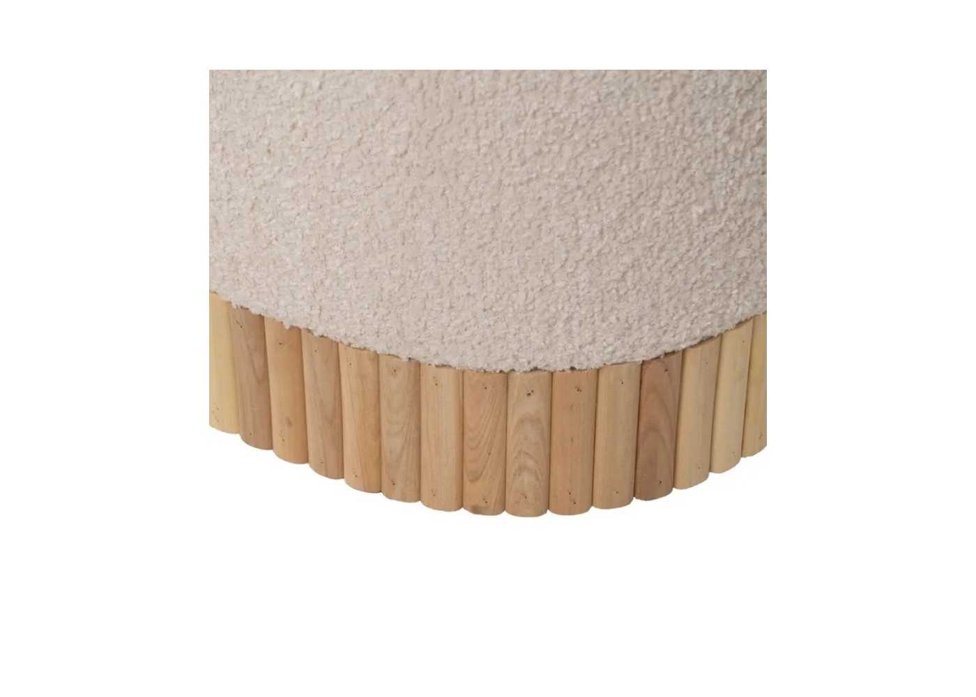 An elegant set consisting of two oval poufs with storage compartments in different sizes. Upholstered in cream-colored curly fabric with details on the slatted wooden base.