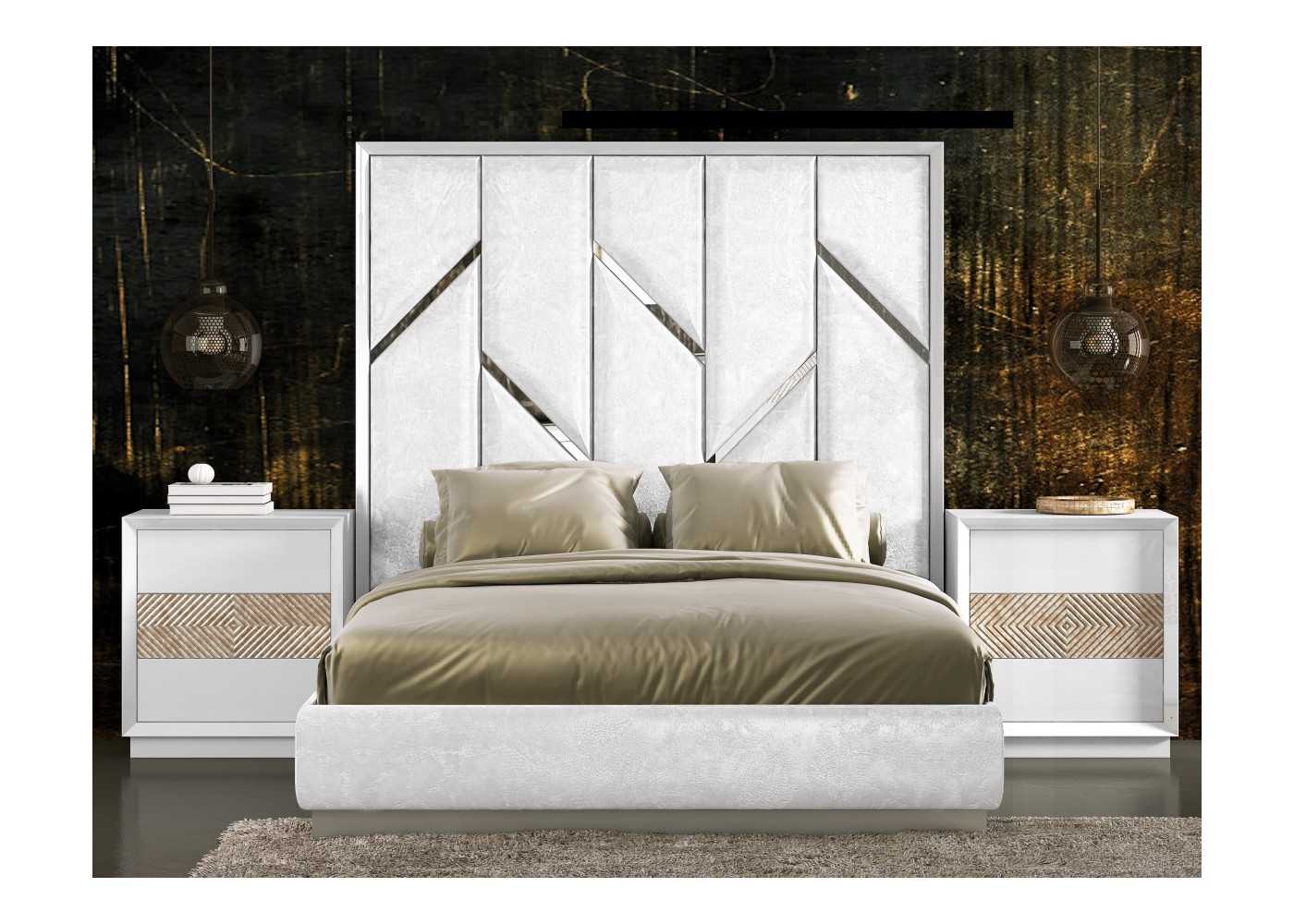 Elegant high headboard with a pure white matt lacquer finish and upholstered with white PAPILLON velvet panelling with mirror-effect methacrylate details.