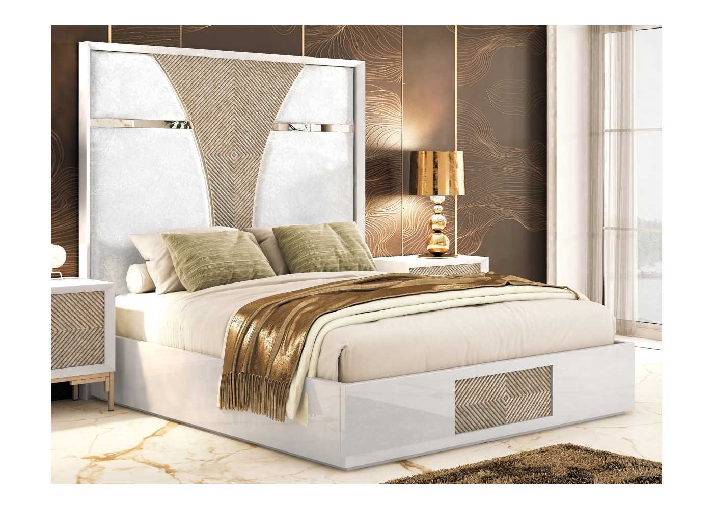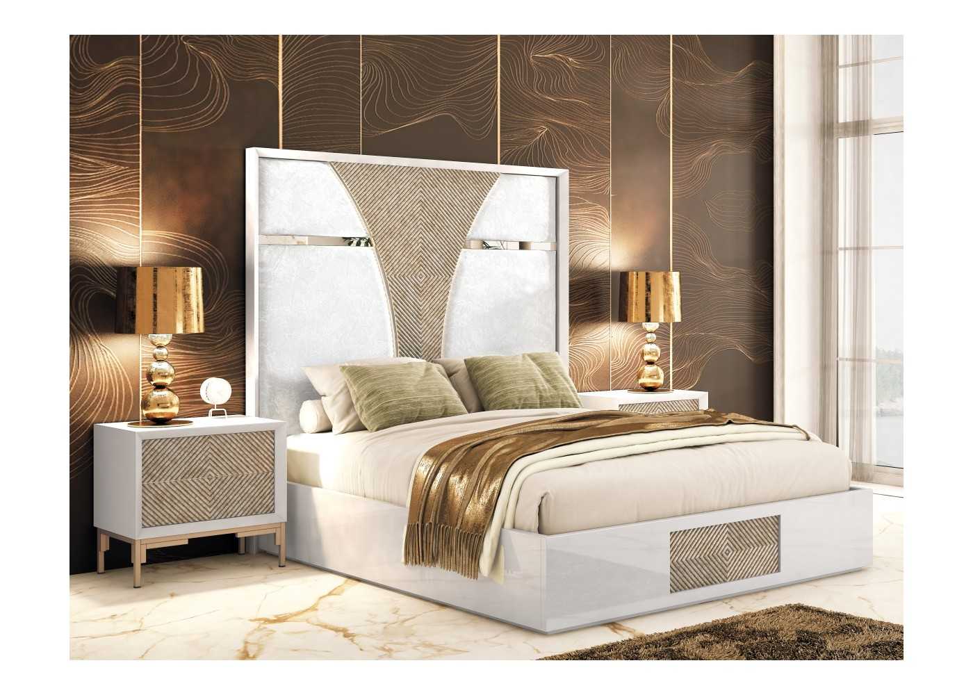 Original and elegant bed complete with high headboard lacquered in pure white matt, upholstered in PAPILLON velvet with mirror-effect methacrylate details and central diamond-patterned ceiling light in champagne marbled finish with integrated LED light. Lacquered bed base with diamond-patterned detail in champagne marbled finish.