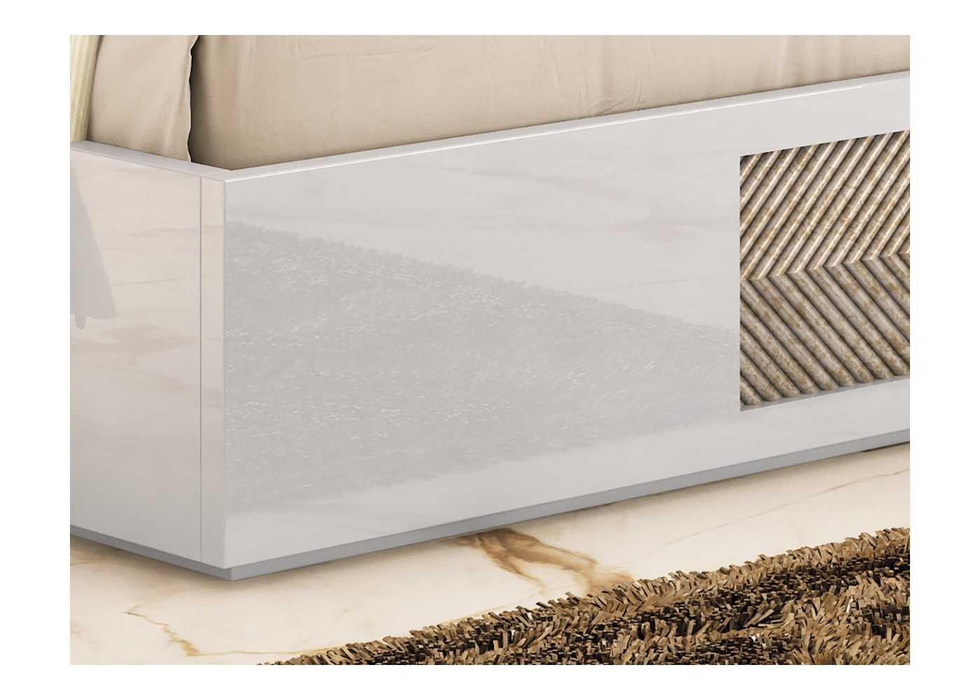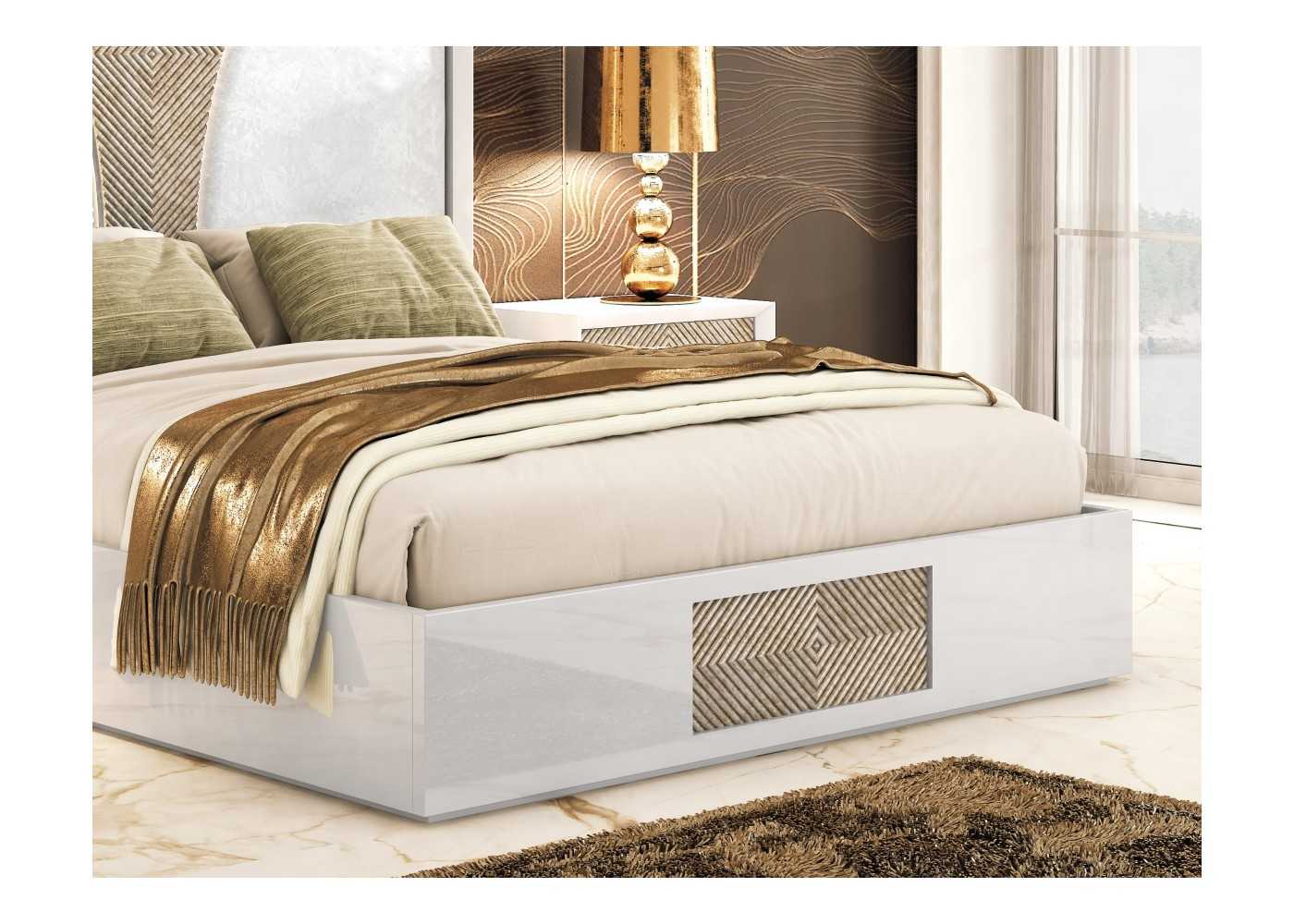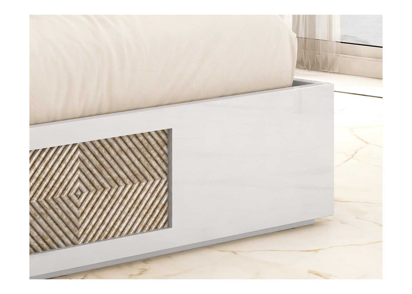 Bed base with 8 cm skirting board lacquered to match in pure matt white with central diamond detail in marbled champagne colour. Silver marbling available at no extra cost.