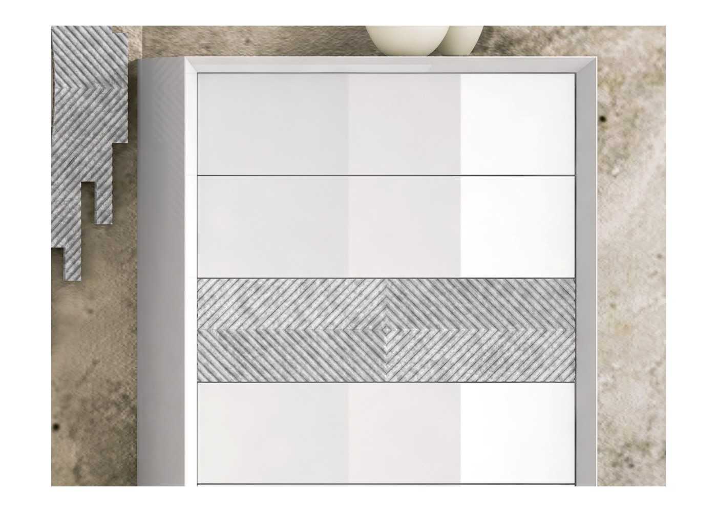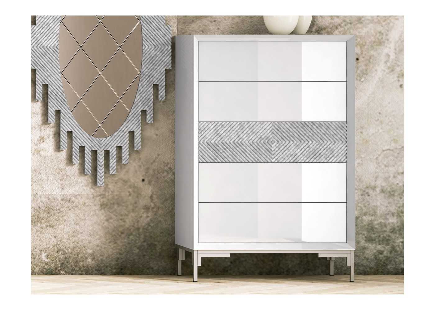 Elegant chiffonier of drawers with 5 drawers and a modern design. Lacquered in pure white with detailing on the front of the central drawer. Silver lacquered steel base.