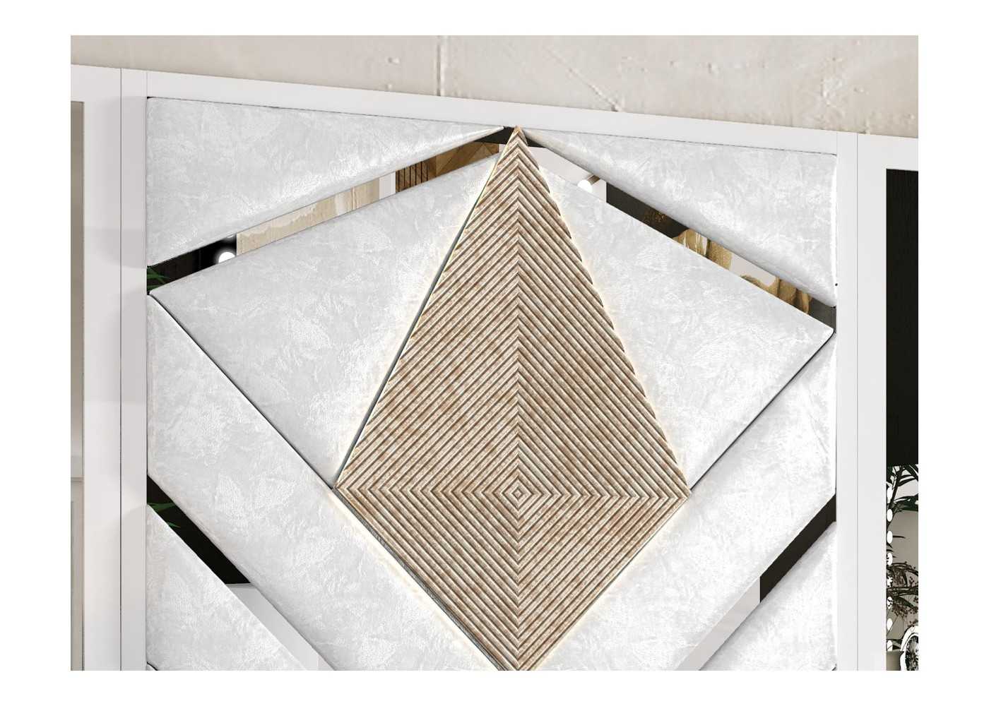 Central panels with an original geometric design upholstered in white PAPILLON velvet with original details of 5 mm thick, 25 mm wide mirror-effect methacrylate sheets. Central panel with an original diamond design in marbled champagne colour. Silver marbling available at no extra cost.