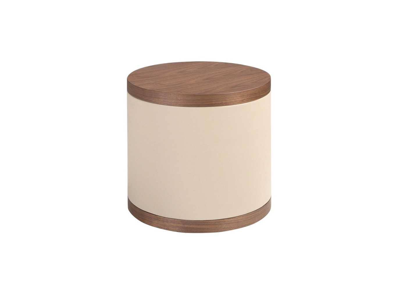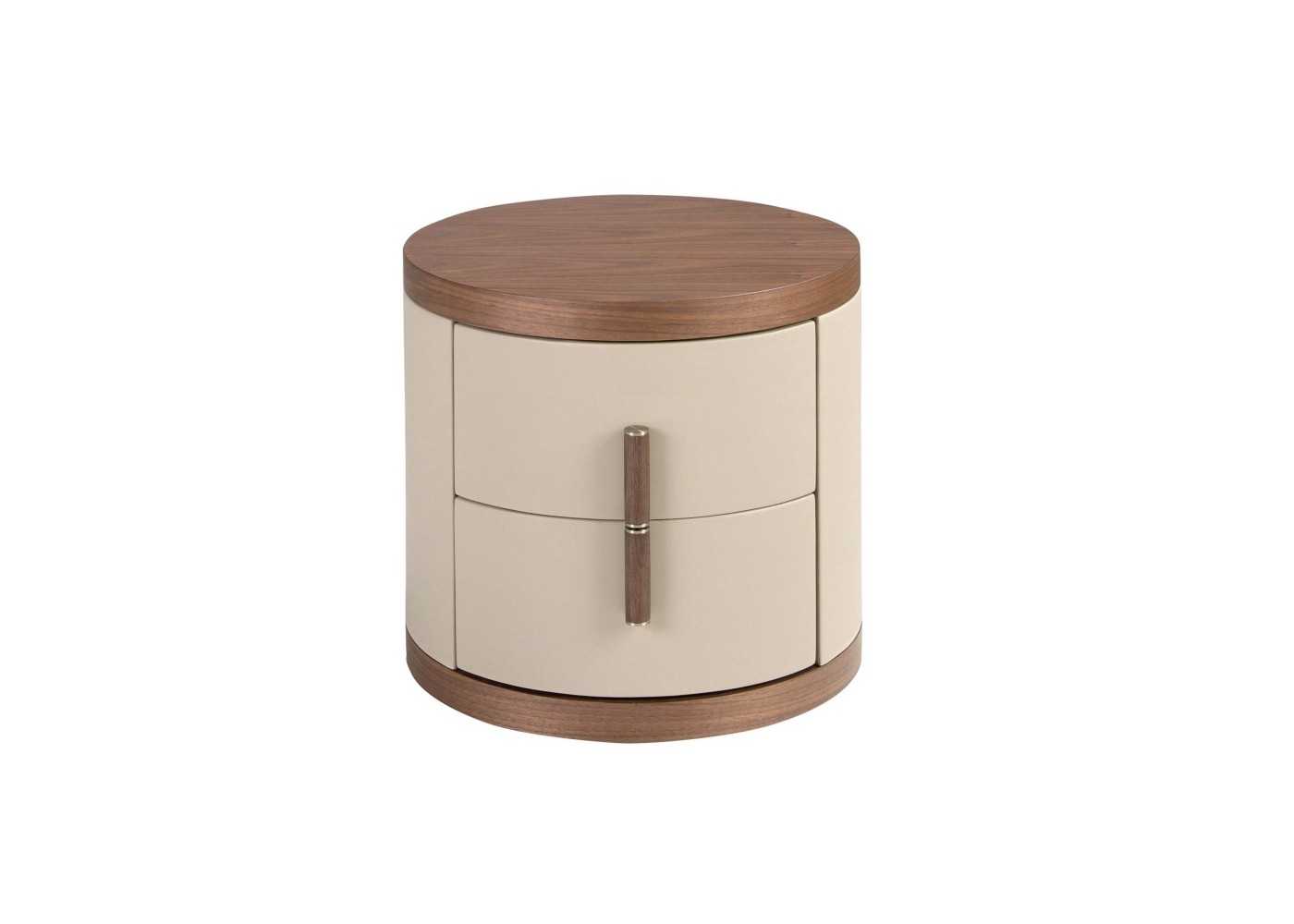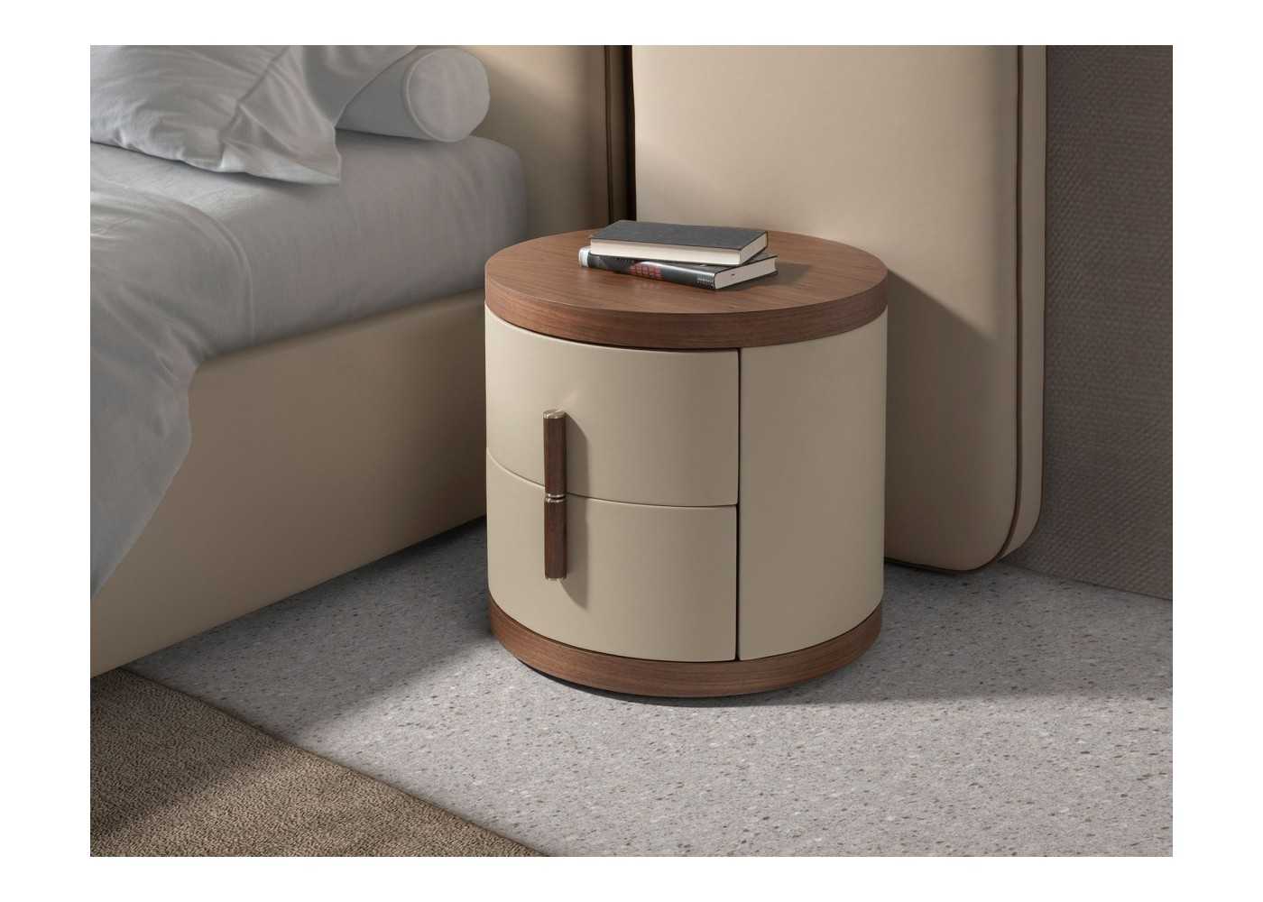 Elegant round bedside table with 2 drawers and modern design upholstered in synthetic leather with plinth and solid ash wood top veneered in natural walnut.