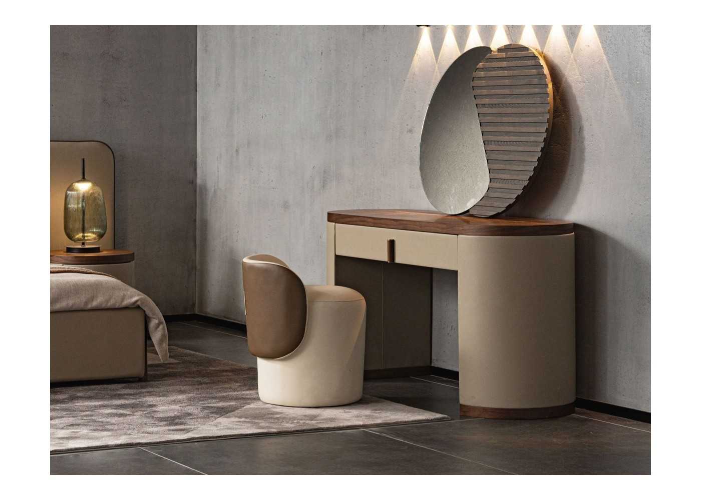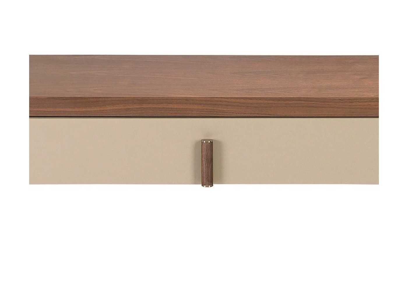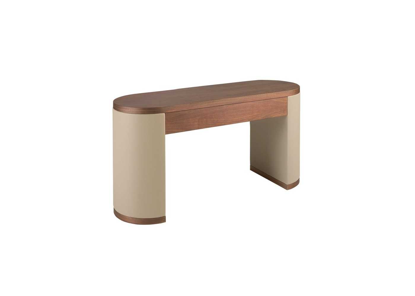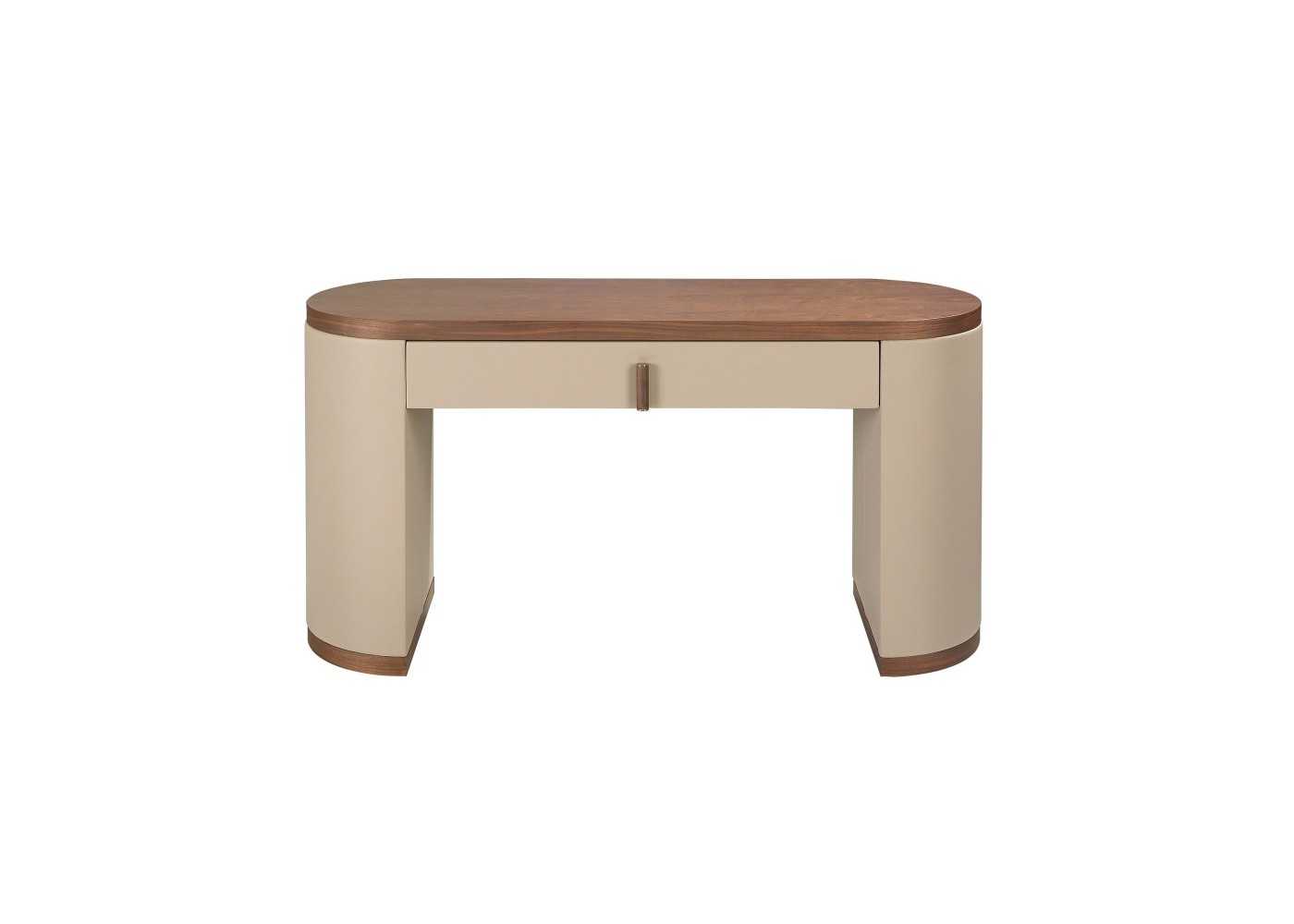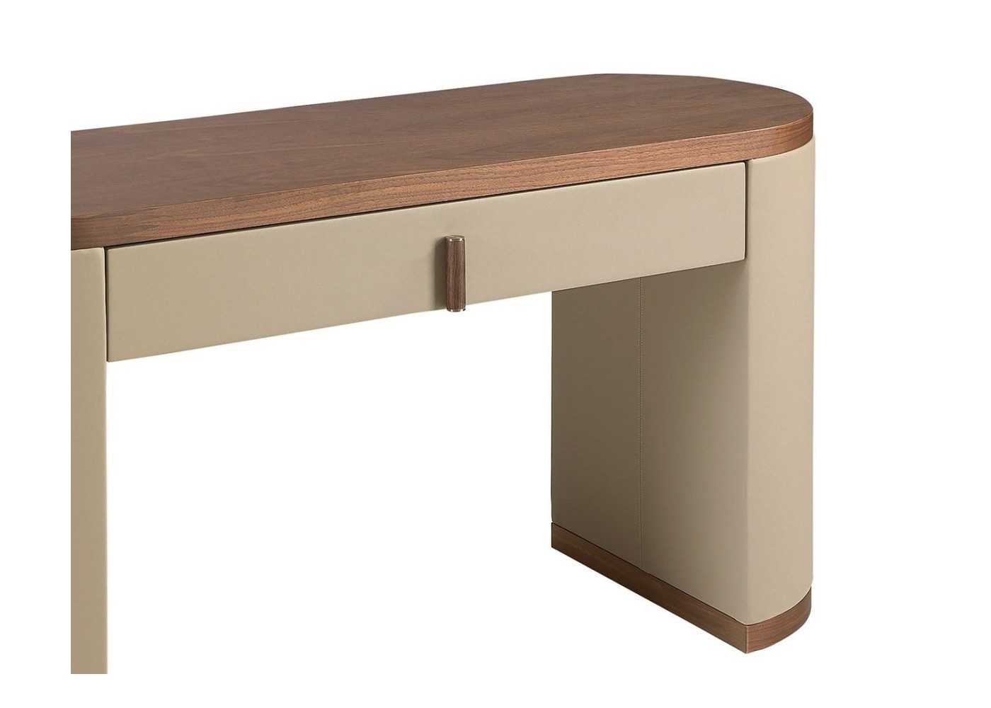 Modern design desk/dressing table upholstered in mink-colored synthetic leather with one drawer, top and plinths of solid ash wood base columns veneered in natural walnut.