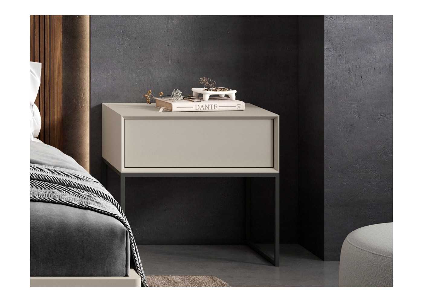 Bedside table with 1 drawer, lacquered with mitered edges and base of graphite-colored lacquered stainless steel.