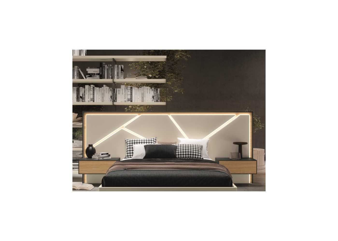 Oak headboard with lacquered panels, lacquered frame, integrated LED light and floating bedside tables with 1 drawer with lacquered structure and oak drawer fronts.