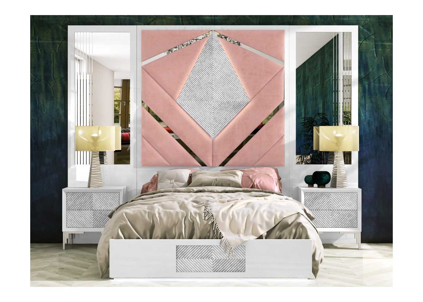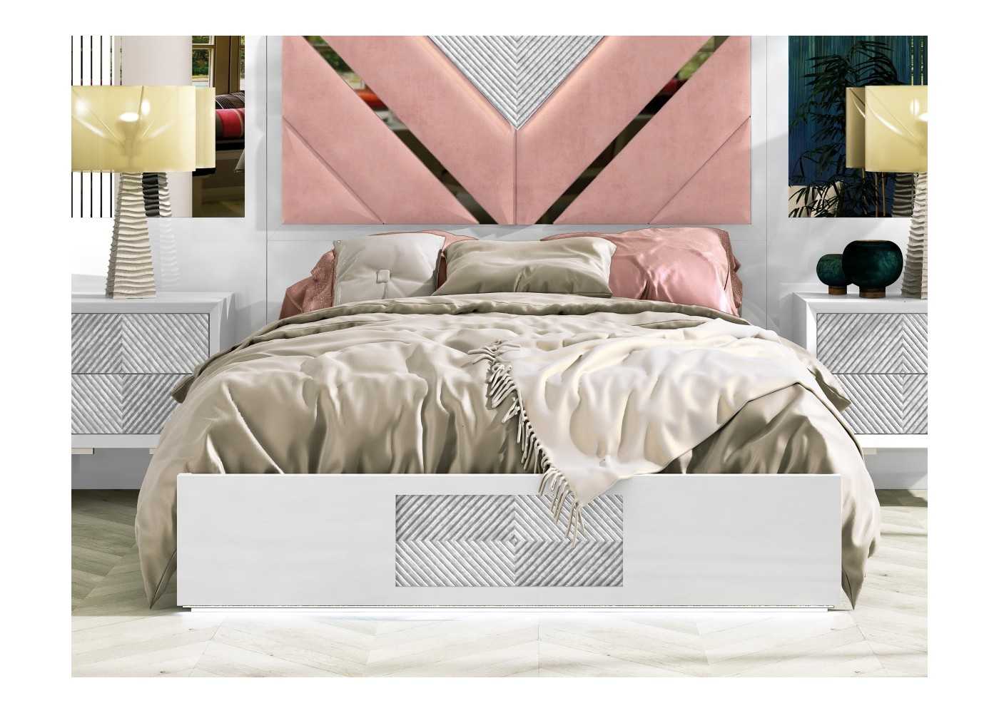 Striking complete bed with XXL headboard in pure white matt lacquer with mirrored side panels. Central panel lacquered and upholstered with an original design in panther pink PAPILLON velvet with mirror-effect methacrylate details, central panel details in silver marbled diamond pattern and integrated LED lighting. Lacquered bed base with diamond detail in a silver marbled finish and LED light.