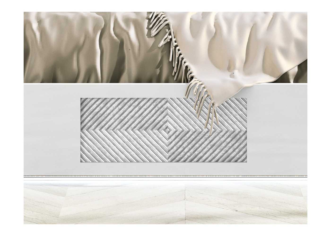 Bed base with 8 cm skirting board lacquered to match in pure matt white with central diamond detail in silver marbled colour. Champagne marbled finish available at no extra cost. LED light with sensor integrated into the skirting board of the bed base.