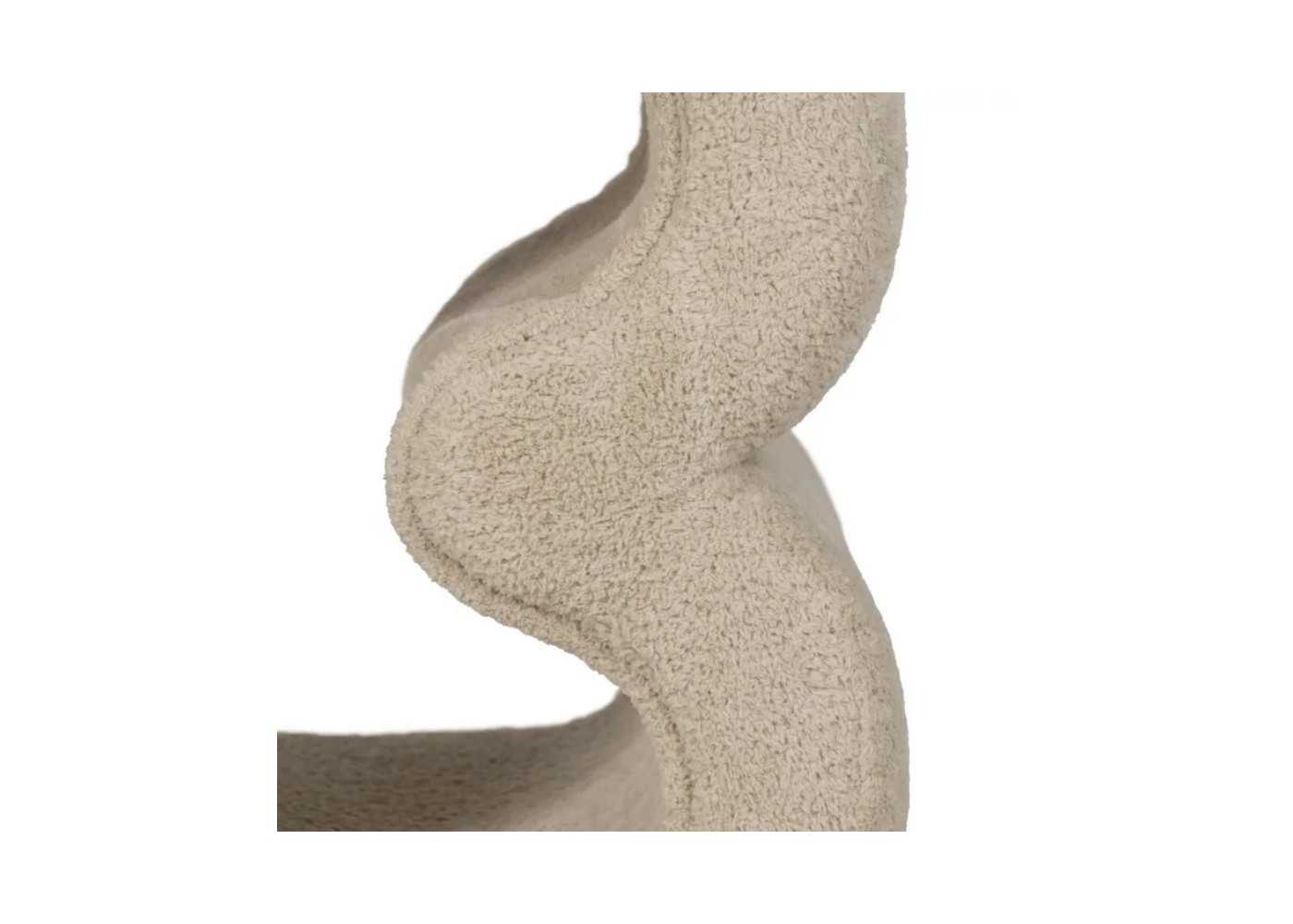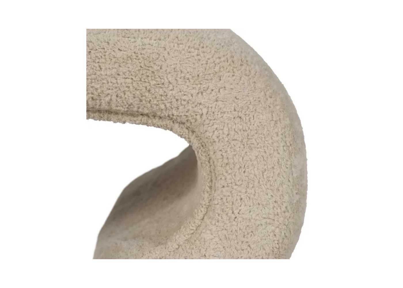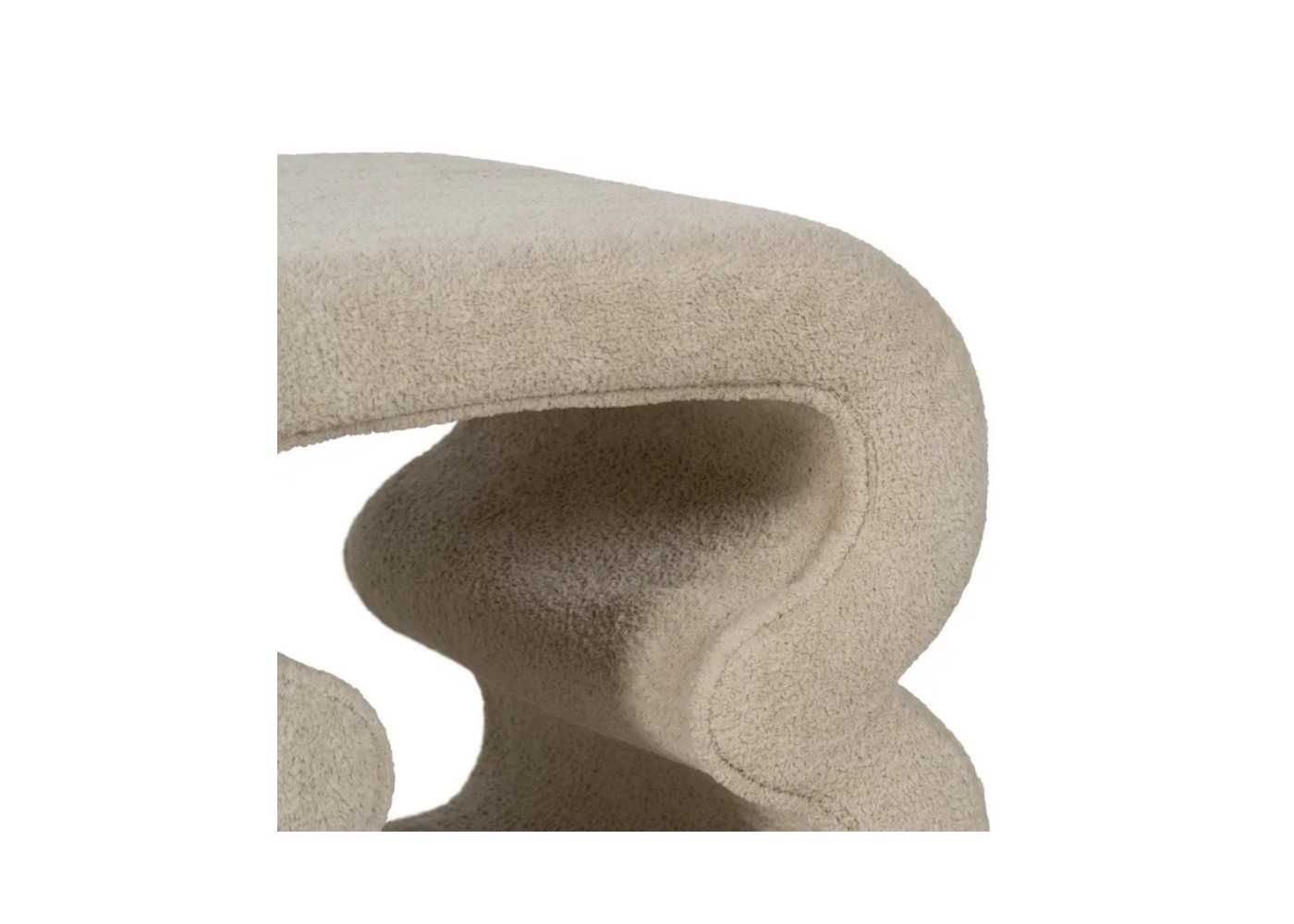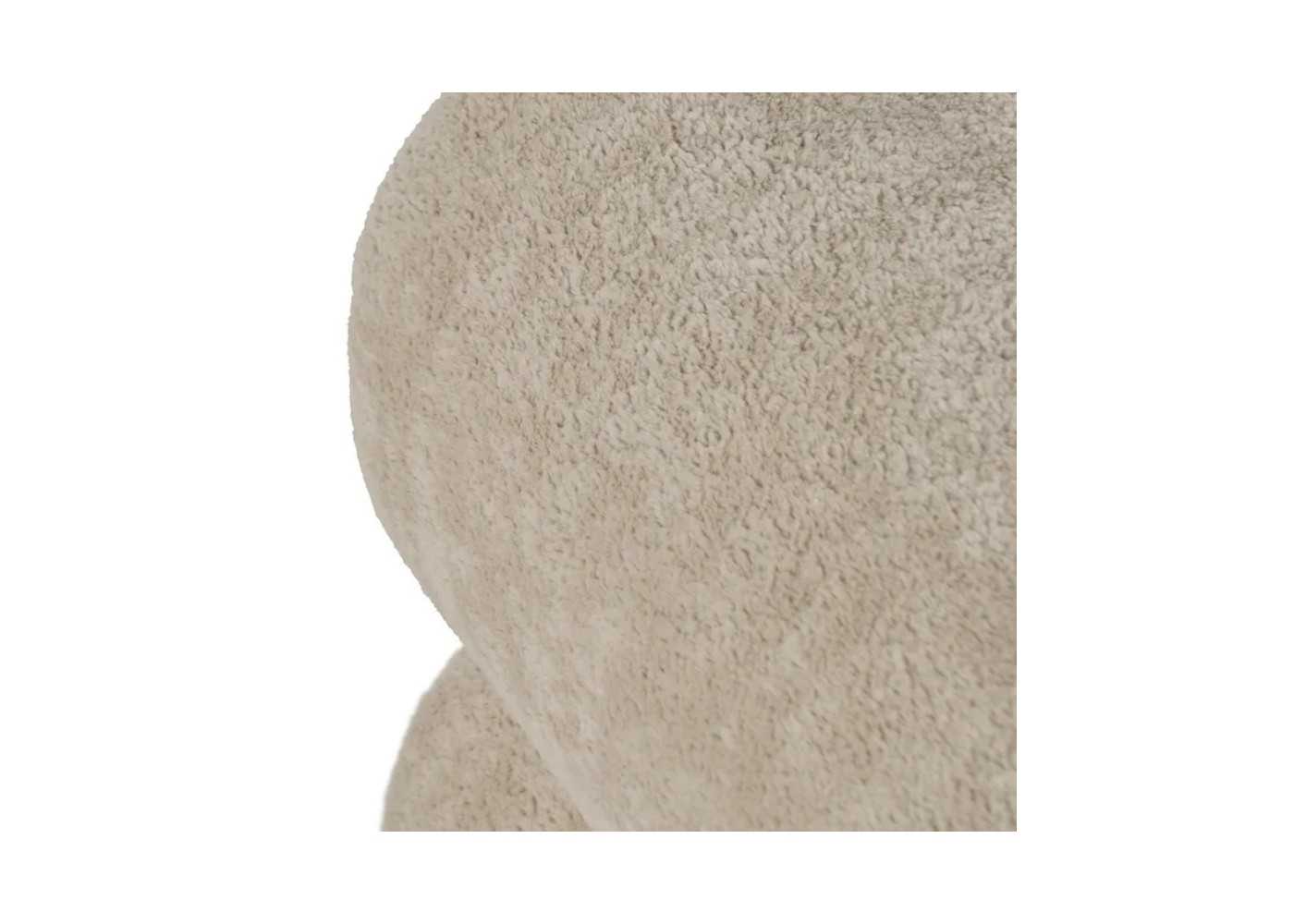 Modern design pouf made of iron and wood with beige curly fabric upholstery.