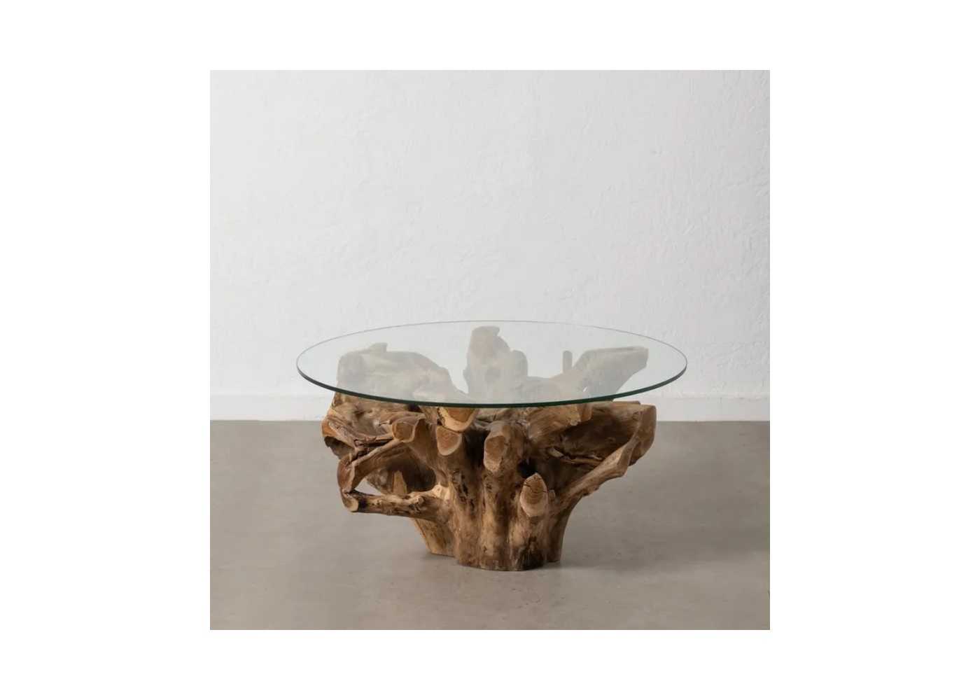 Coffee table with solid teak wood base in natural color and tempered glass top.