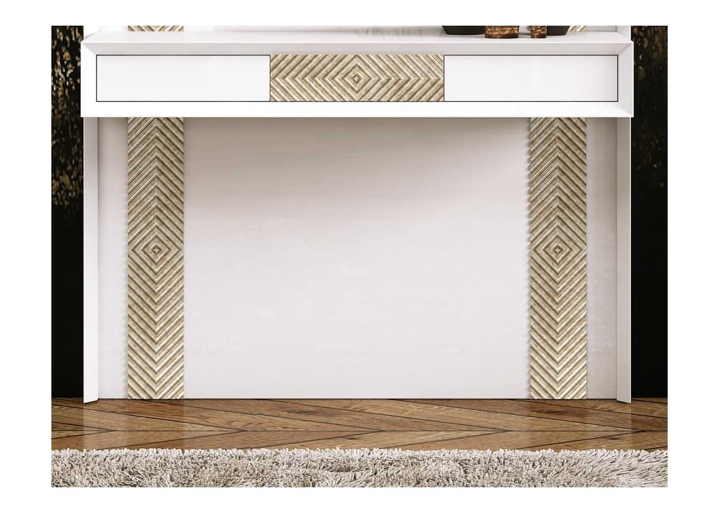 Elegant console table with 3 drawers, mirrored back, and lacquered finish. Features engraved details in a unique champagne marble design with LED lighting.