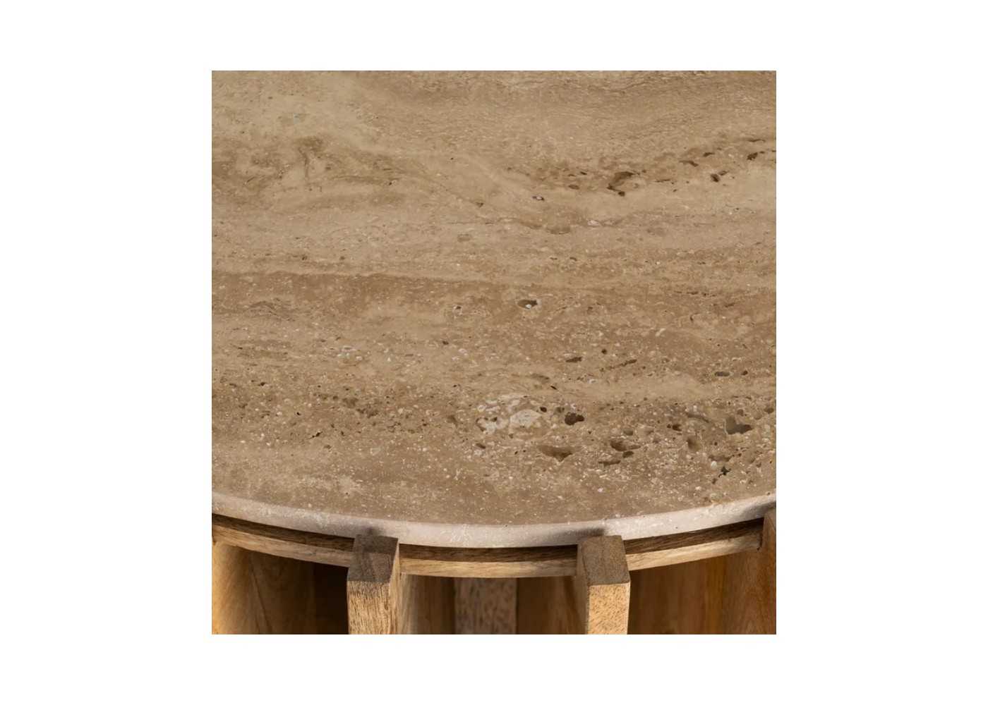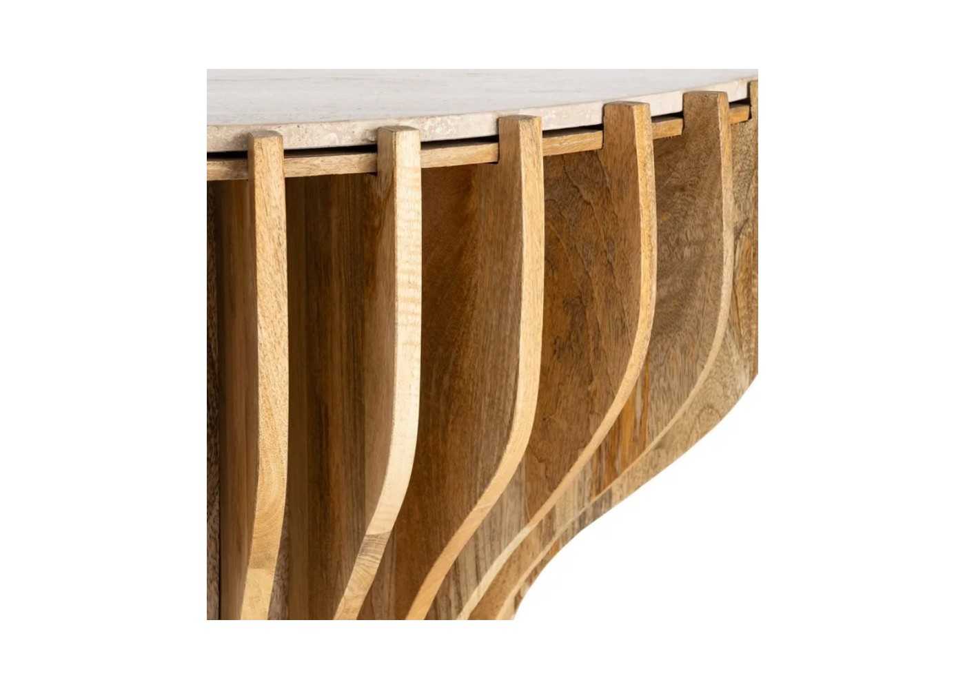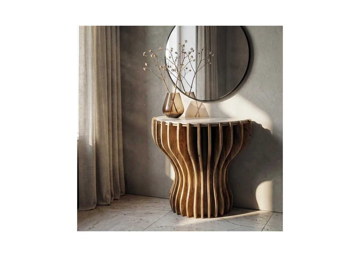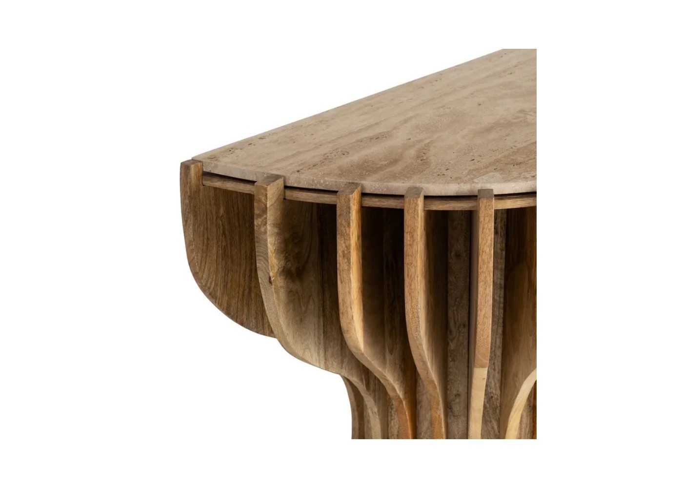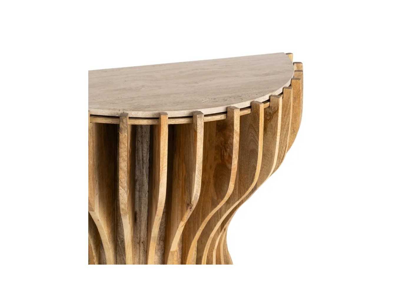 Original solid mango wood console with a light brown marble top with dark brown veining.