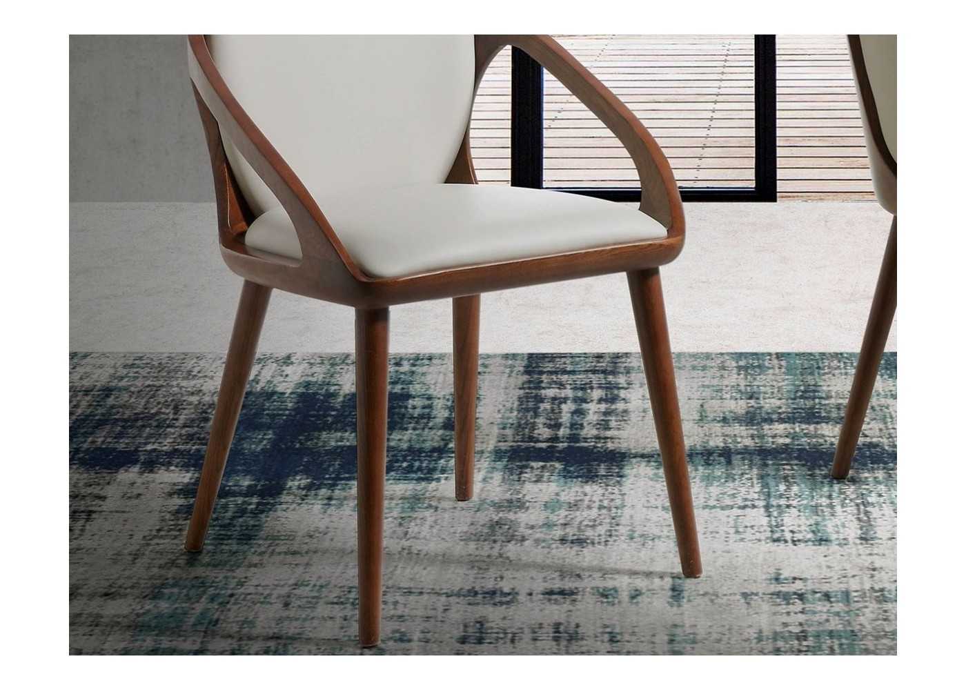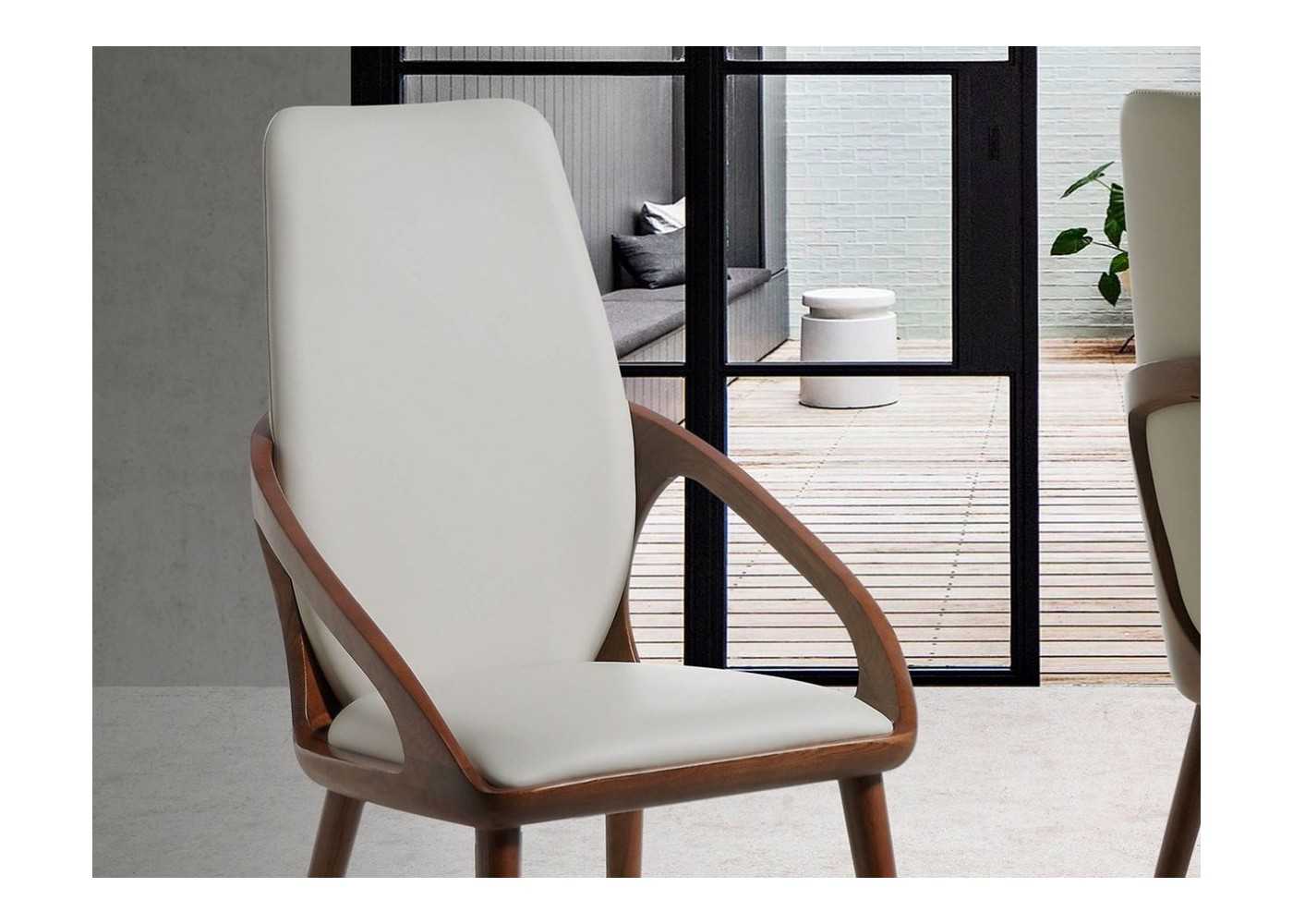 Original designer chair upholstered in cream-colored synthetic leather and with a solid walnut-colored ash wood frame.