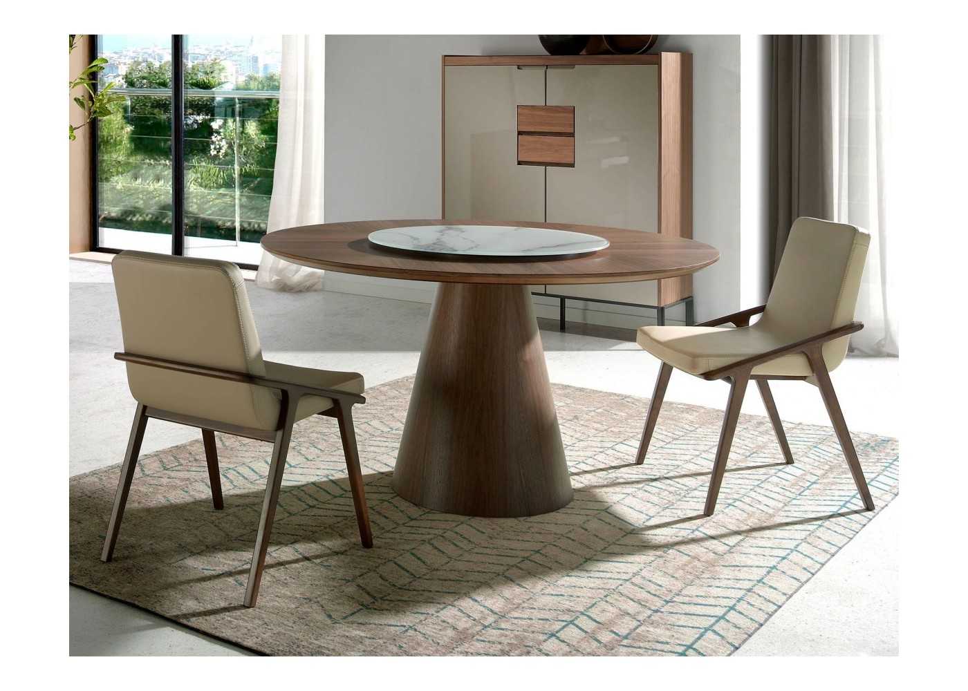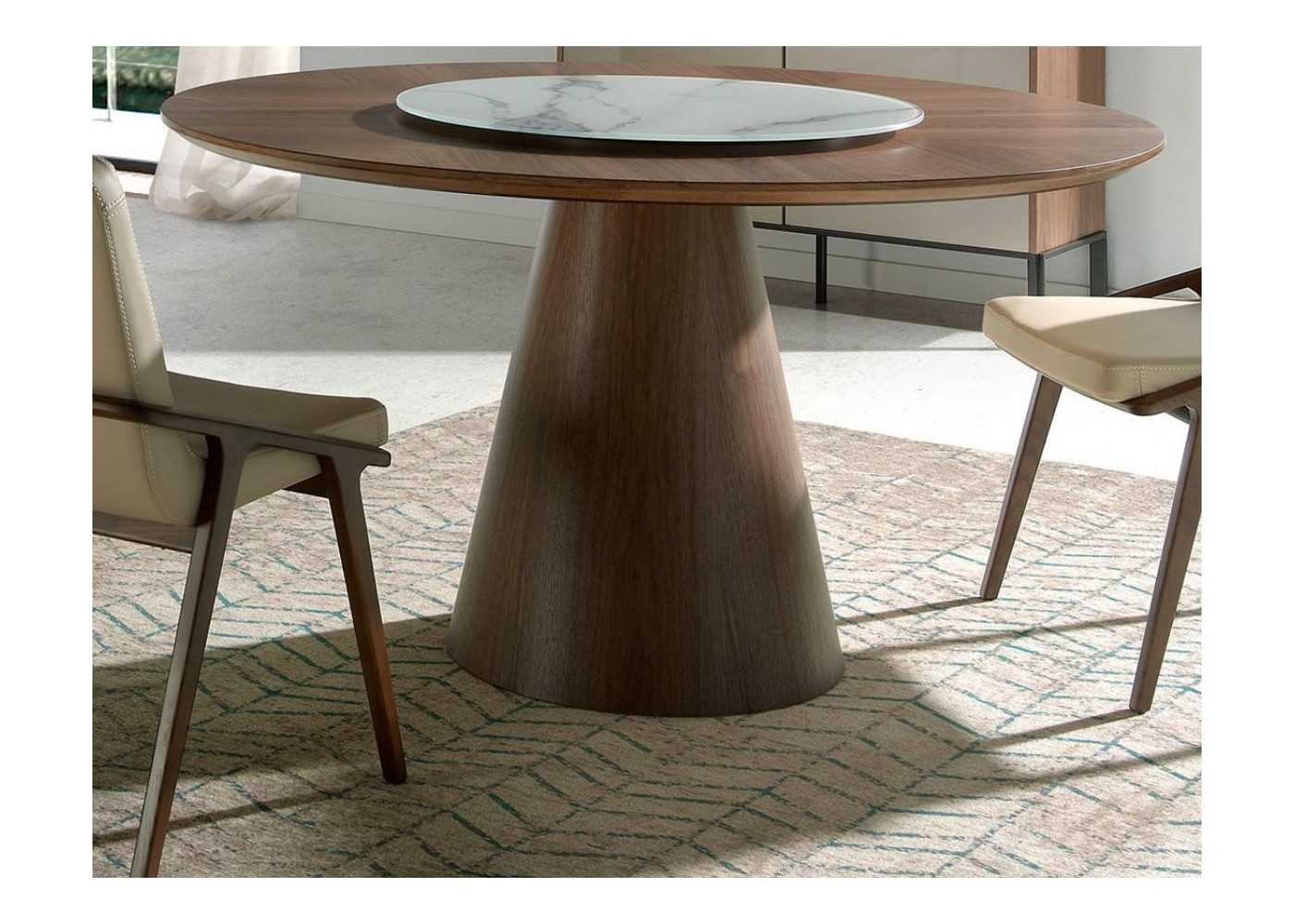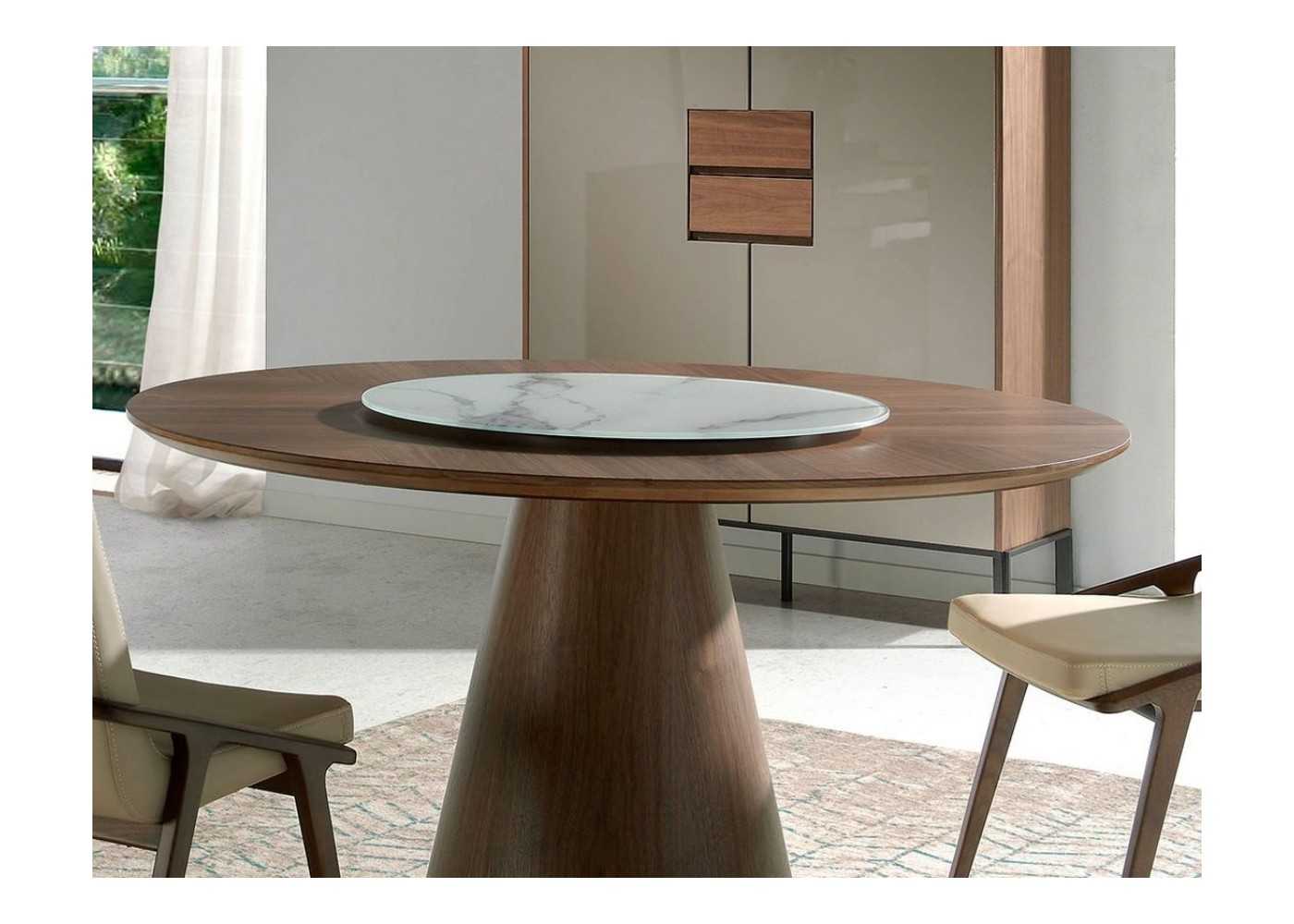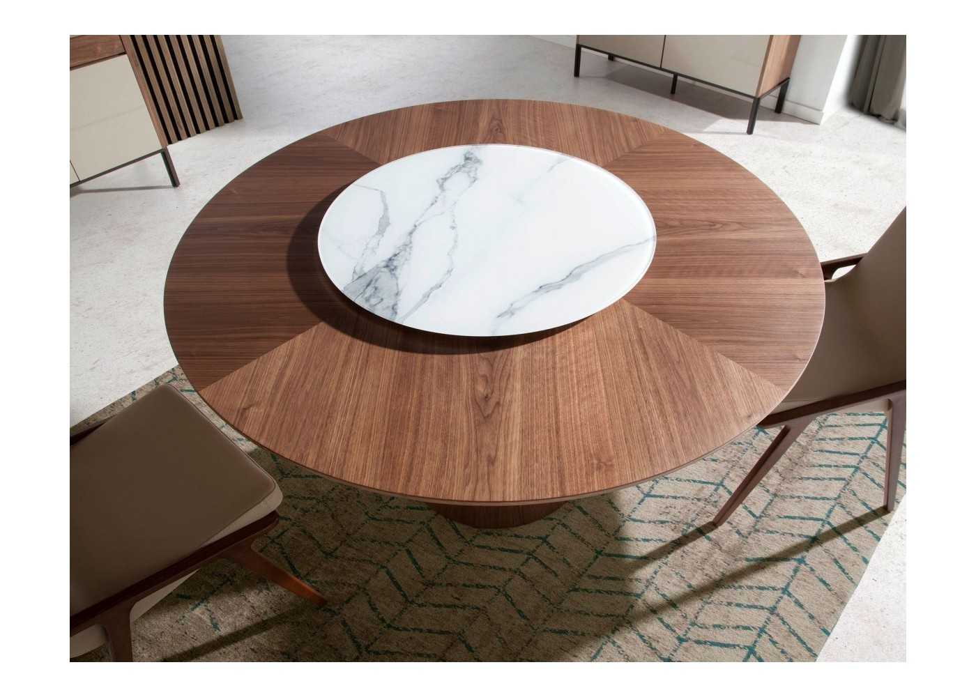 Round dining table in walnut with rotating top in white porcelain marble with gray veins.