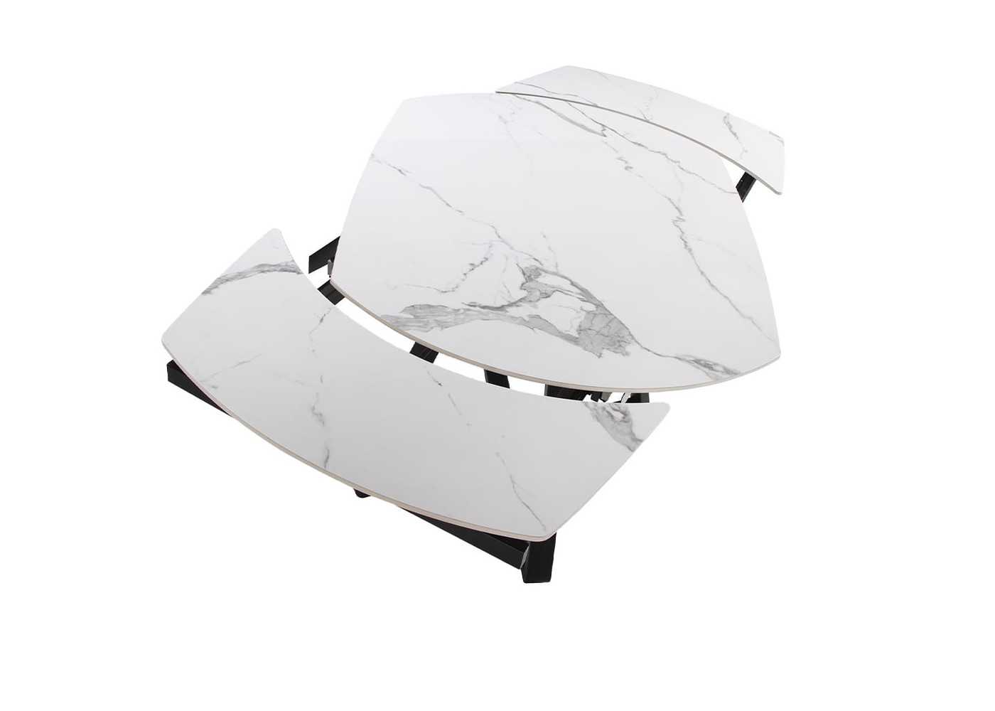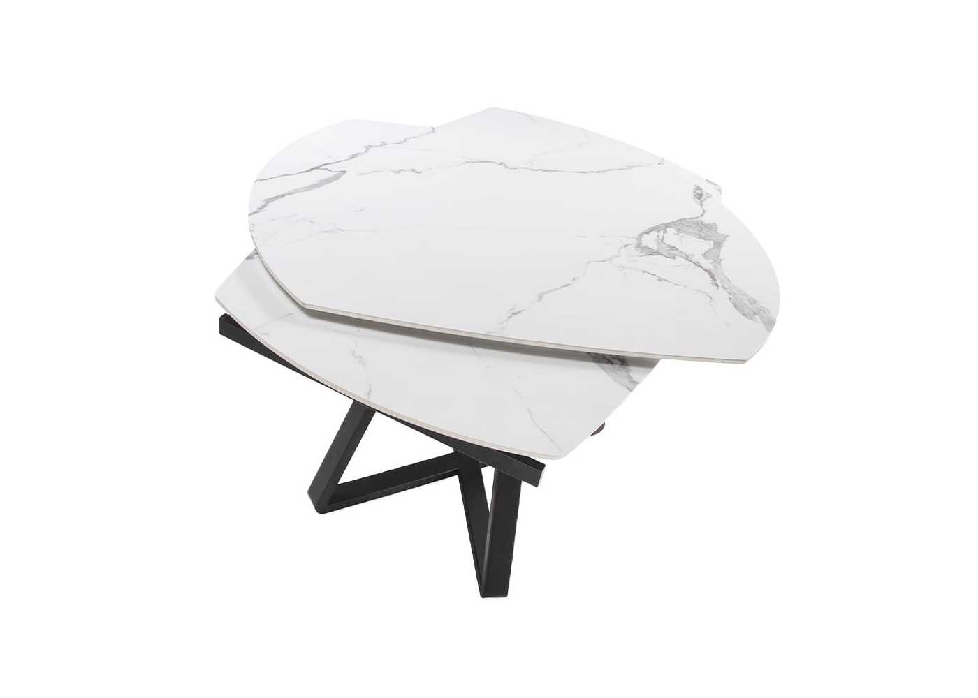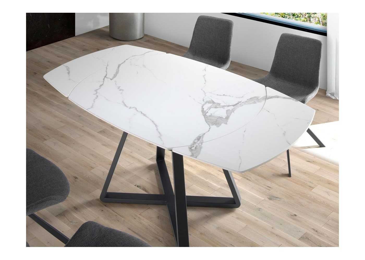Dining table with extendable top in oval barrel shape in white porcelain marble with gray veins and gloss finish. Black epoxy lacquered stainless steel base
