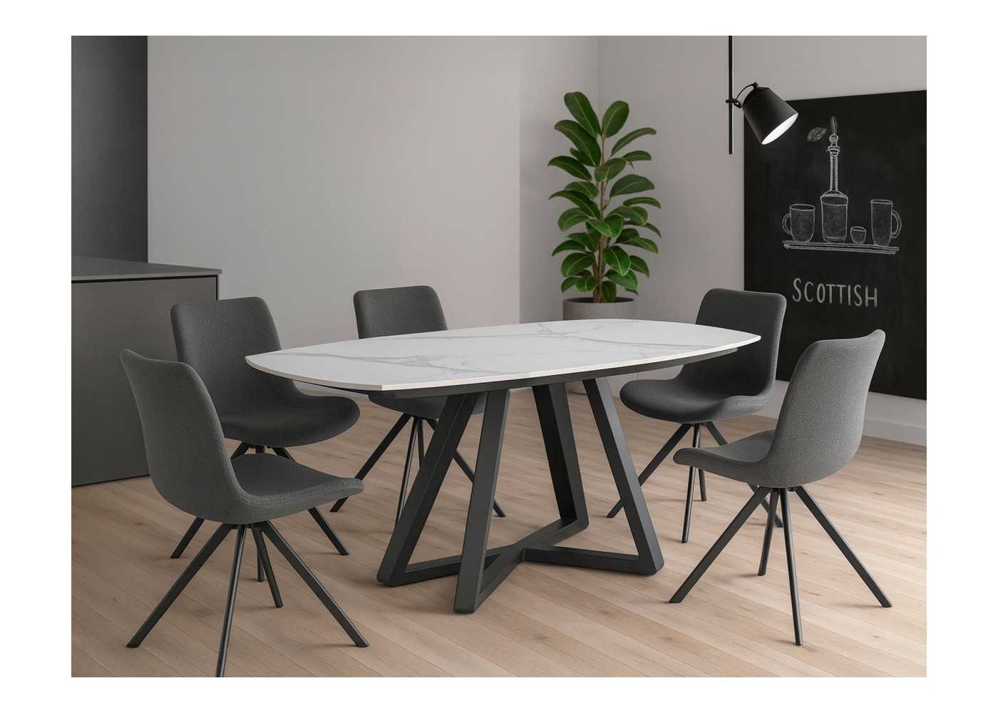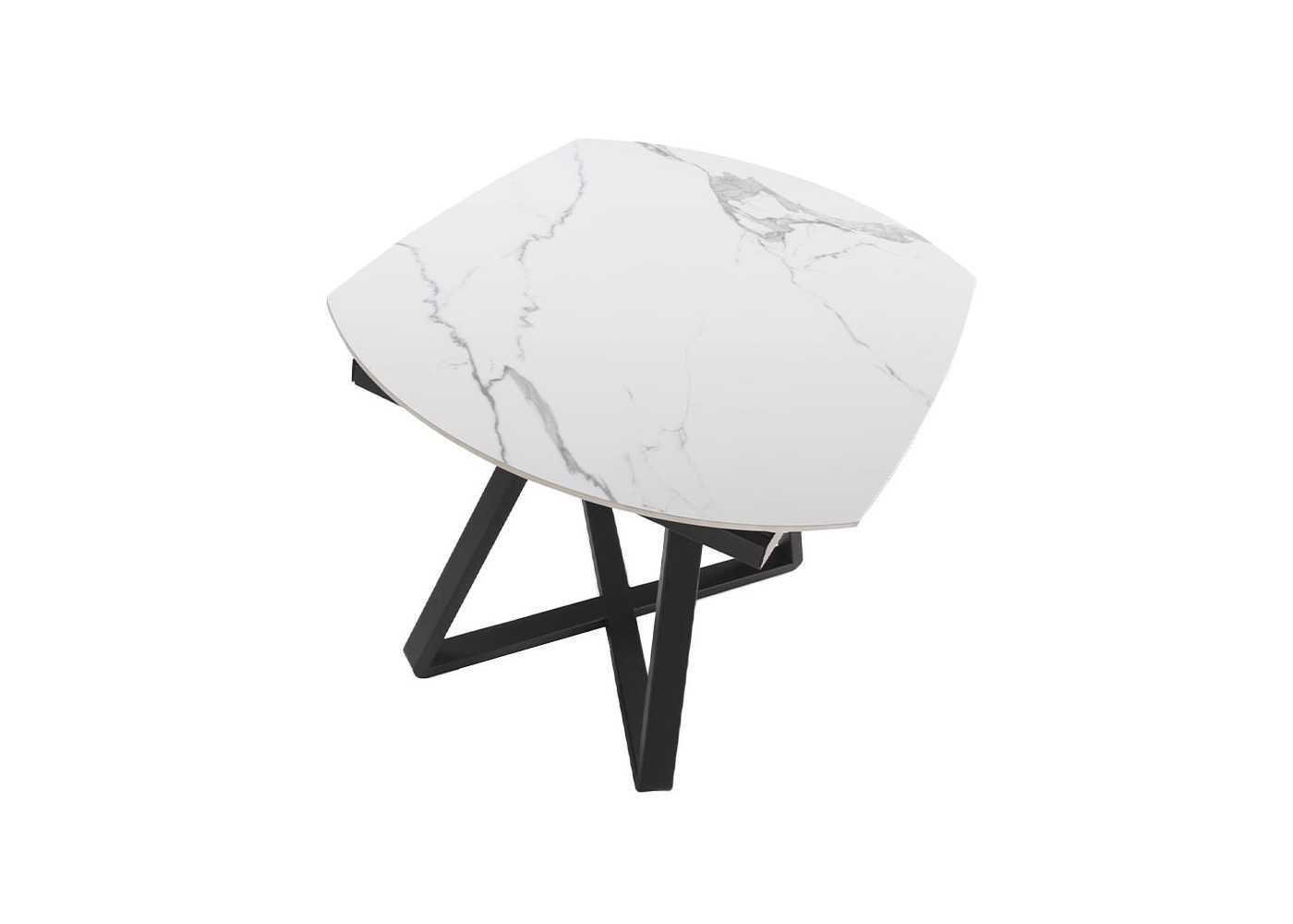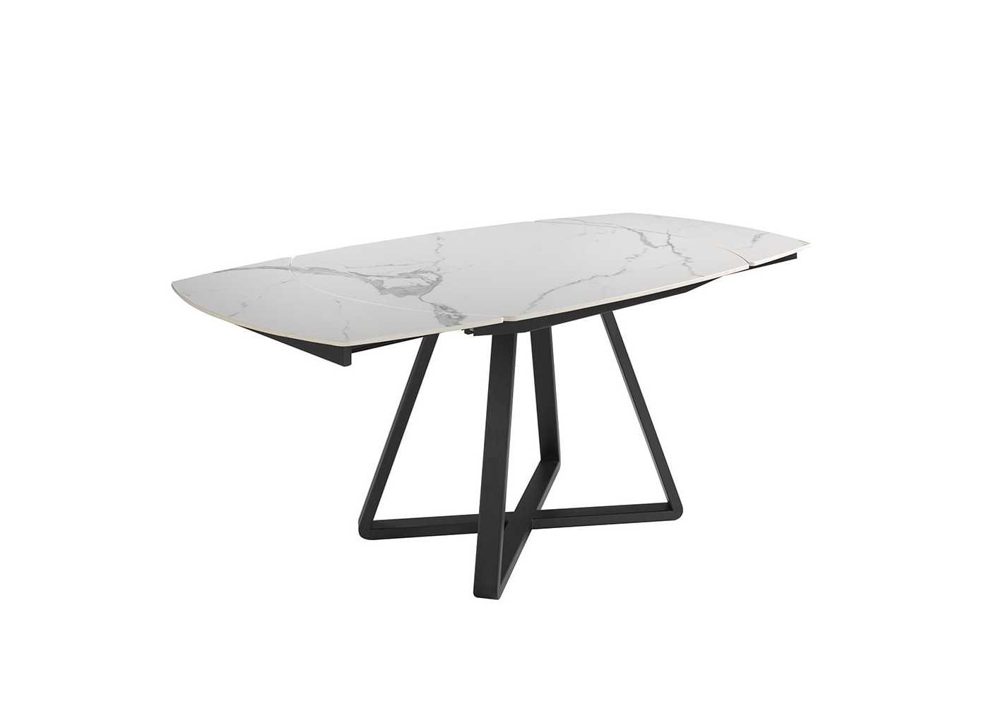 Dining table with extendable top in oval barrel shape in white porcelain marble with gray veins and gloss finish. Black epoxy lacquered stainless steel base