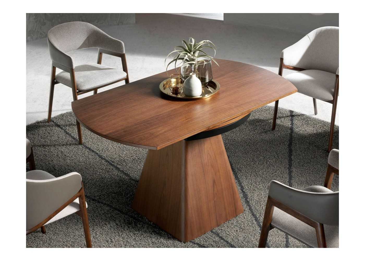 Original and versatile dining table with rectangular barrel top that converts into a round table with a rotating extension.