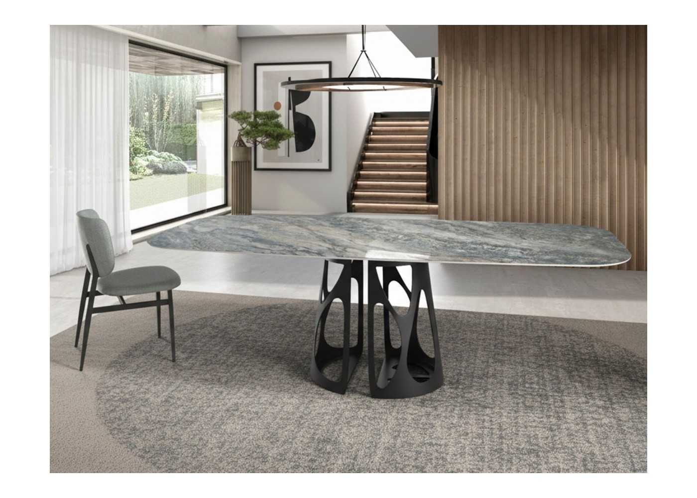 Dining table with oval porcelain marble barrel top and black epoxy stainless steel base.