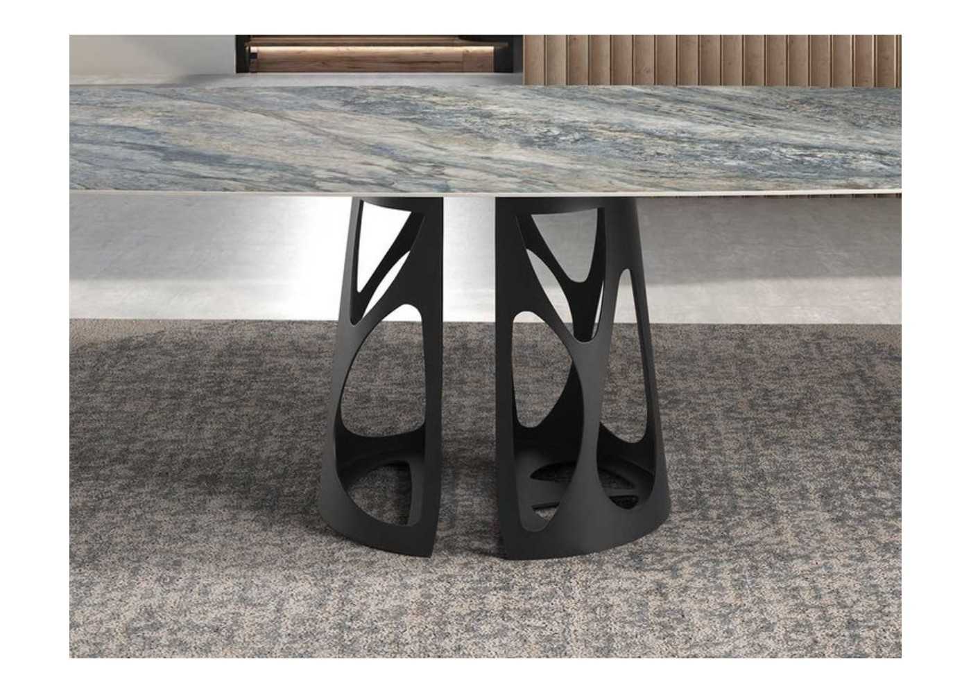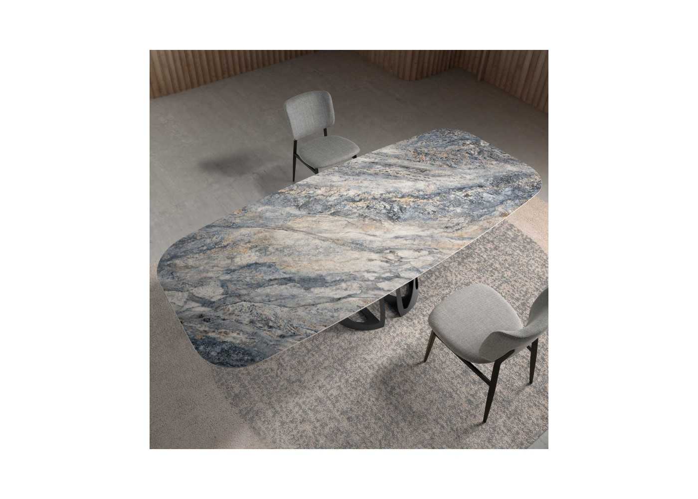 Elegant dining table with fixed oval barrel top with modern design in blue gloss porcelain marble with veins in gray and brown tones.
