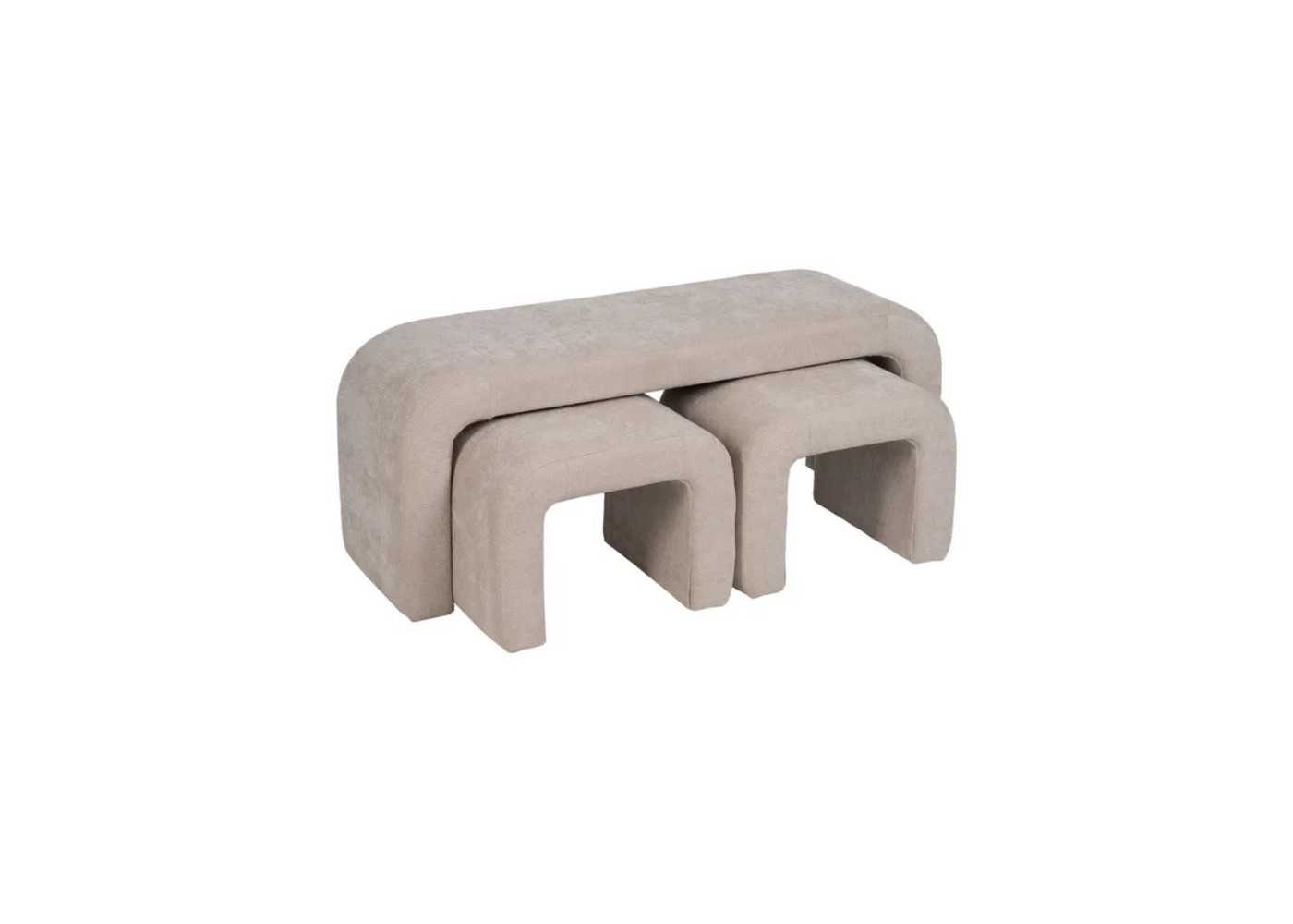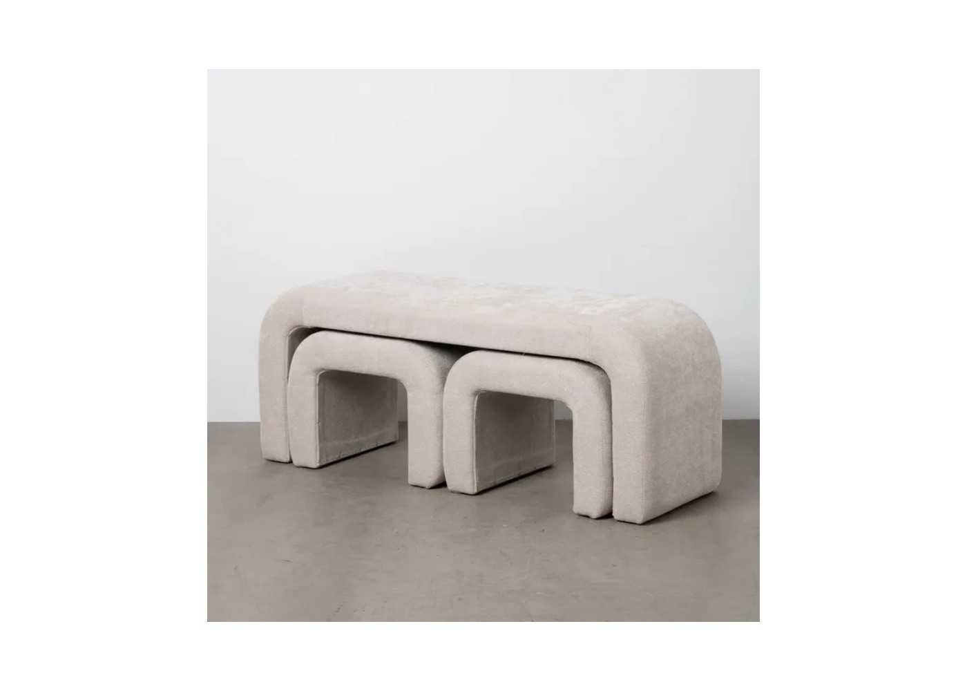 Elegant set of upholstered stool with rounded lines and two upholstered poufs stored inside.