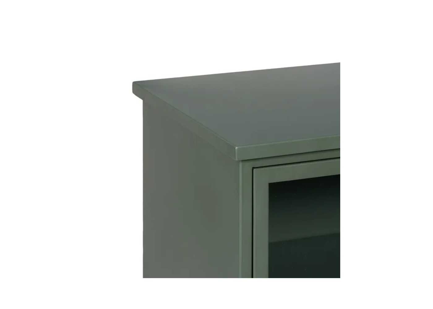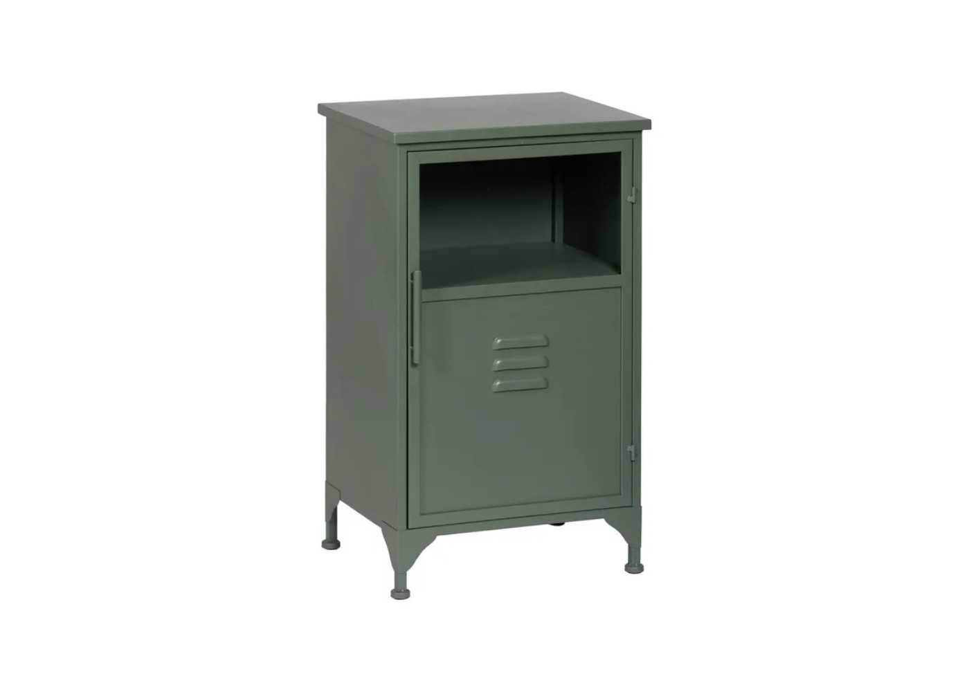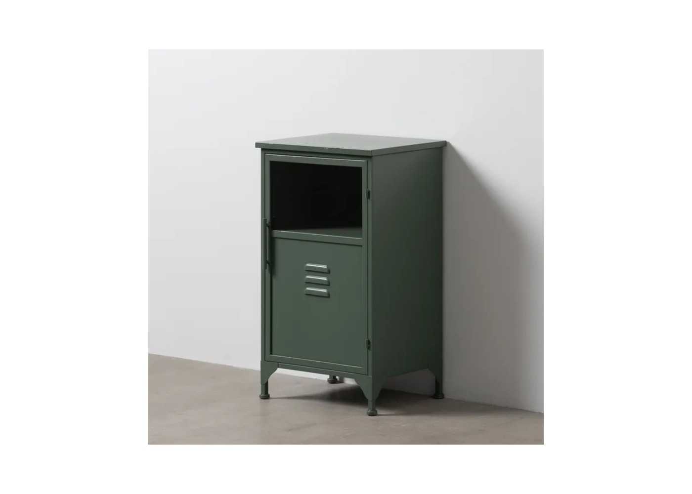 Retro and industrial design bedside table or office filing cabinet with door and glass, made of mint green lacquered iron.