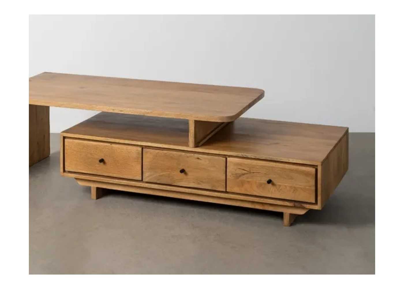 Mango wood coffee table with 3 drawers on each side.