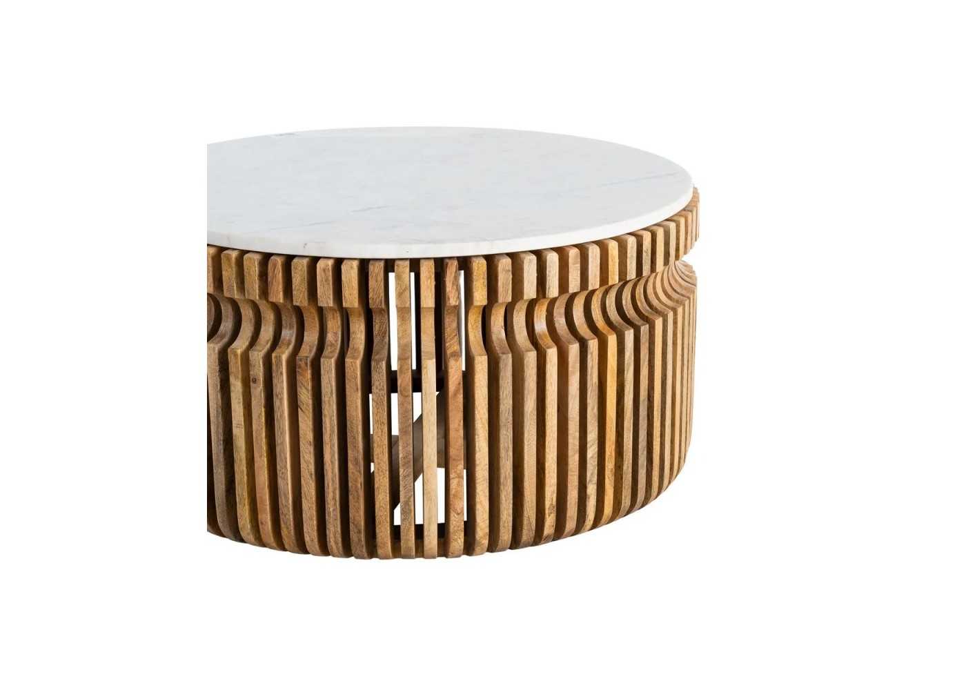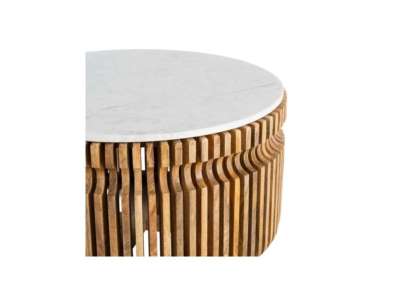 Coffee table made of solid mango wood with a white marble top with grey veins.