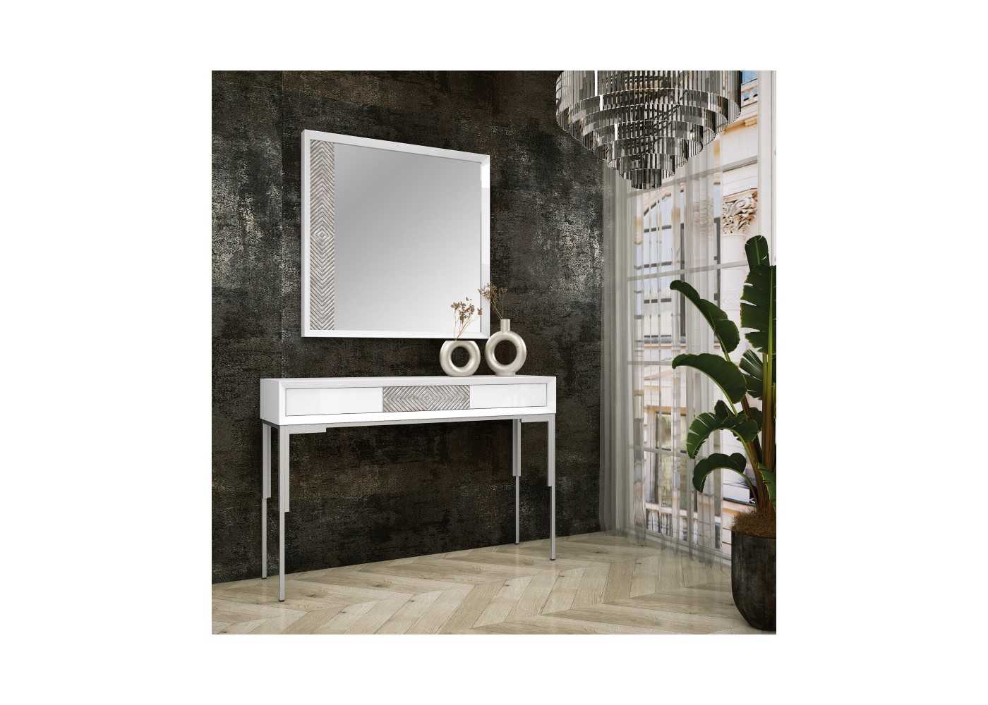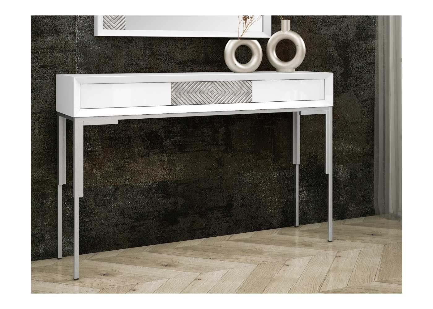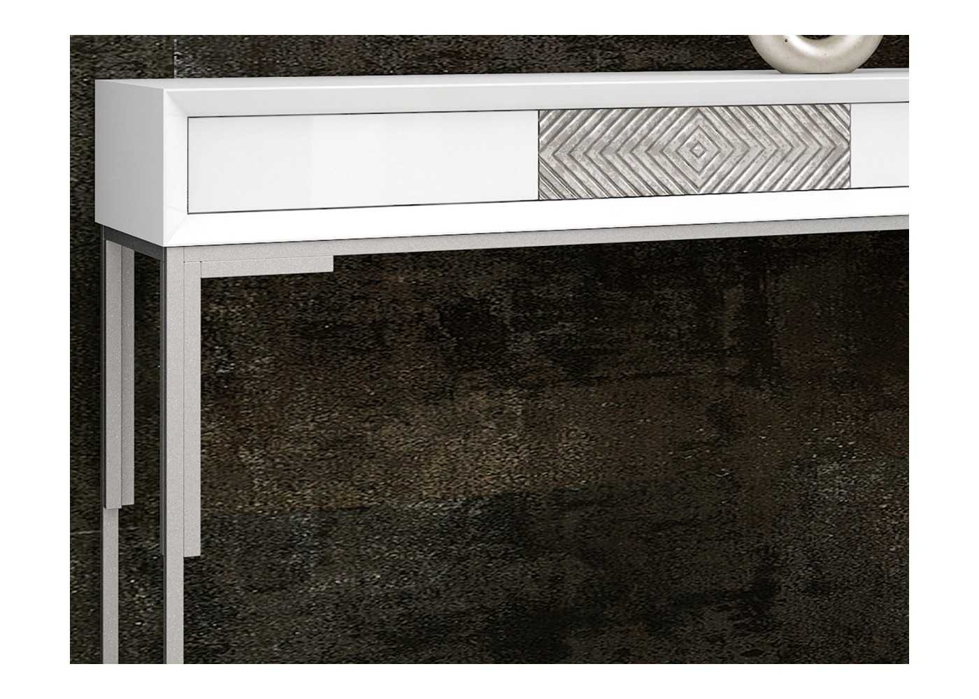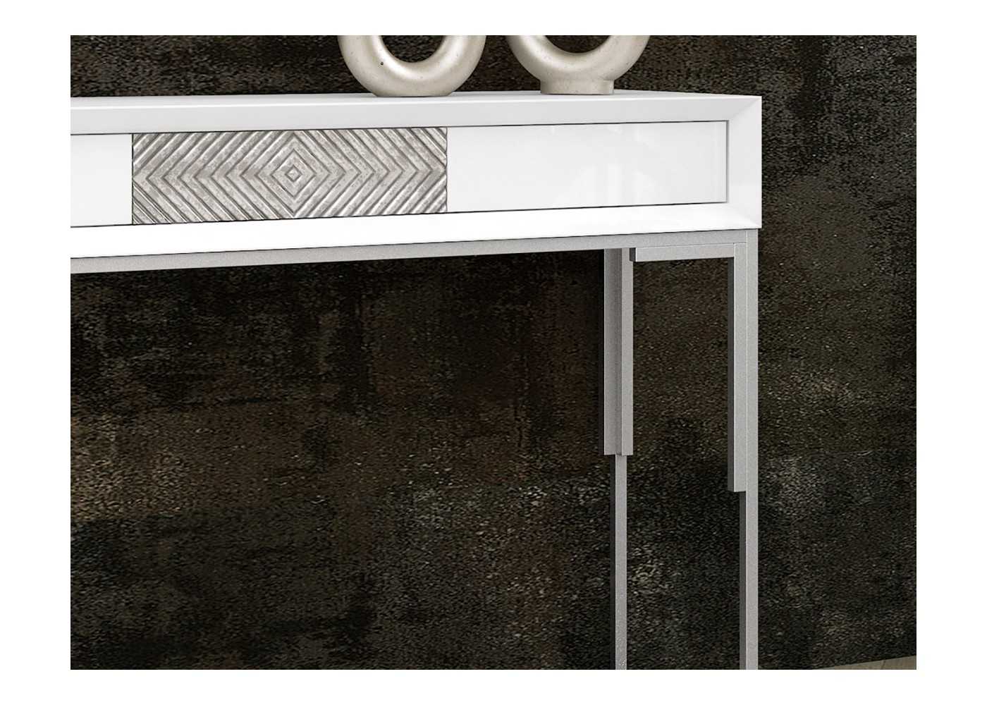 Original console with 2/3 drawers in a modern design. Lacquered finish with a unique silver marbled engraving on the front of the central drawer. Lacquered steel base.