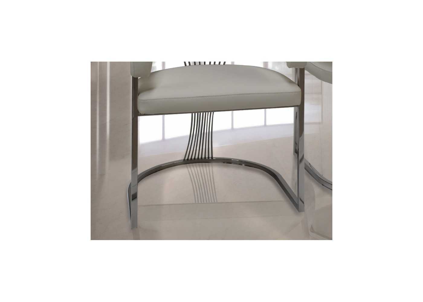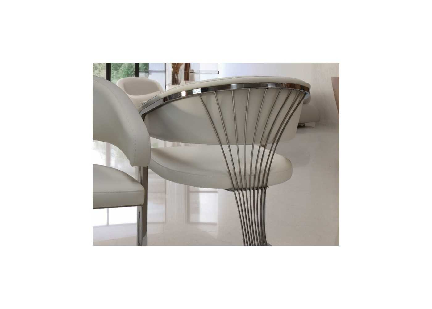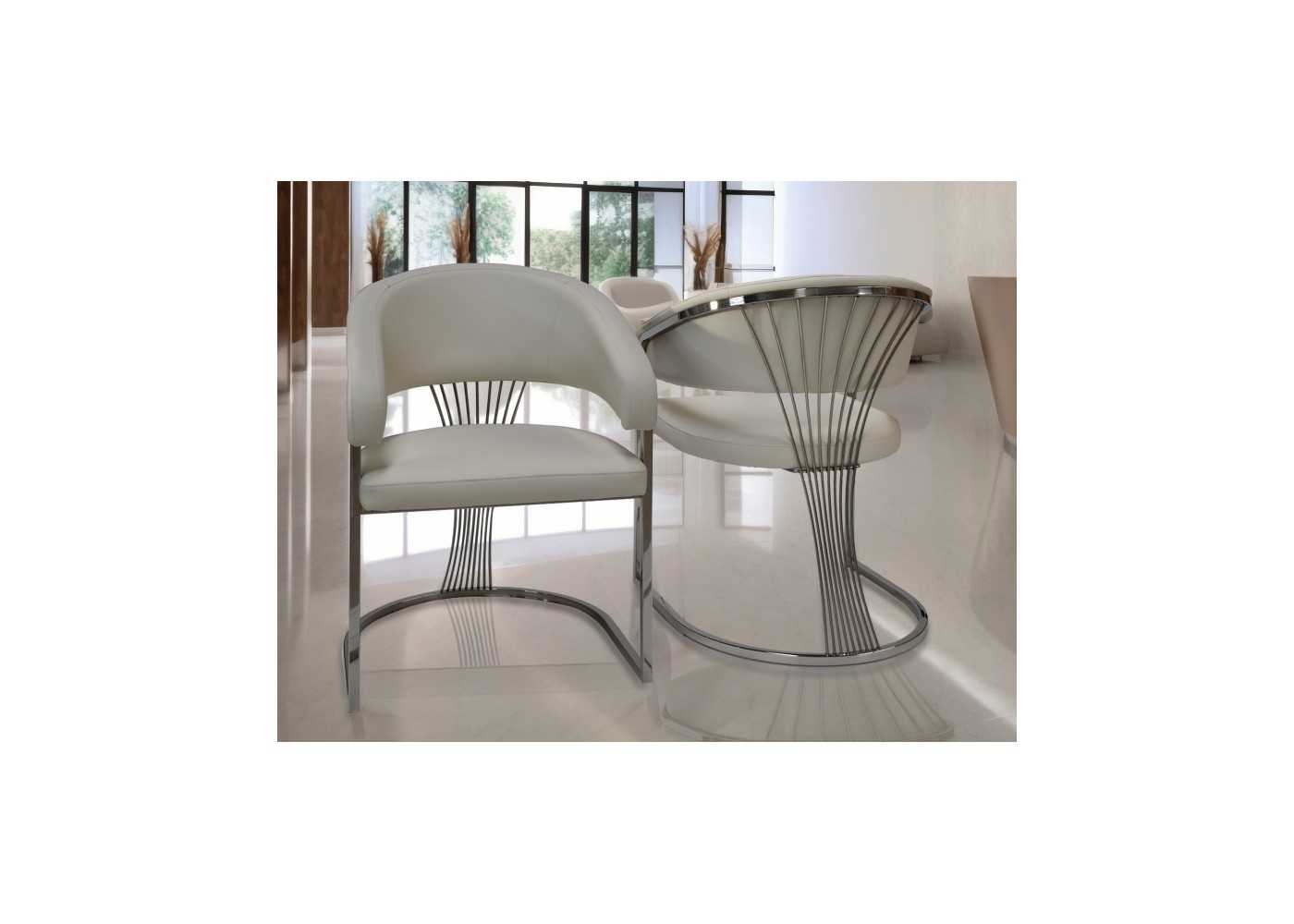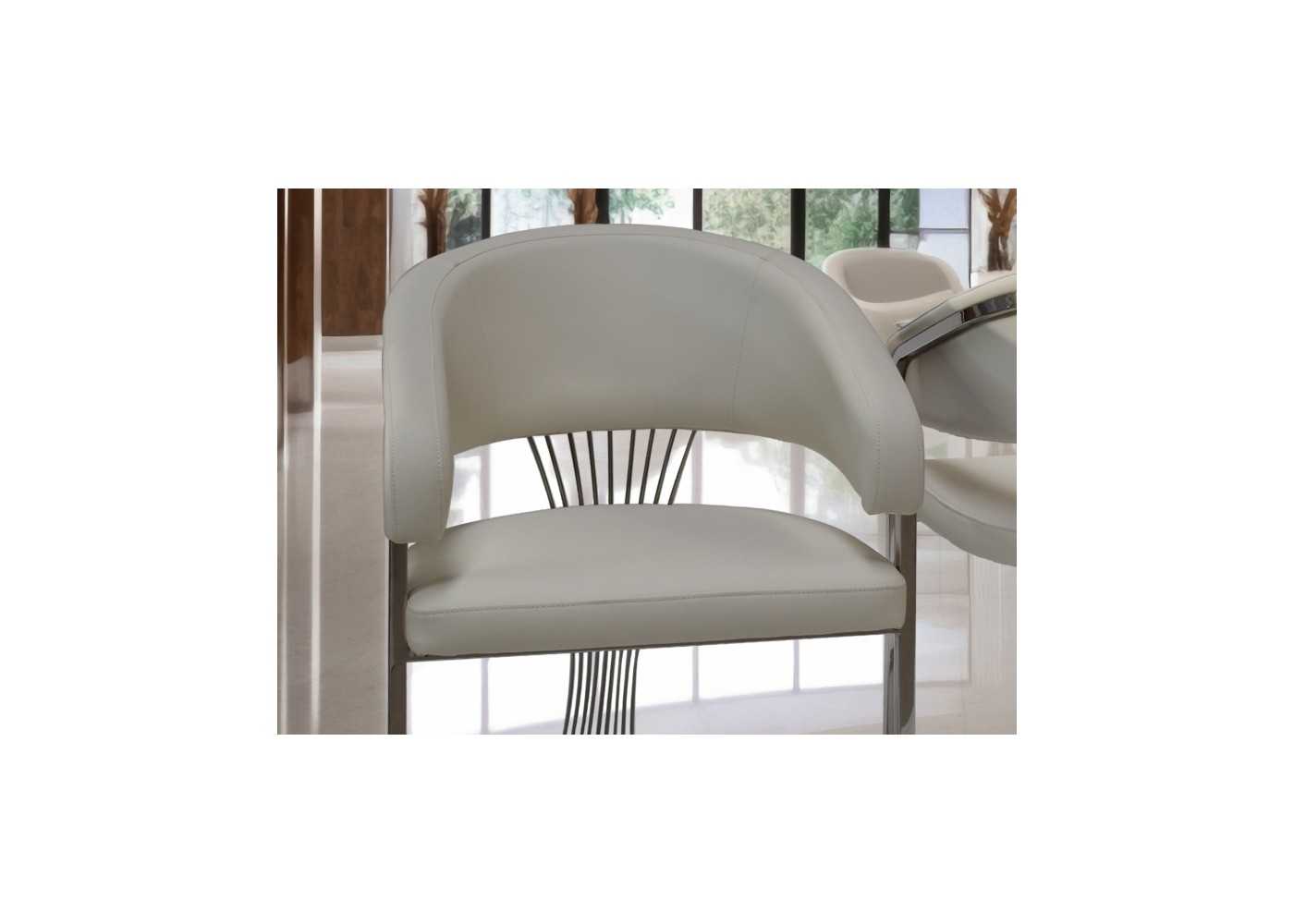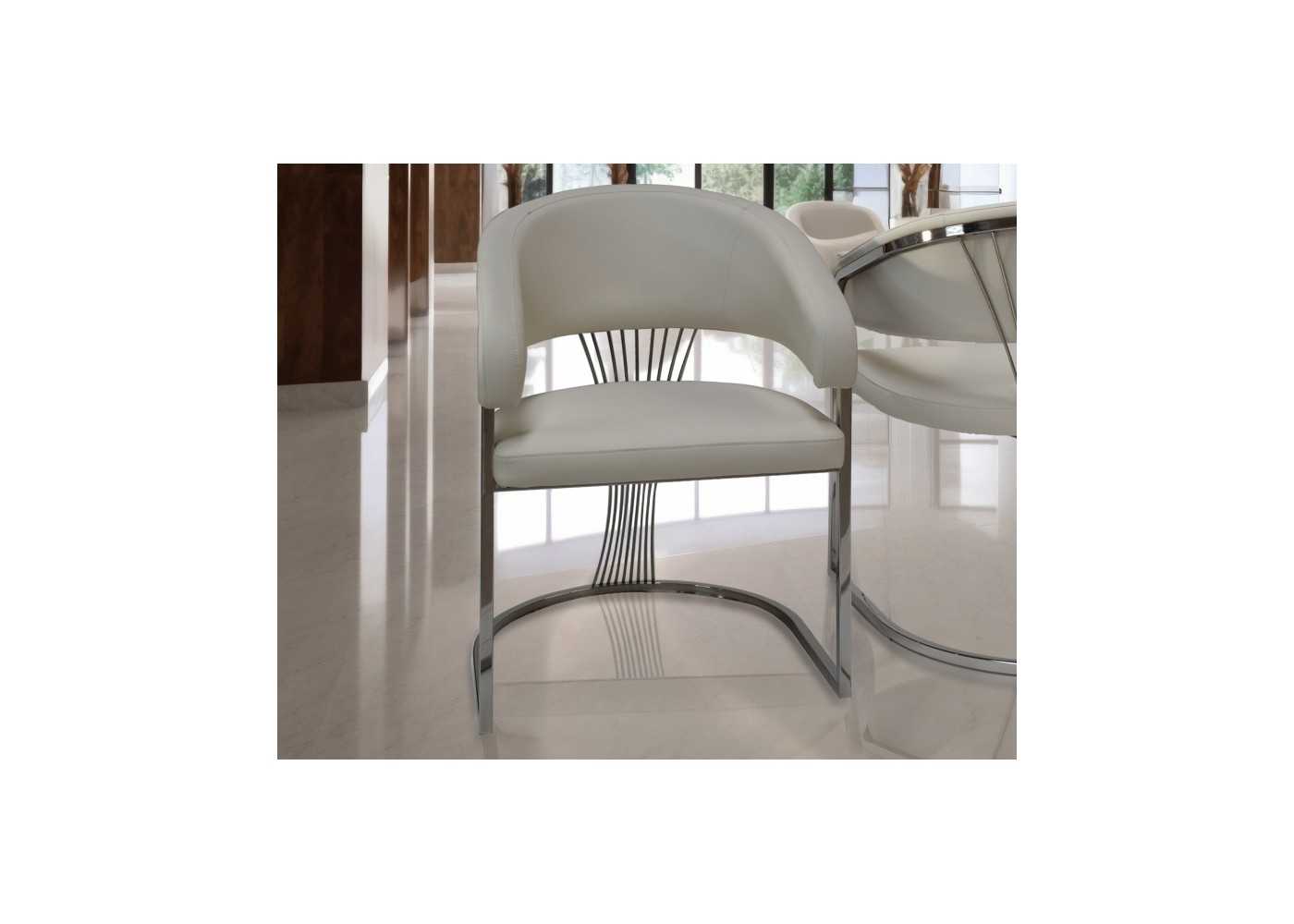 Comfortable and elegant chair with wrap-around armrests, chromed stainless steel frame, and upholstered in white synthetic leather.