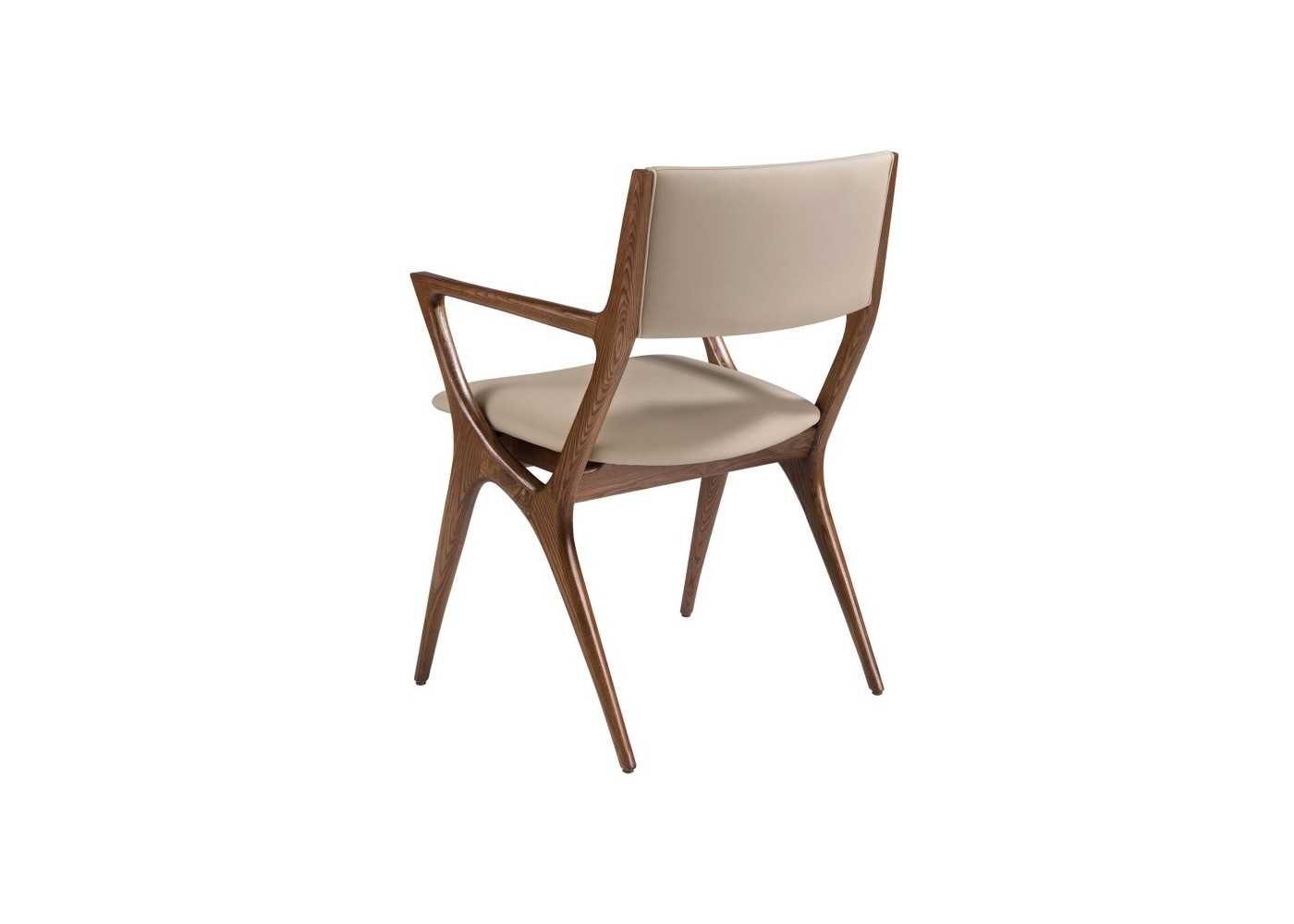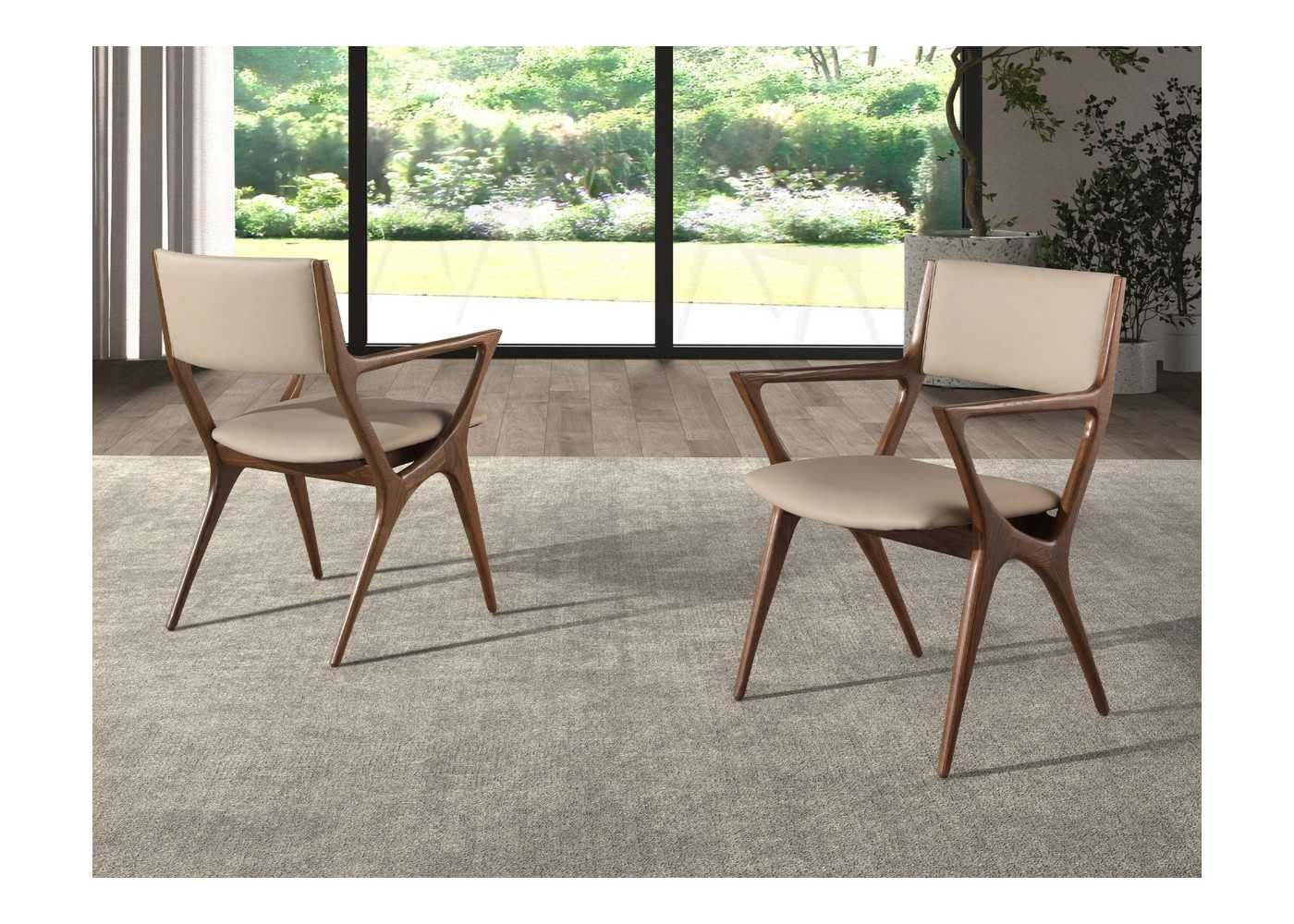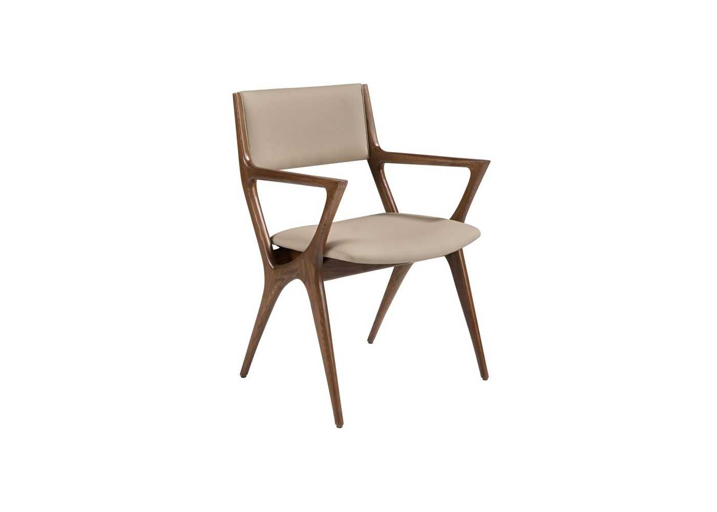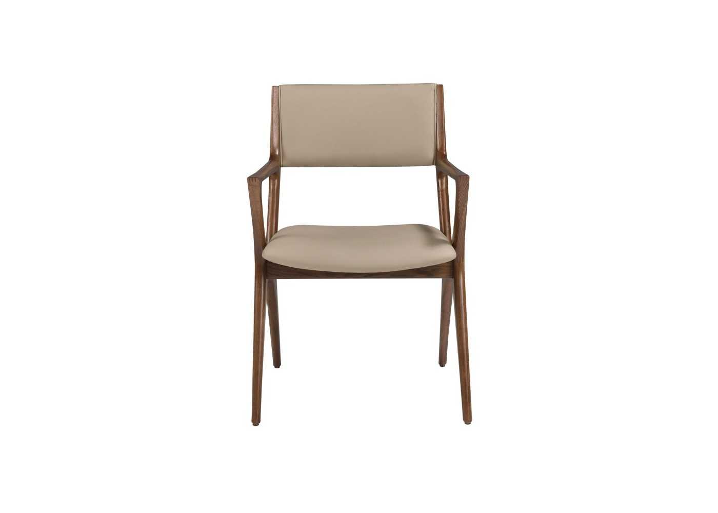 Modern design chair with solid wood armrests upholstered in mink-colored synthetic leather.