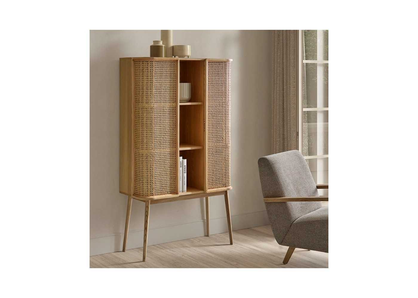 Made of solid oak wood with a natural finish and original natural fiber mesh door fronts.