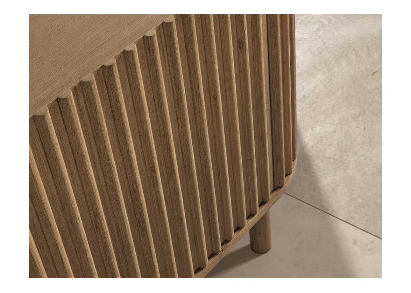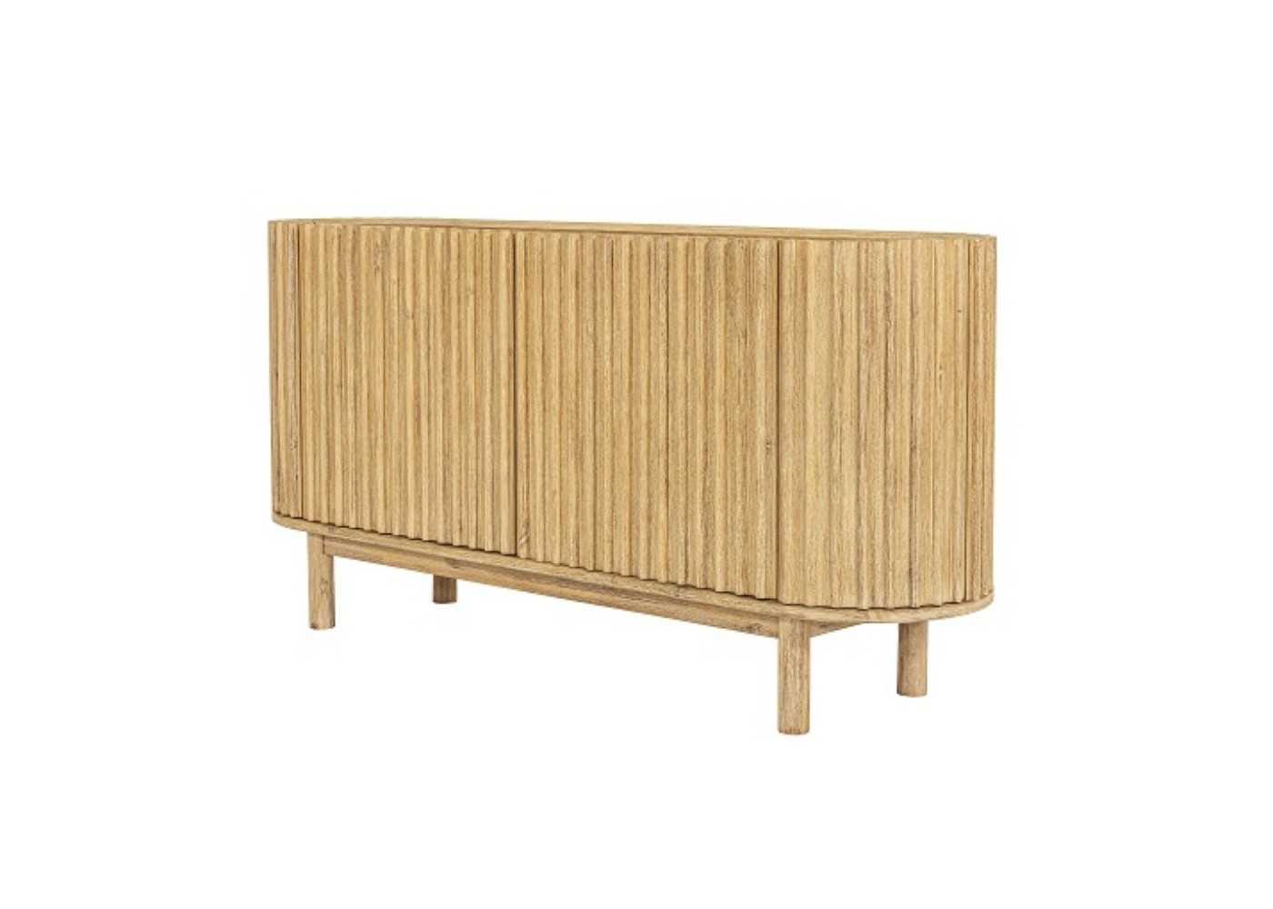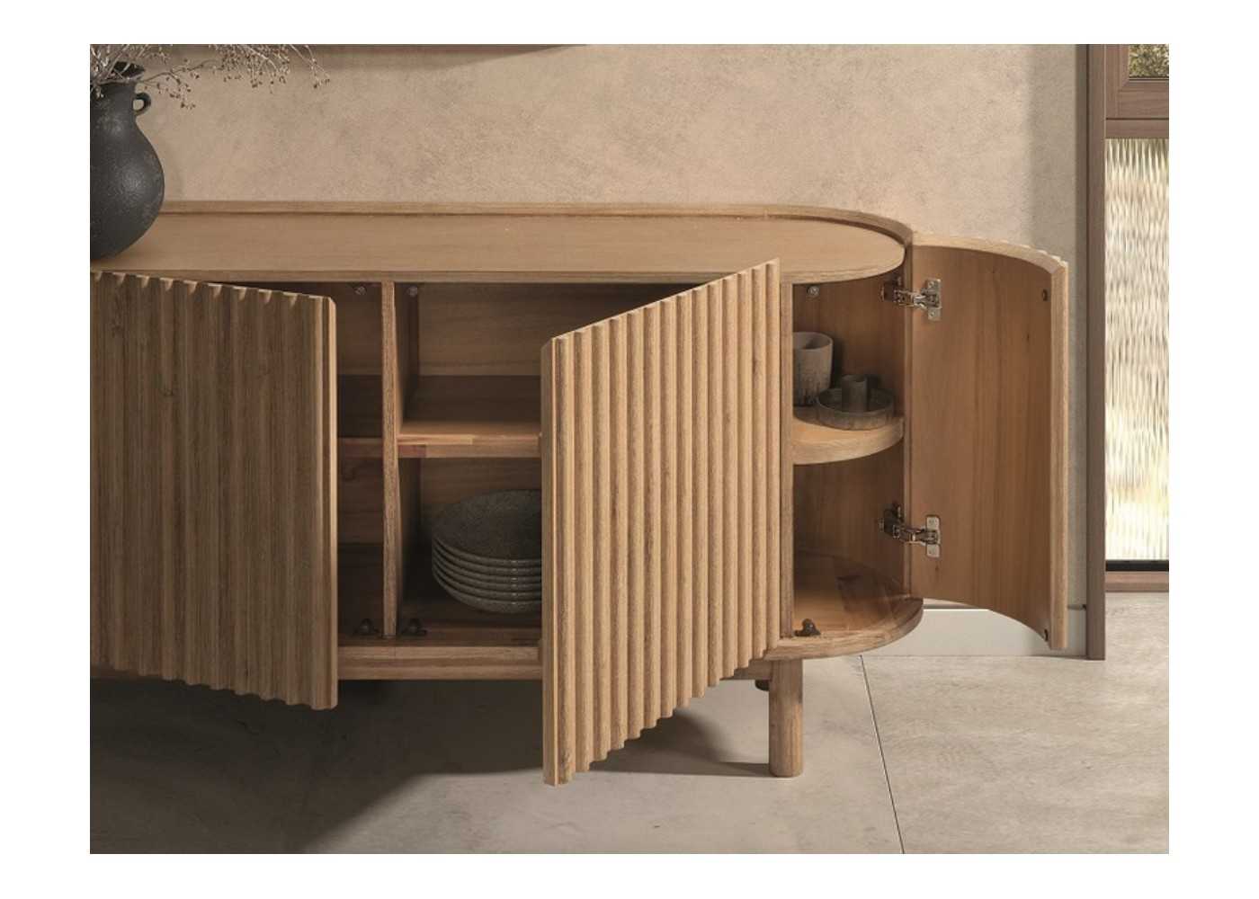 Small sideboard made of solid acacia wood with 2 central doors and 2 rounded side doors with fluted door fronts.