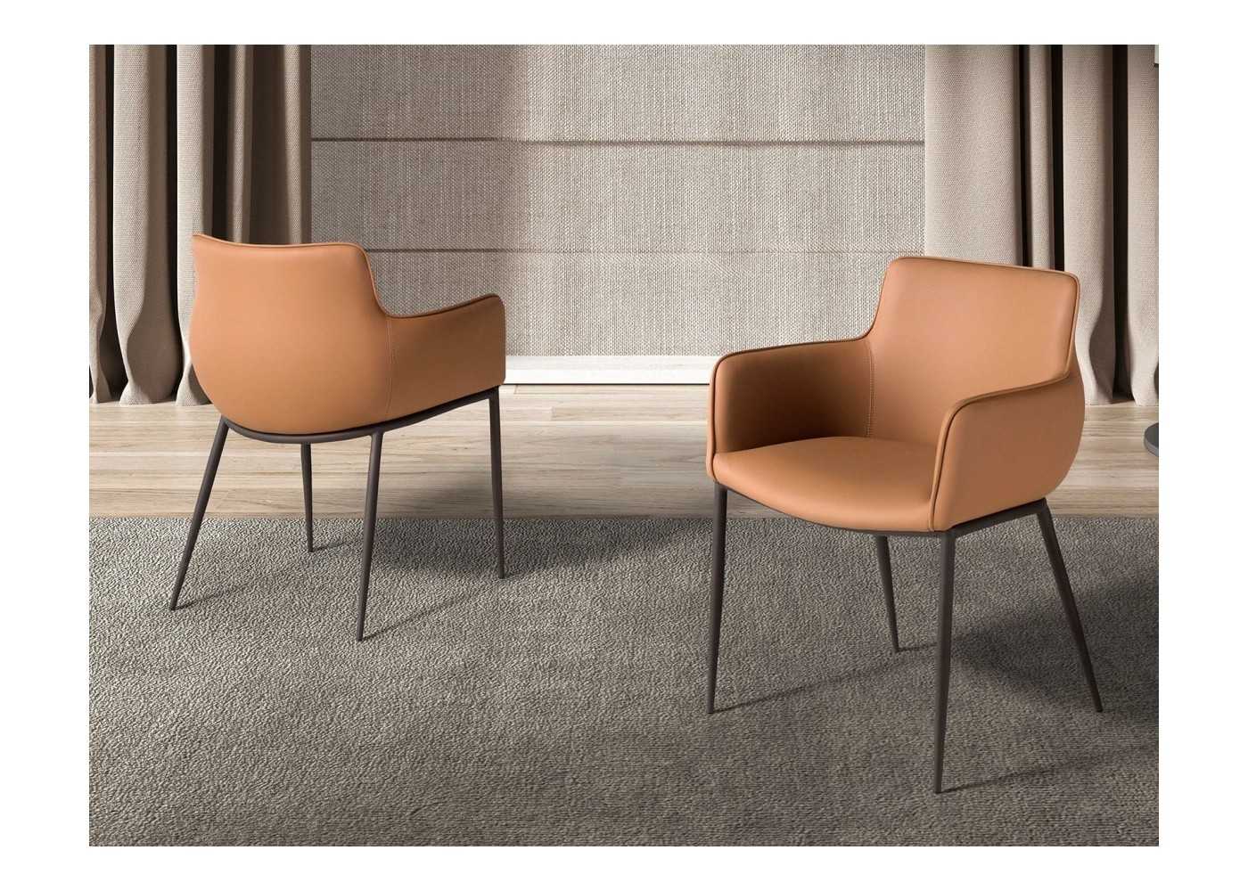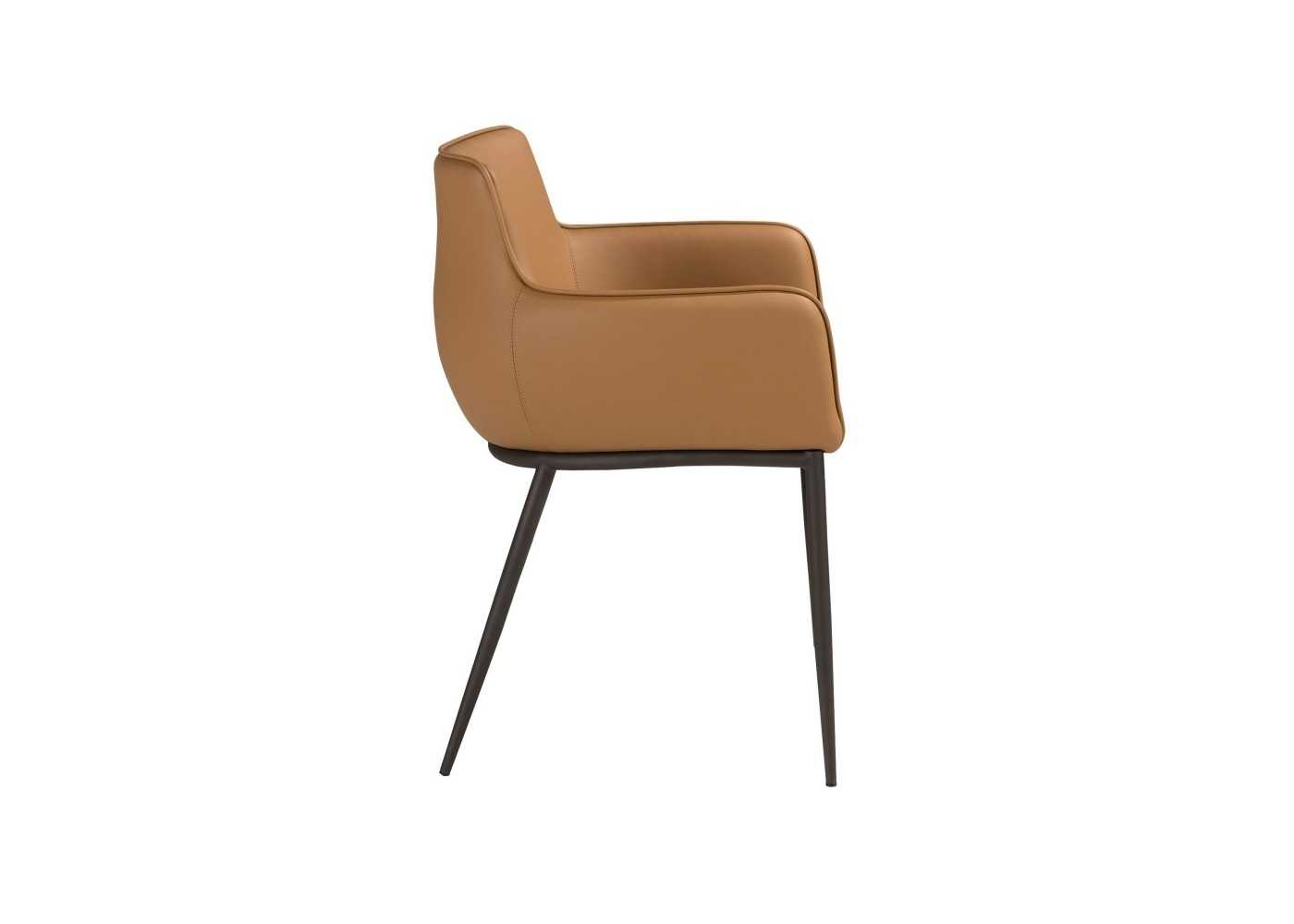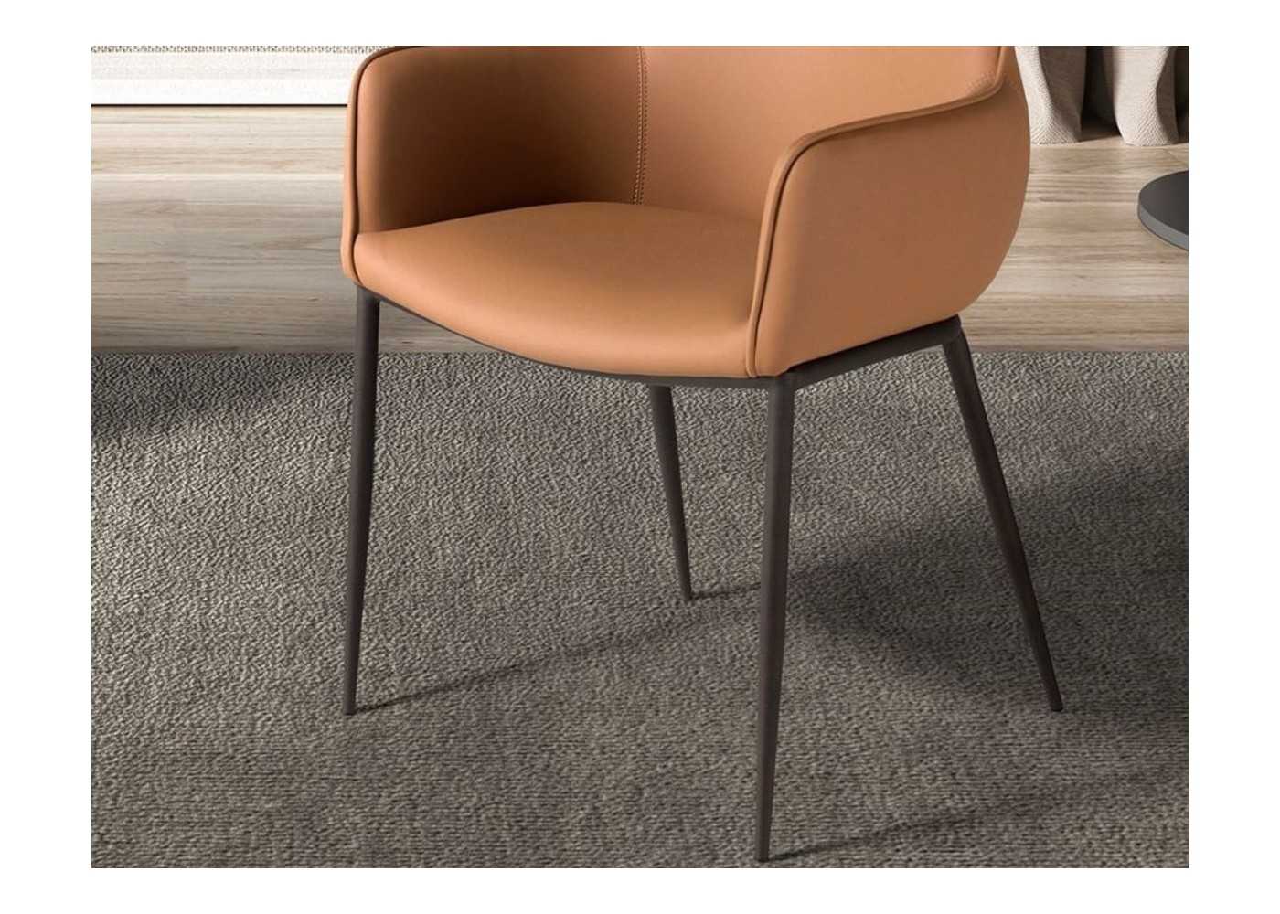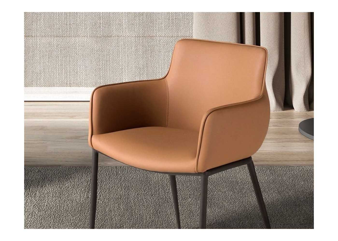 Robust, modern design chair with seat, backrest, and arms upholstered in high-quality light brown faux leather (90% vinyl and 10% polyester) with handcrafted double stitching.