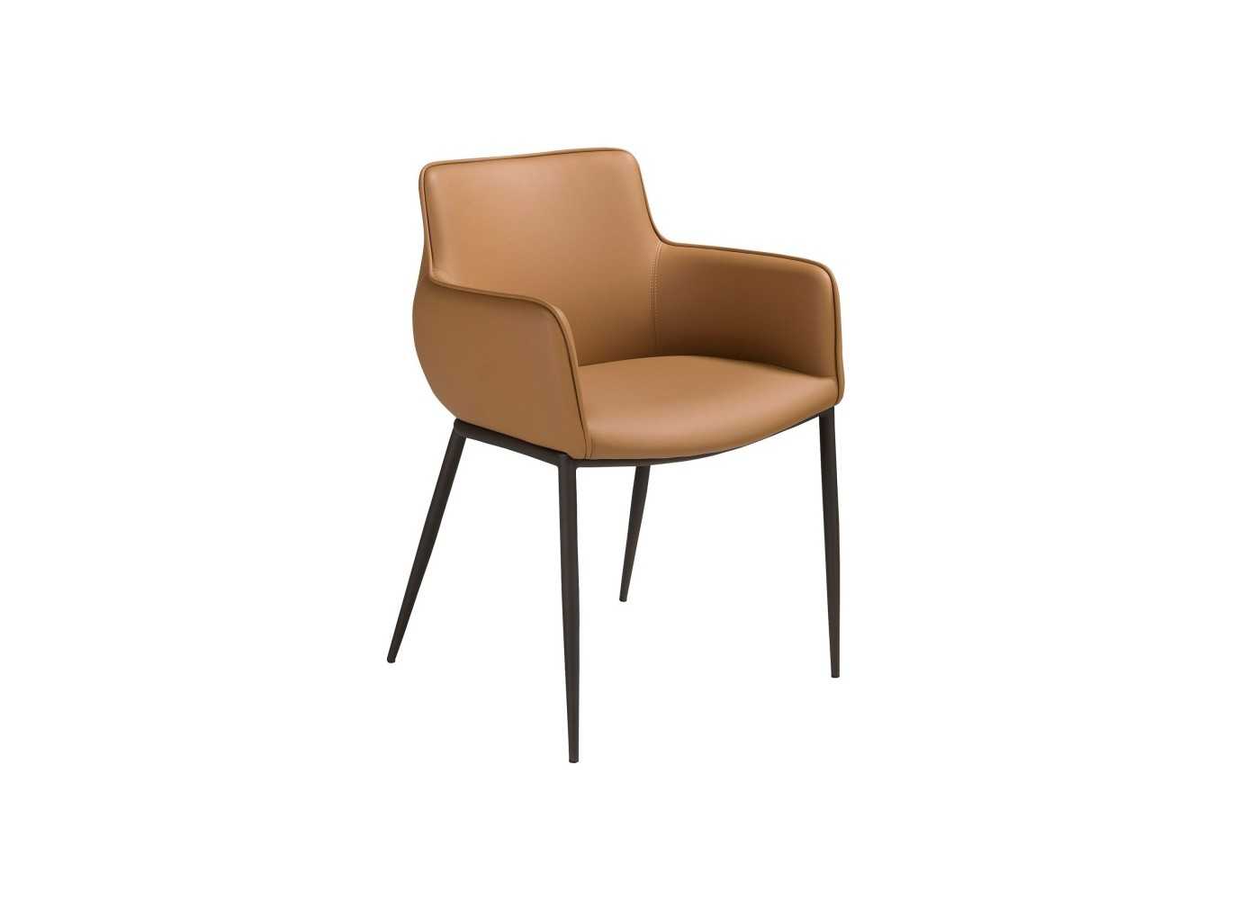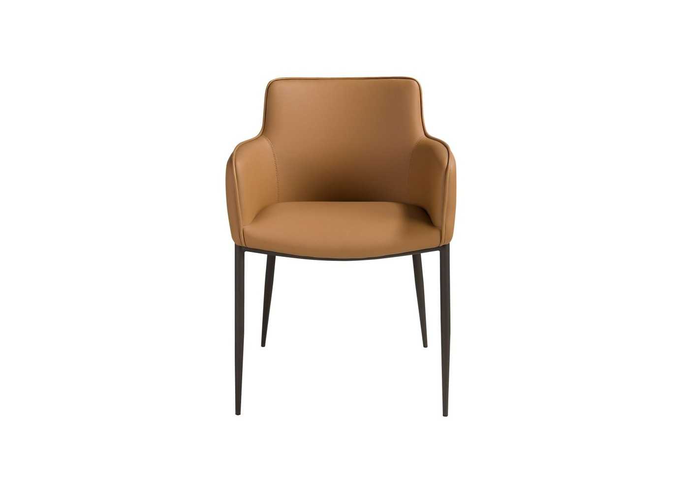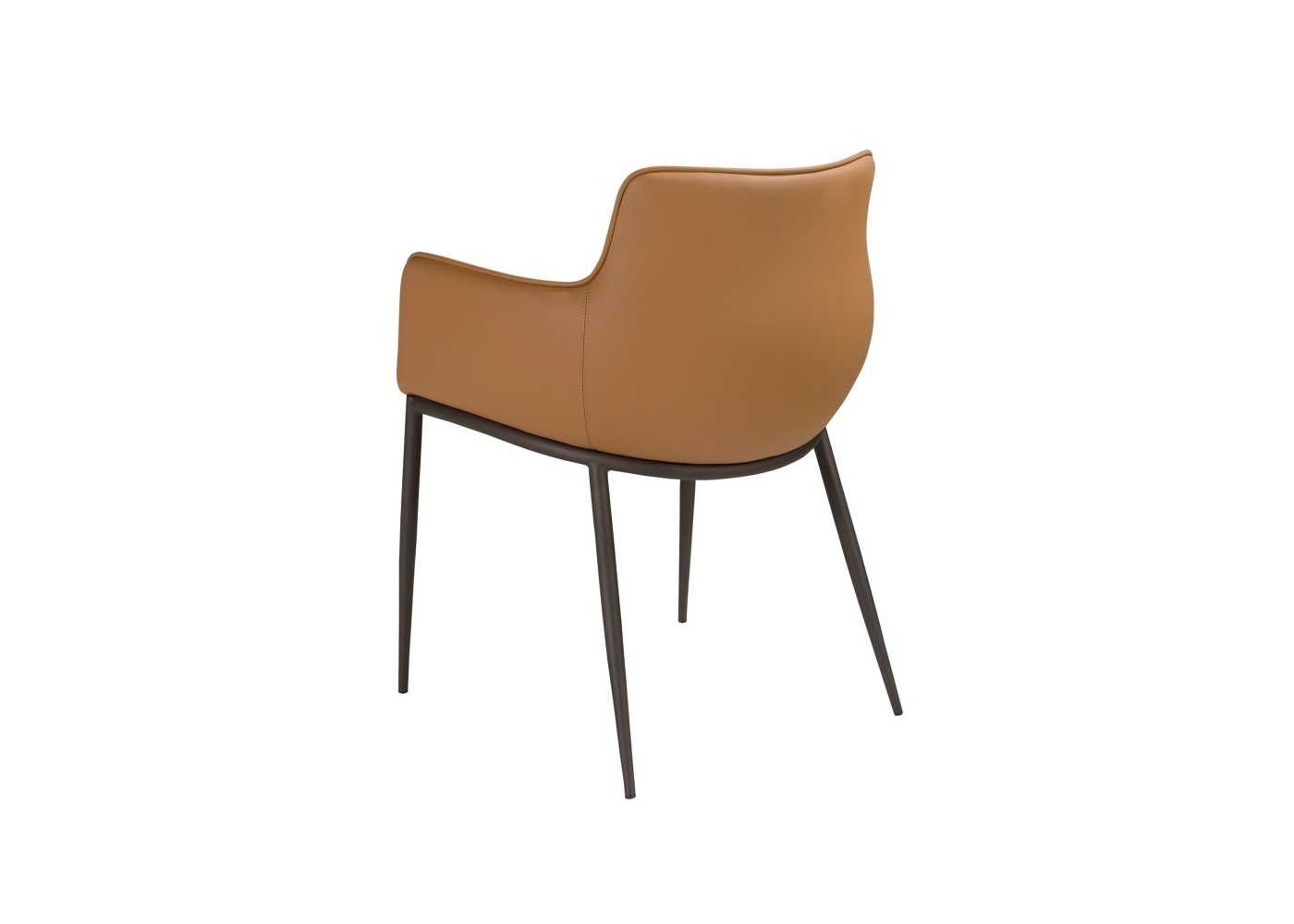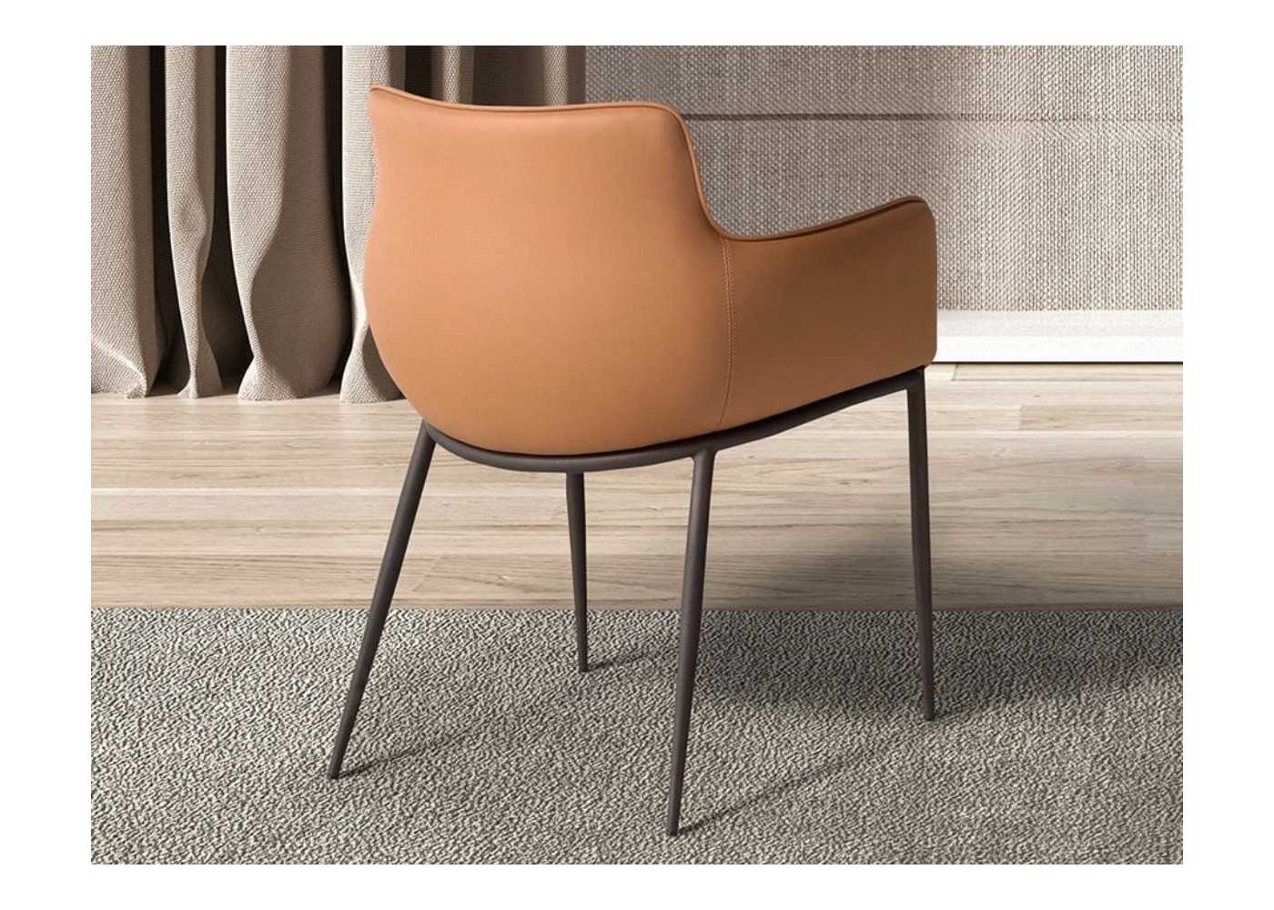 Robust, modern design chair with seat, backrest, and arms upholstered in high-quality light brown faux leather (90% vinyl and 10% polyester) with handcrafted double stitching.
