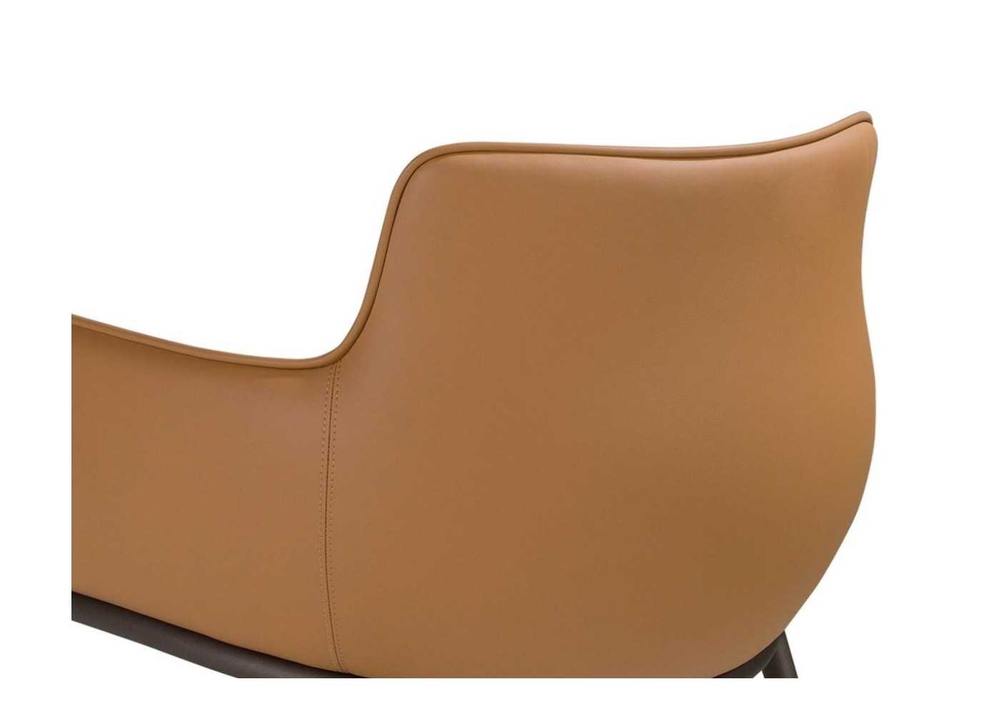 Wrap-around designer chair with arms upholstered in light brown synthetic leather with black epoxy lacquered stainless steel legs.
