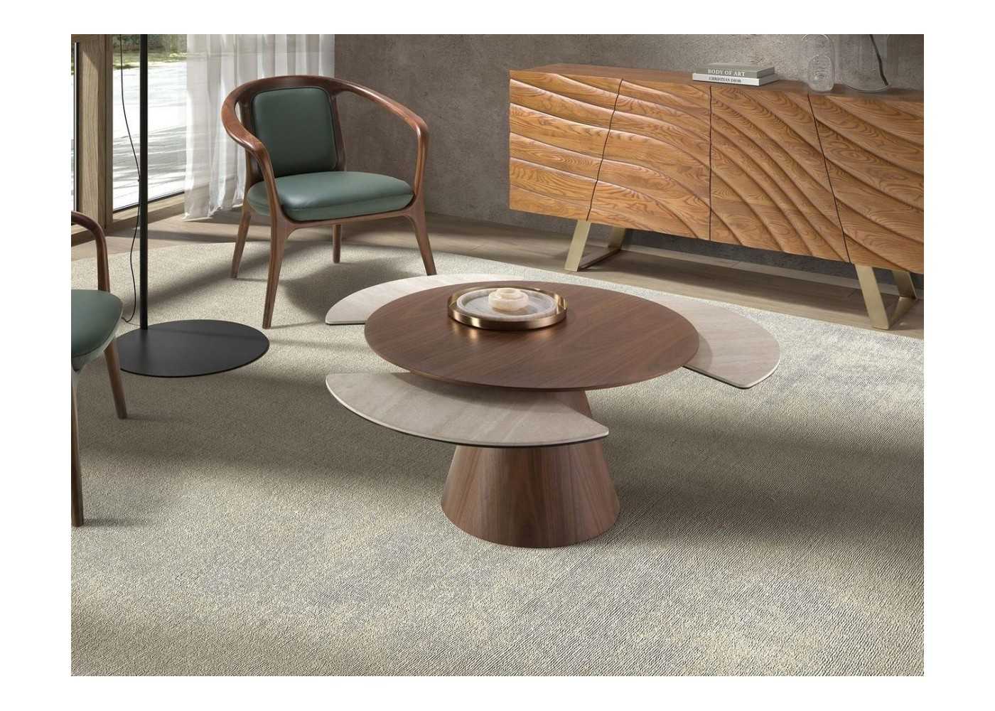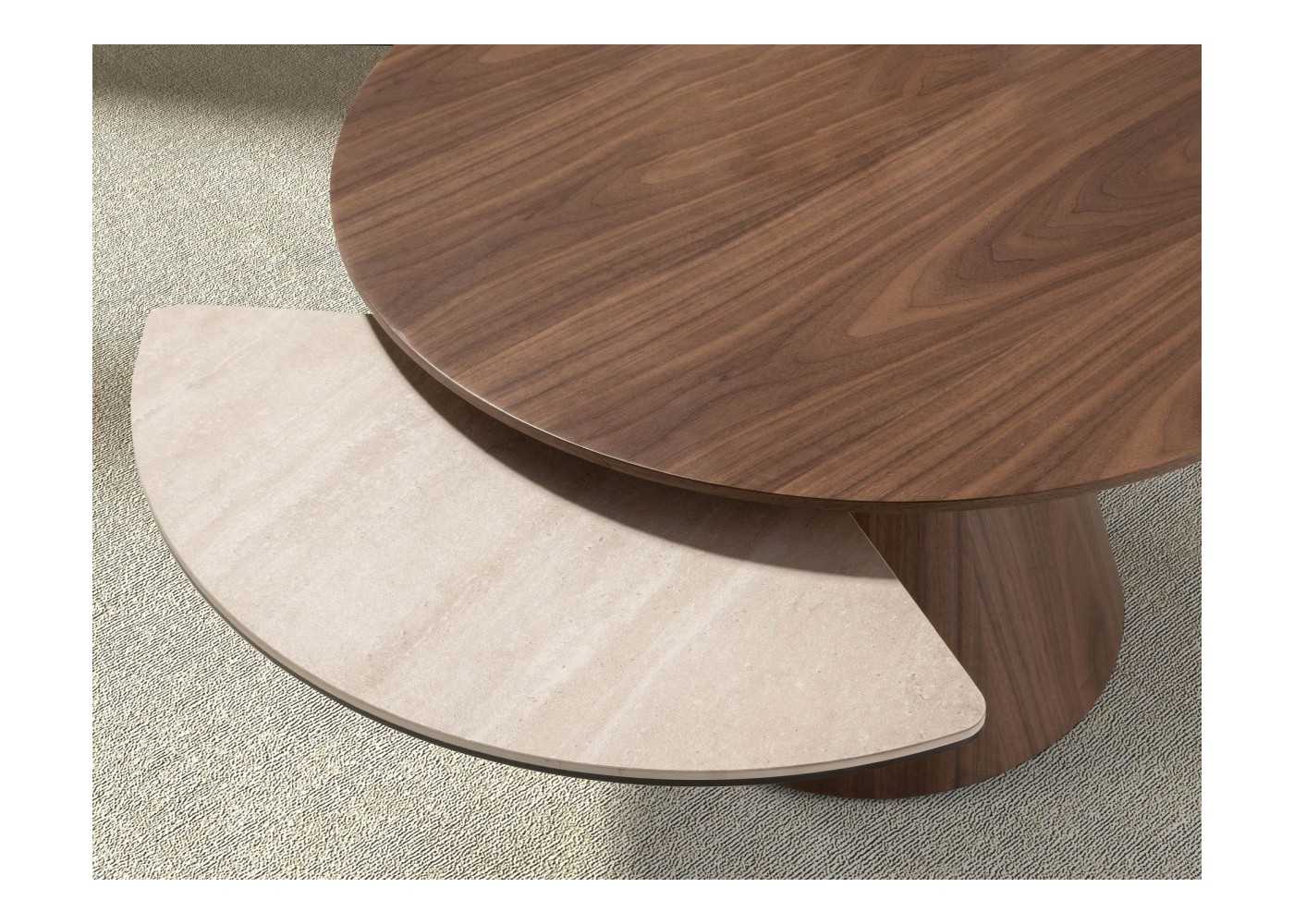 Original round coffee table in walnut-veneered ash wood with porcelain marble extensions in matte sand color.