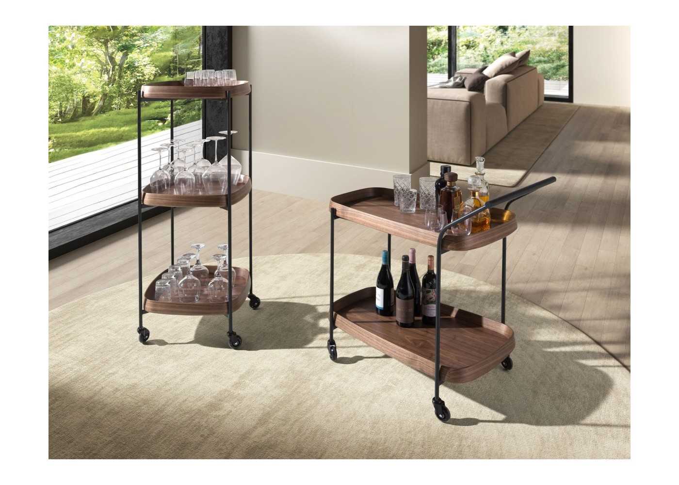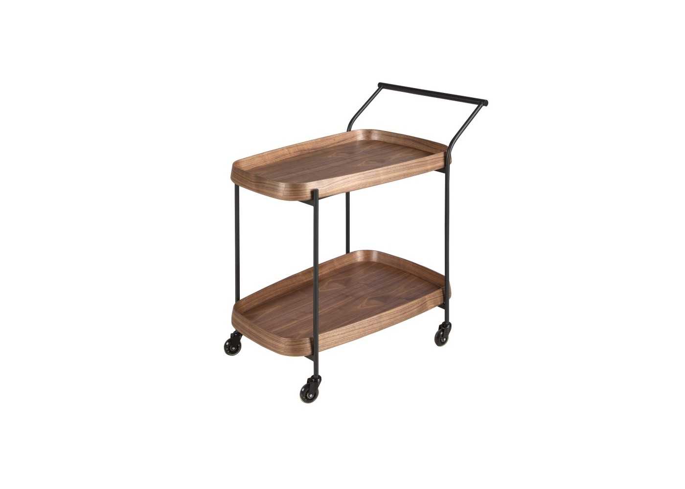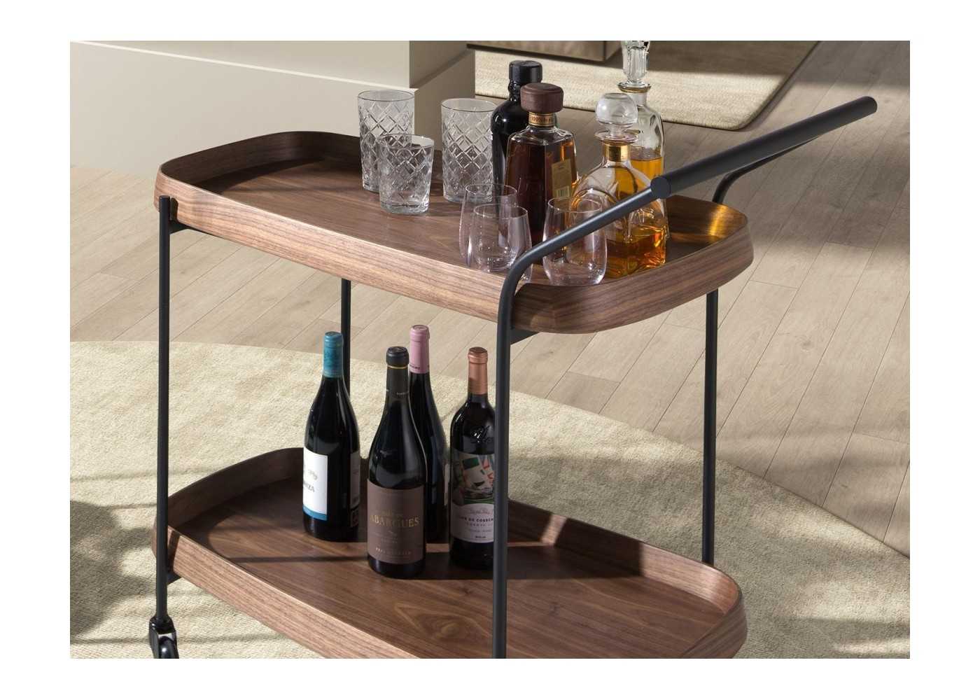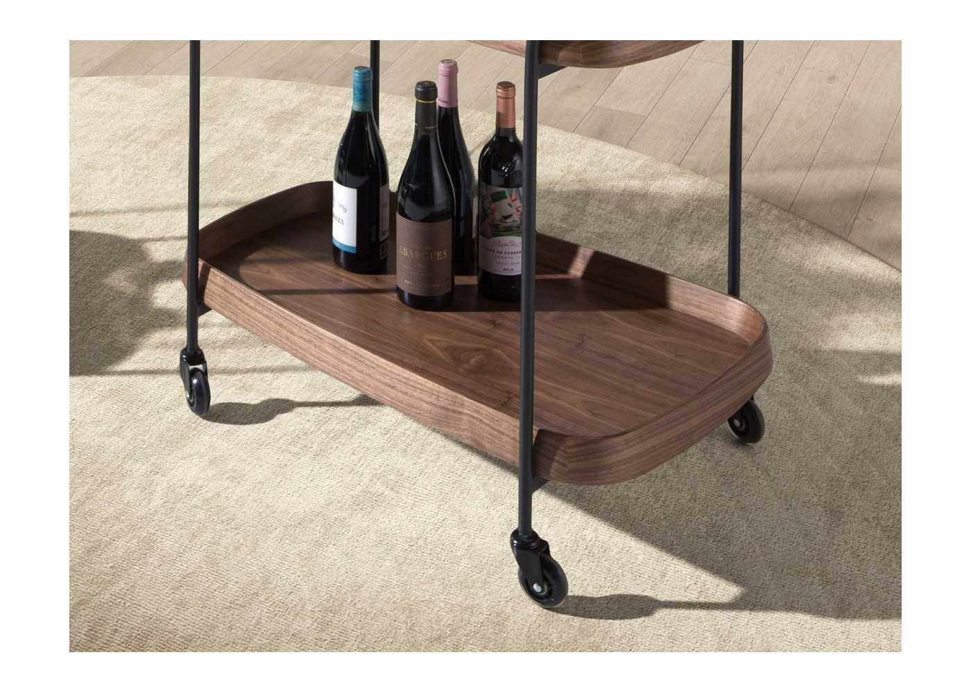 Modern design minibar trolley with black epoxy stainless steel frame and solid ash wood trays with walnut veneer. PVC wheels.