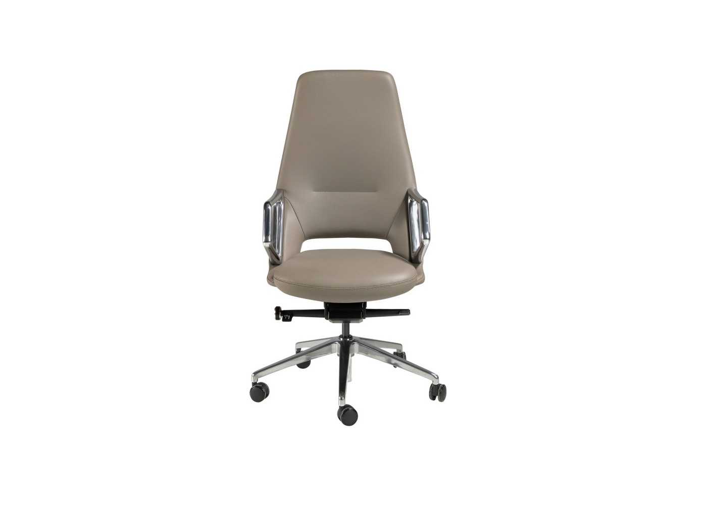 Modern and ergonomic swivel office chair upholstered in grey synthetic leather with polished stainless steel armrests and swivel base.