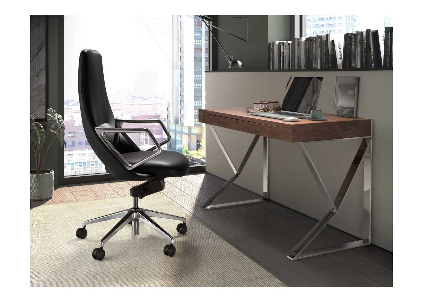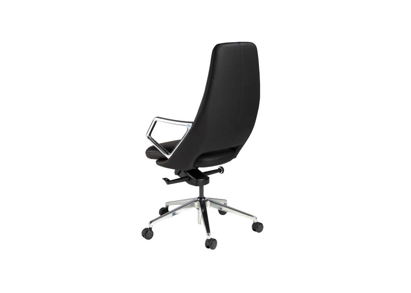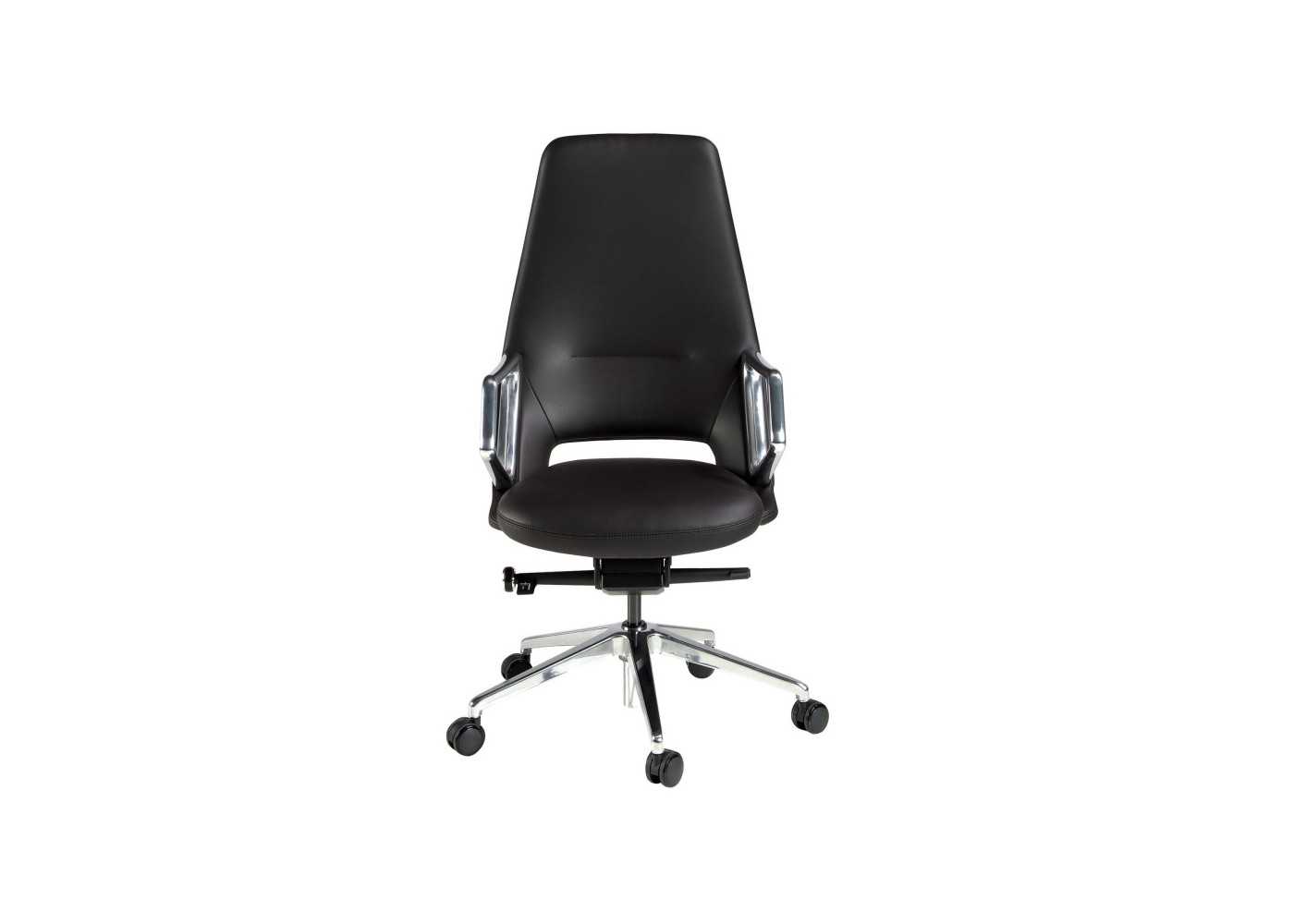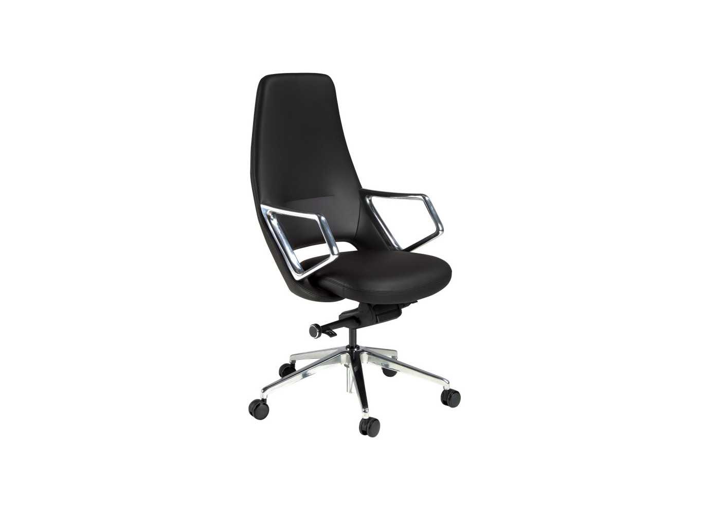 Modern and ergonomic swivel office chair upholstered in black synthetic leather with polished stainless steel armrests and swivel base.