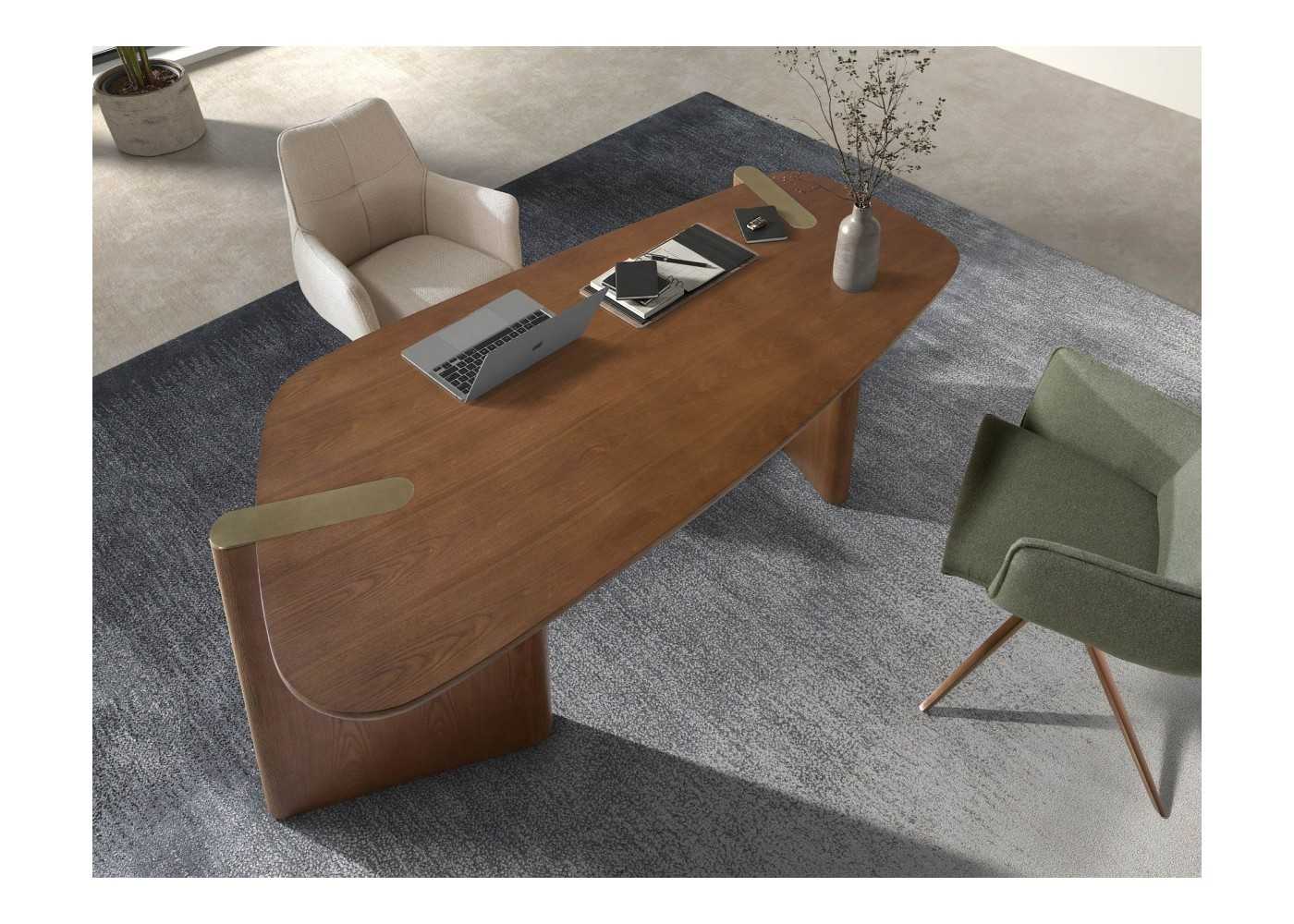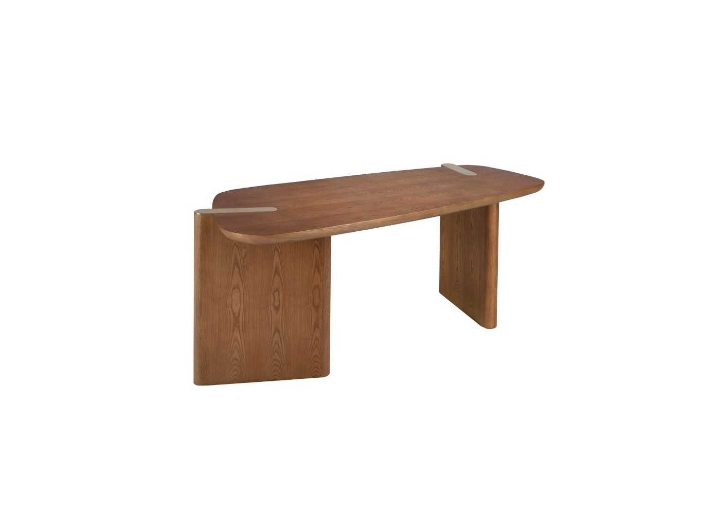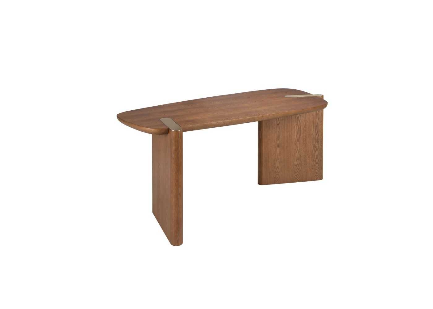 Elegant office desk made of solid ash wood veneered in natural light walnut with polished stainless steel details in a gold finish.