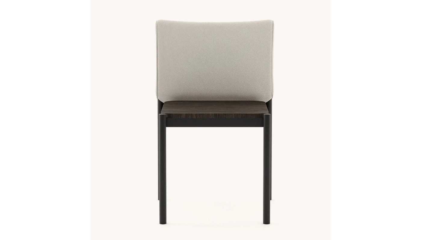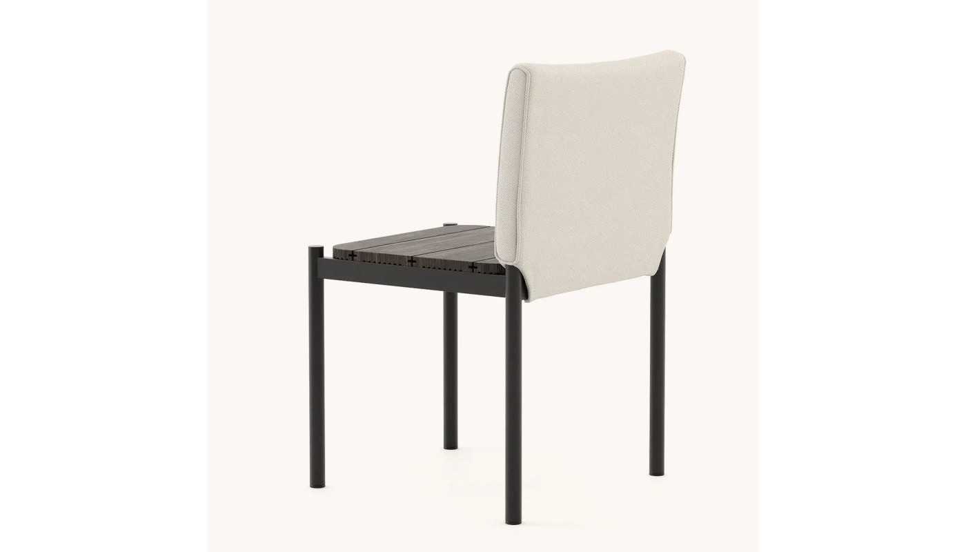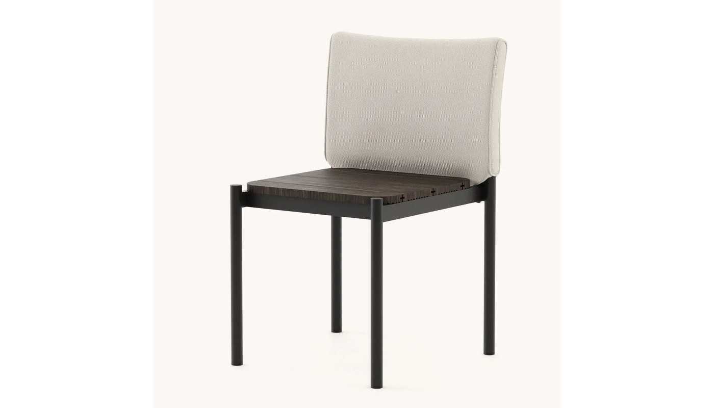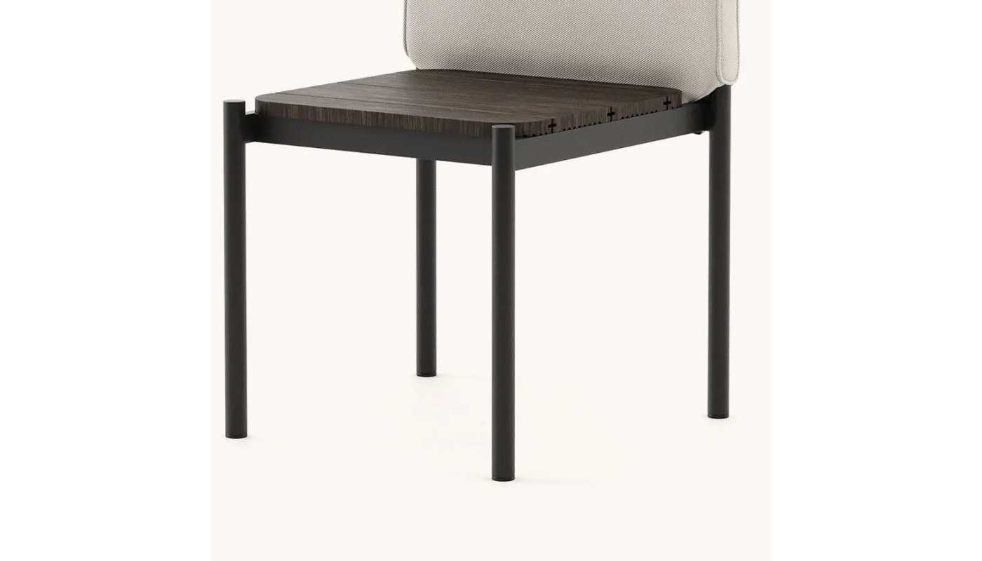 Upholstered outdoor chair with structure in textured stainless steel and laminated bamboo top.