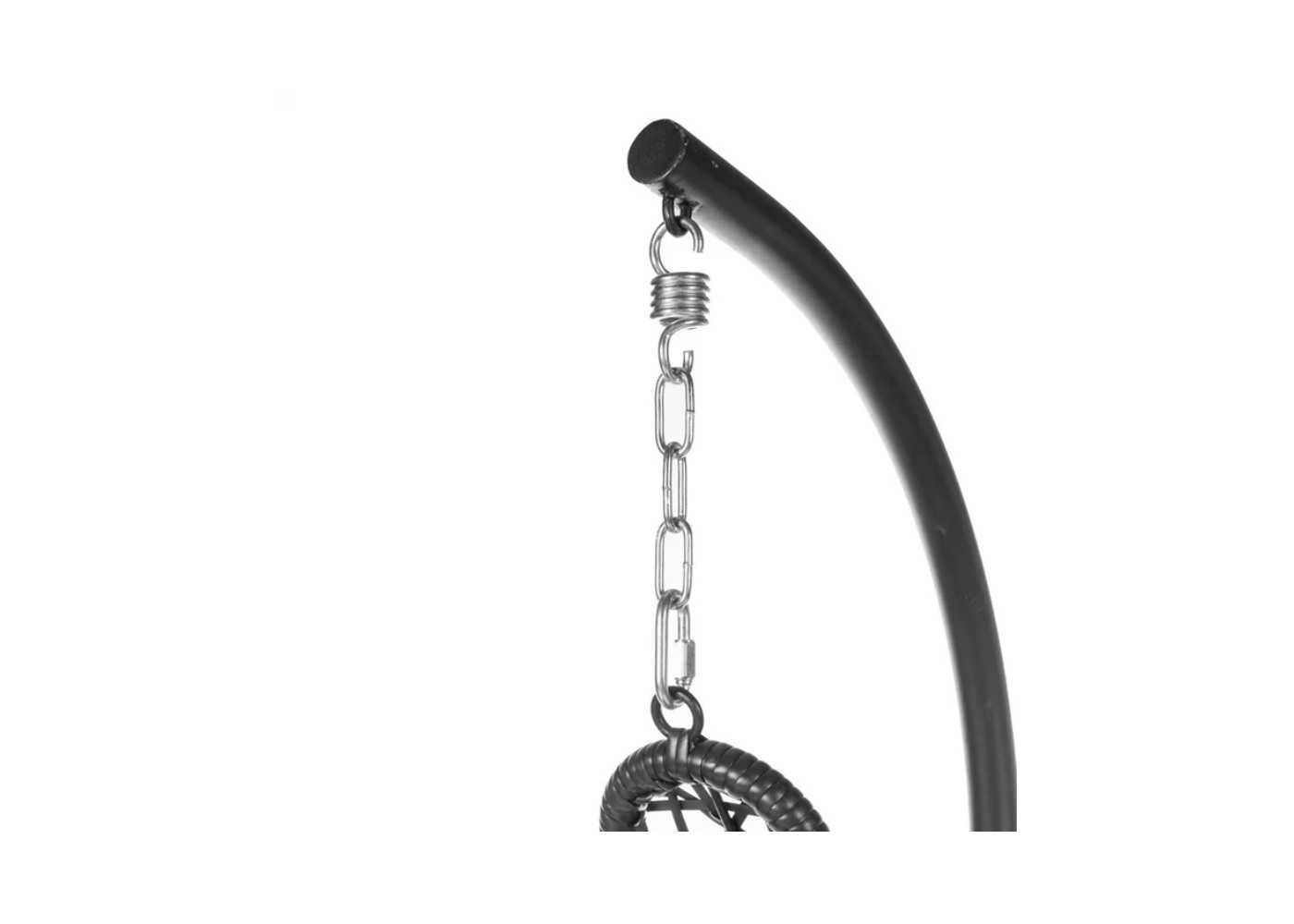 Modern outdoor hanging chair with steel mast. Black lacquered steel frame with woven PE synthetic rattan and 16 cm thick seat cushion.
