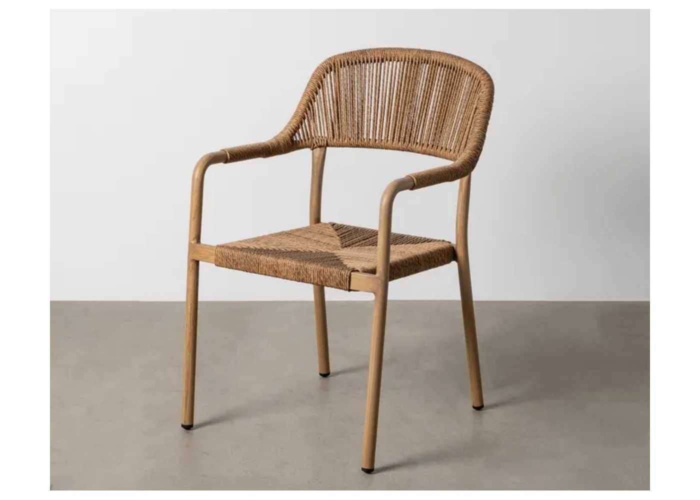 Stackable outdoor chair with armrests and aluminium frame.