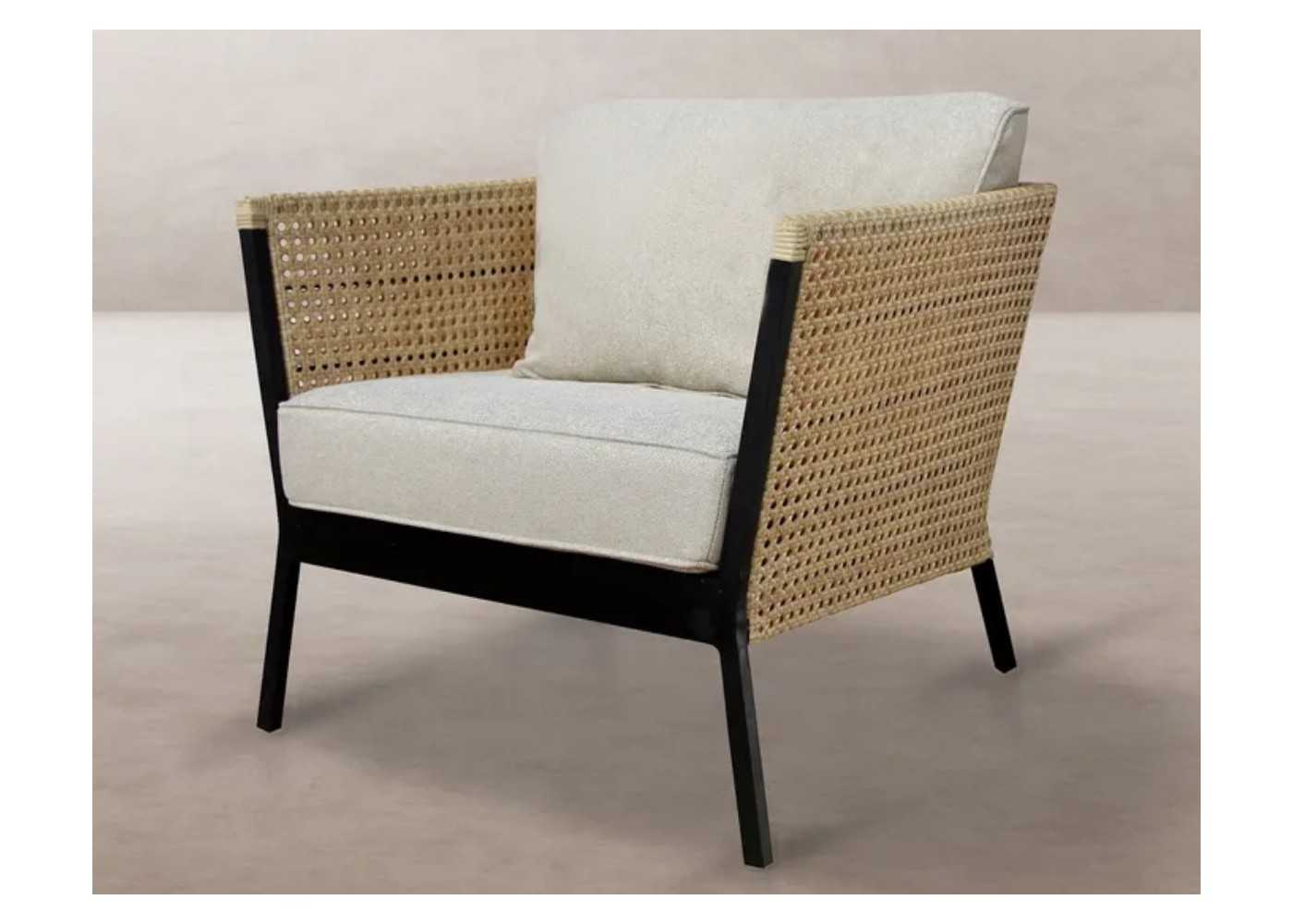 Outdoor armchair with black aluminium frame and synthetic PE rattan arms and backrest. Upholstered in cream-coloured outdoor fabric with removable cushions.