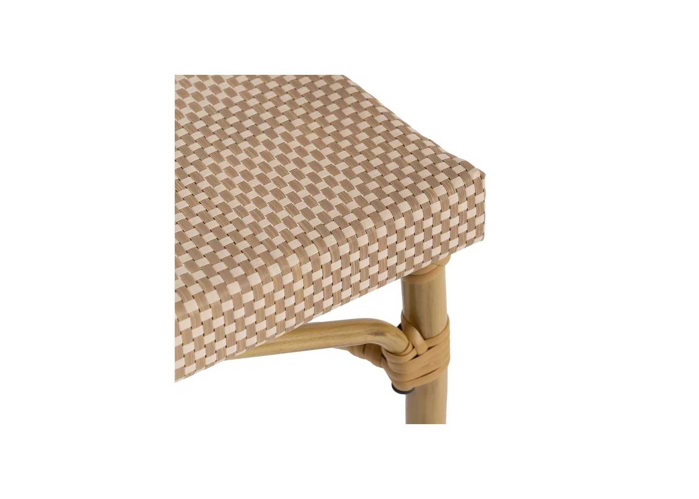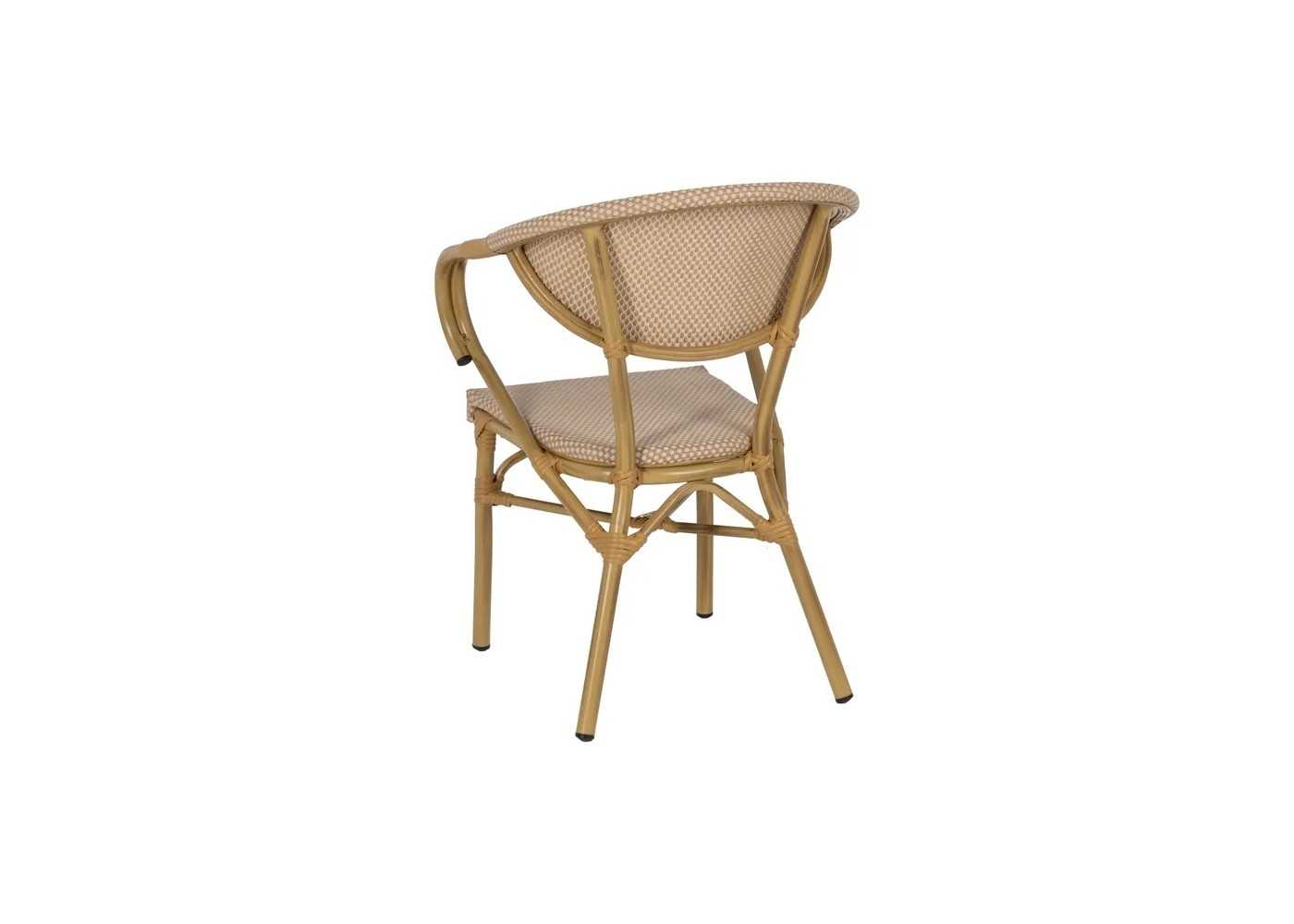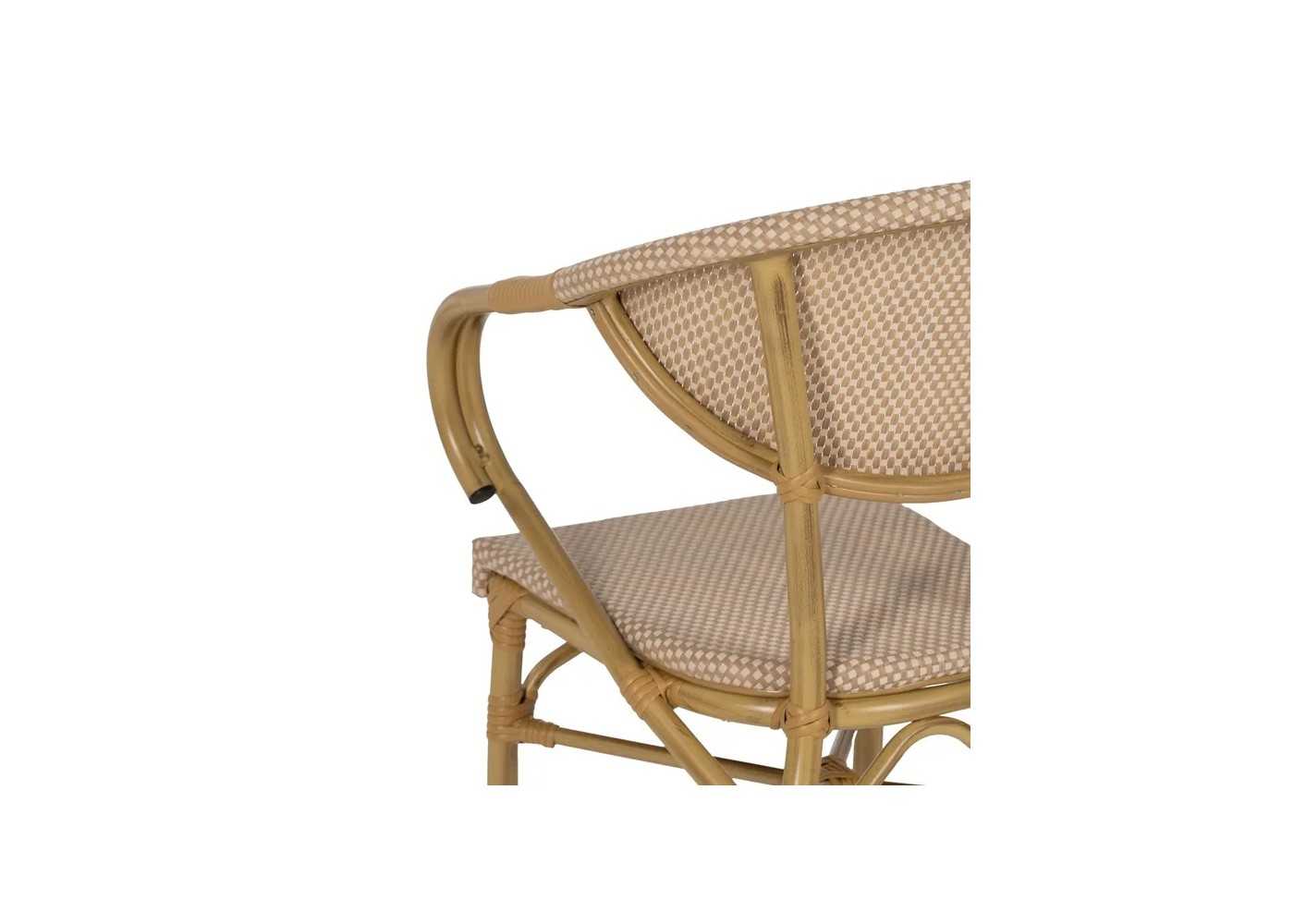 Original and comfortable outdoor chair with armrests made of aluminium simulating natural-coloured bamboo with synthetic rattan details.